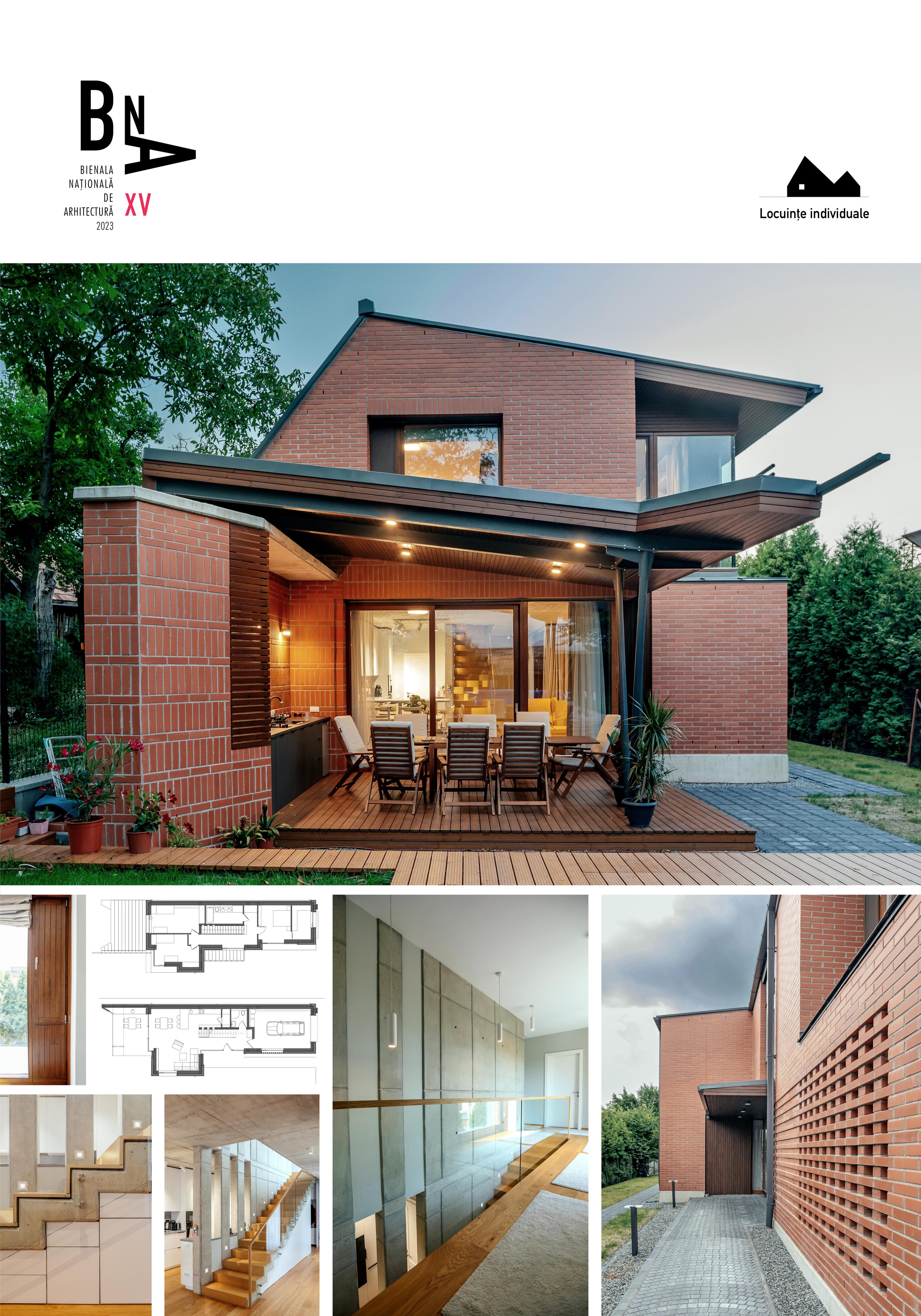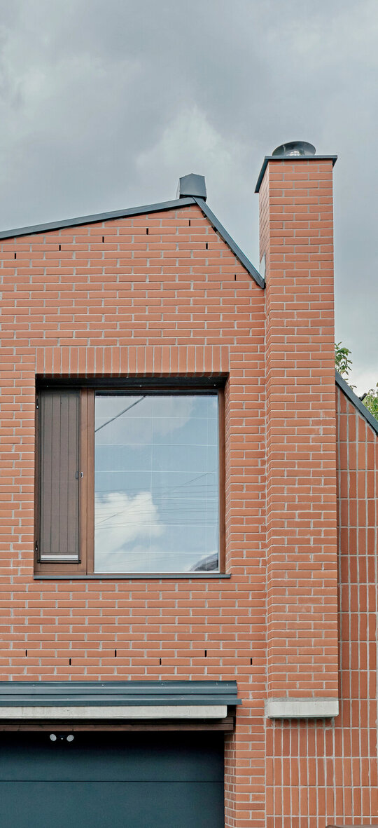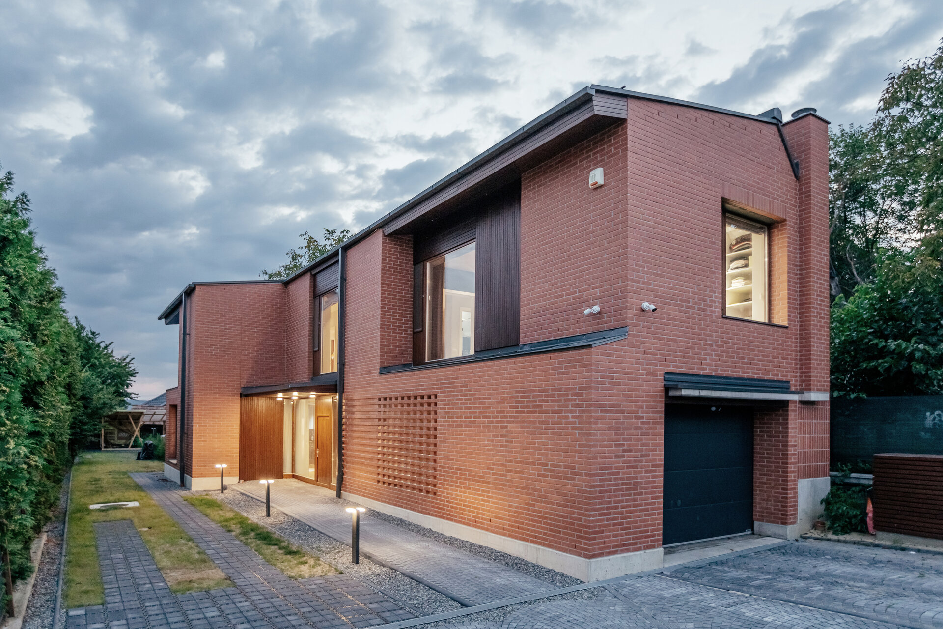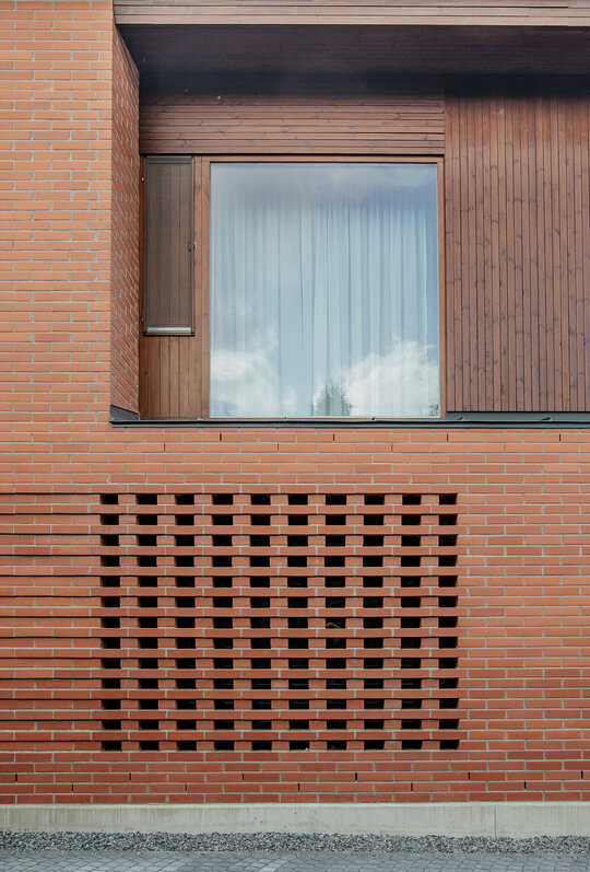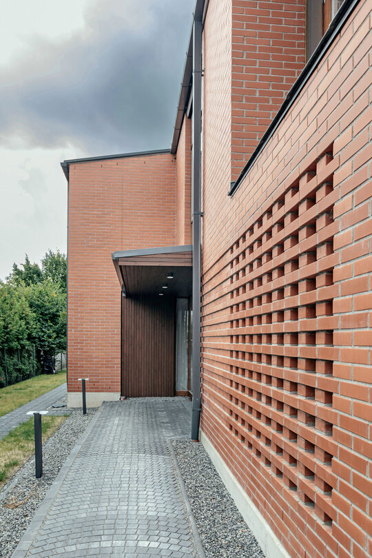 Blocuri simple de cărămidă roșie formează suprafețe de traforuri ce filtrează lumina, ori delimitează ferestrele ample sau placajele lemn, si, per ansamblu oferă acestei case un aspect "calm", o simplitate in design care individualizează această locuință in peisajul construit "gălăgios".
