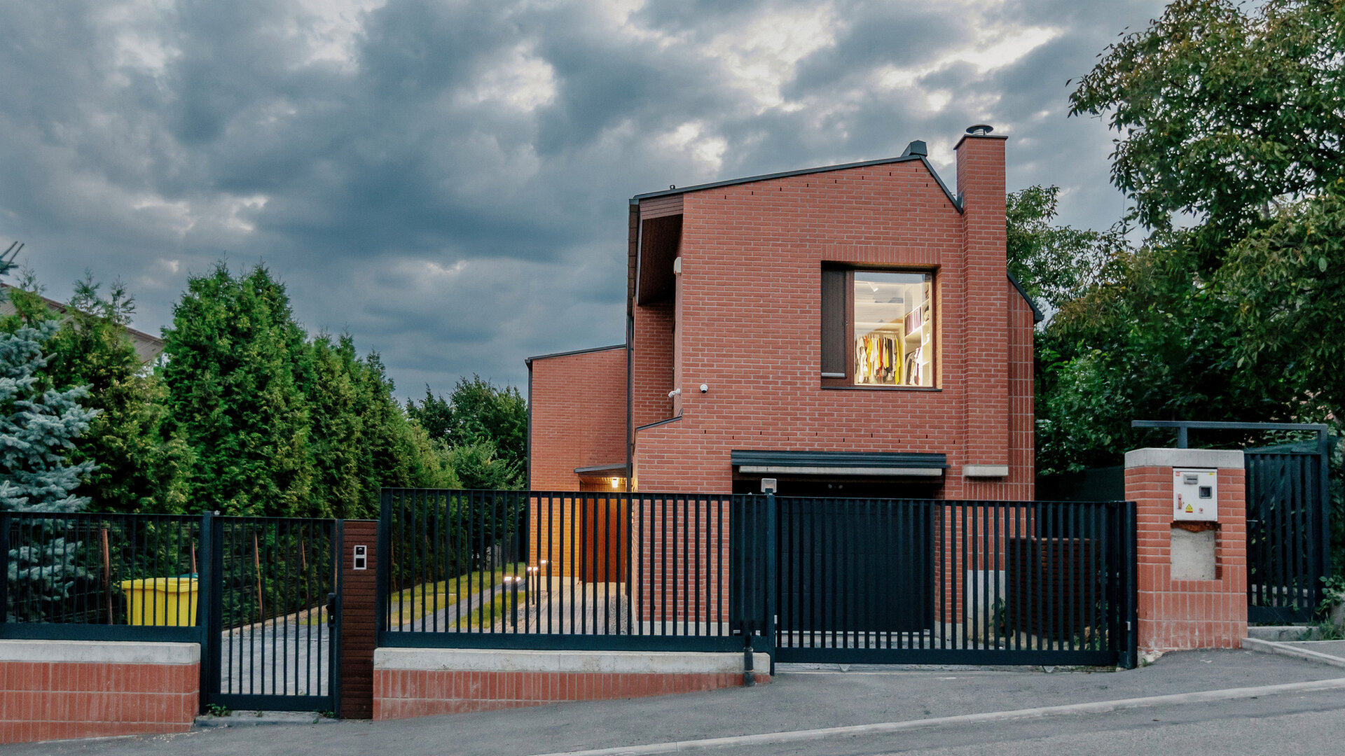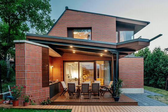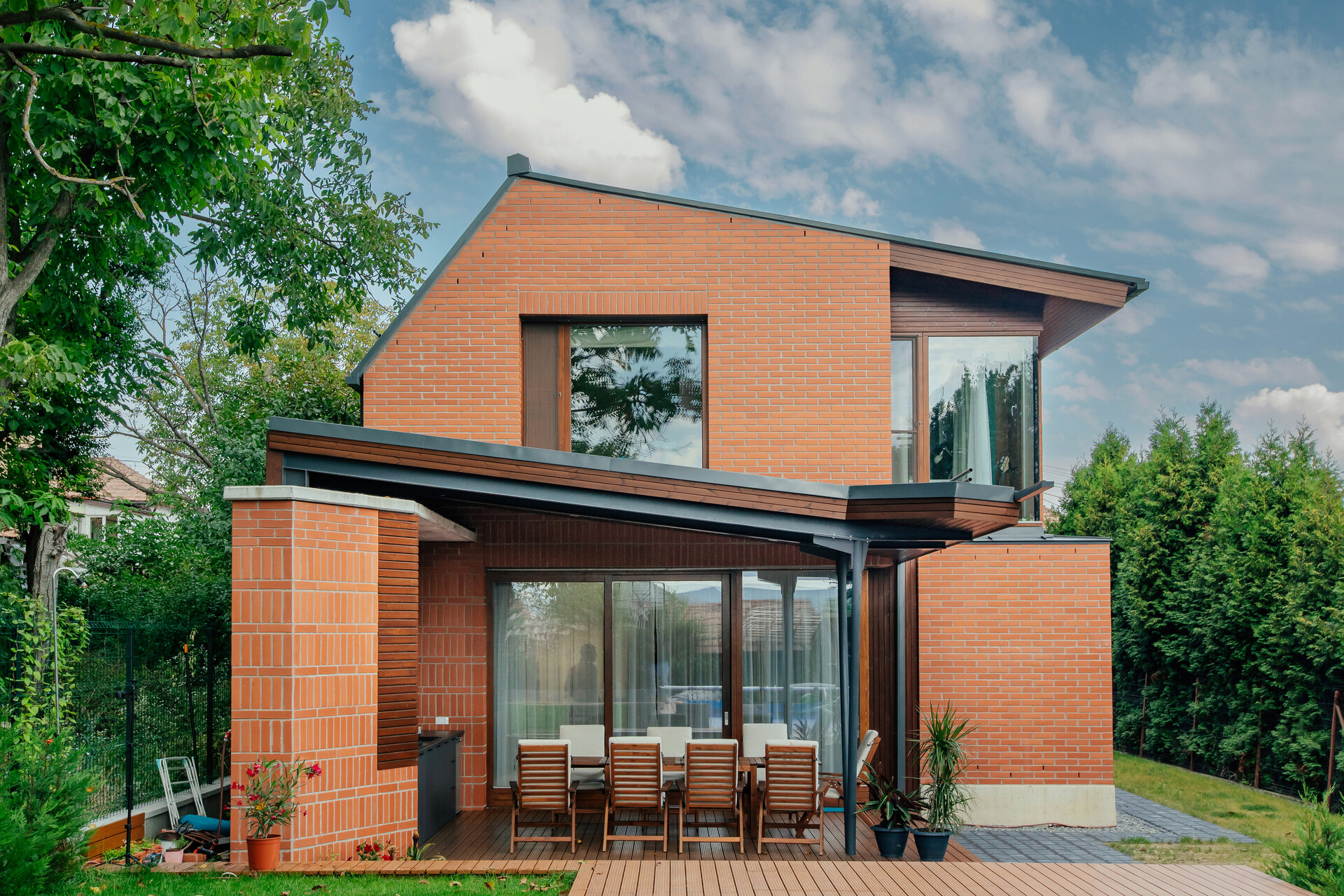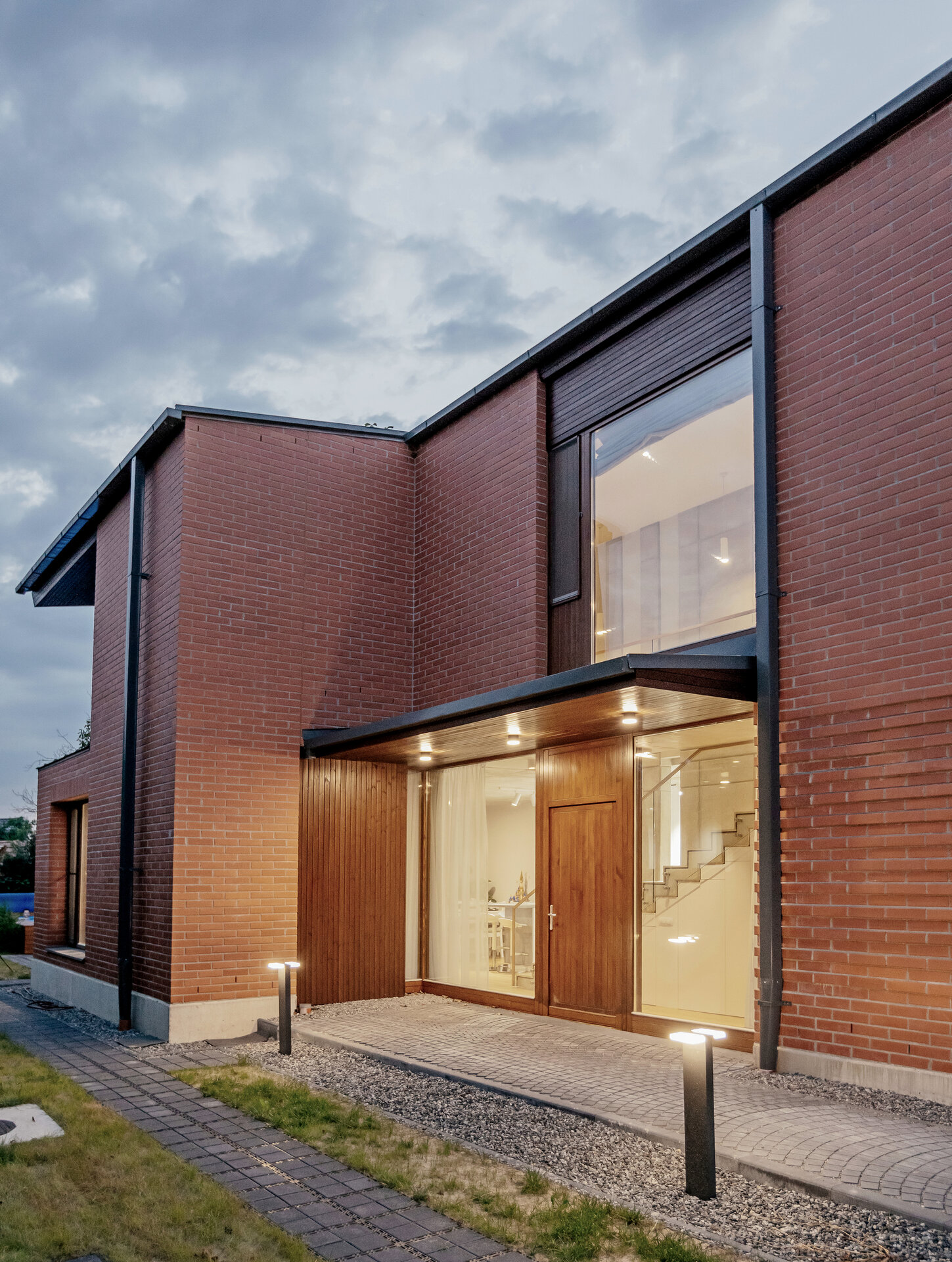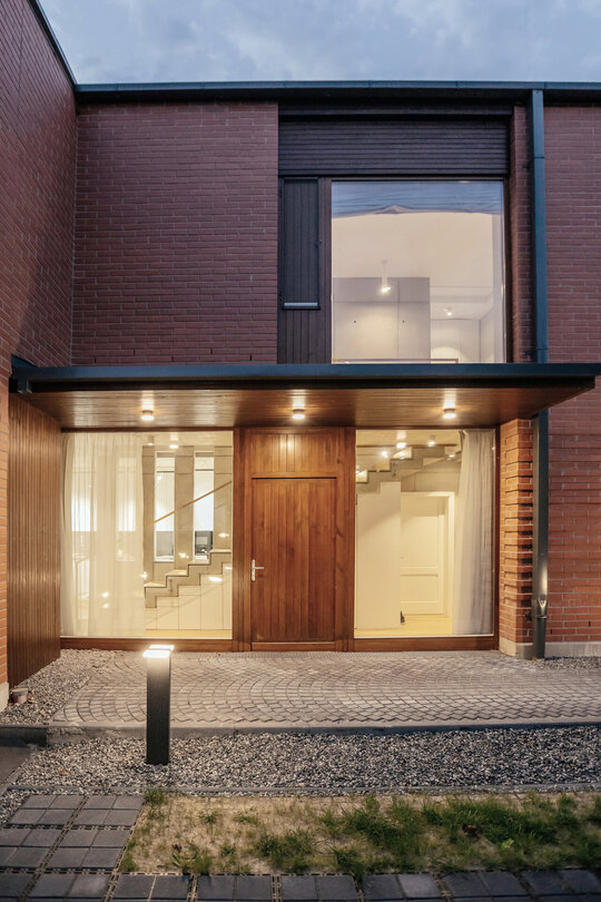 Blocuri simple de cărămidă roșie formează suprafețe de traforuri ce filtrează lumina, ori delimitează ferestrele ample sau placajele lemn, si, per ansamblu oferă acestei case un aspect "calm", o simplitate in design care individualizează această locuință in peisajul construit "gălăgios".