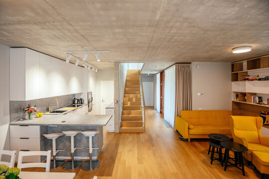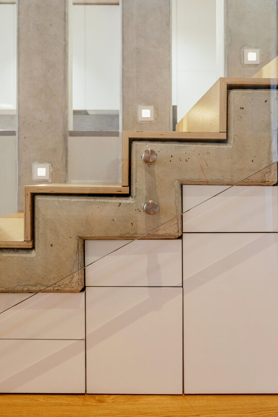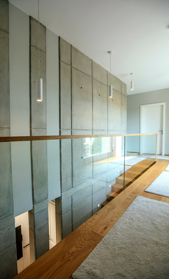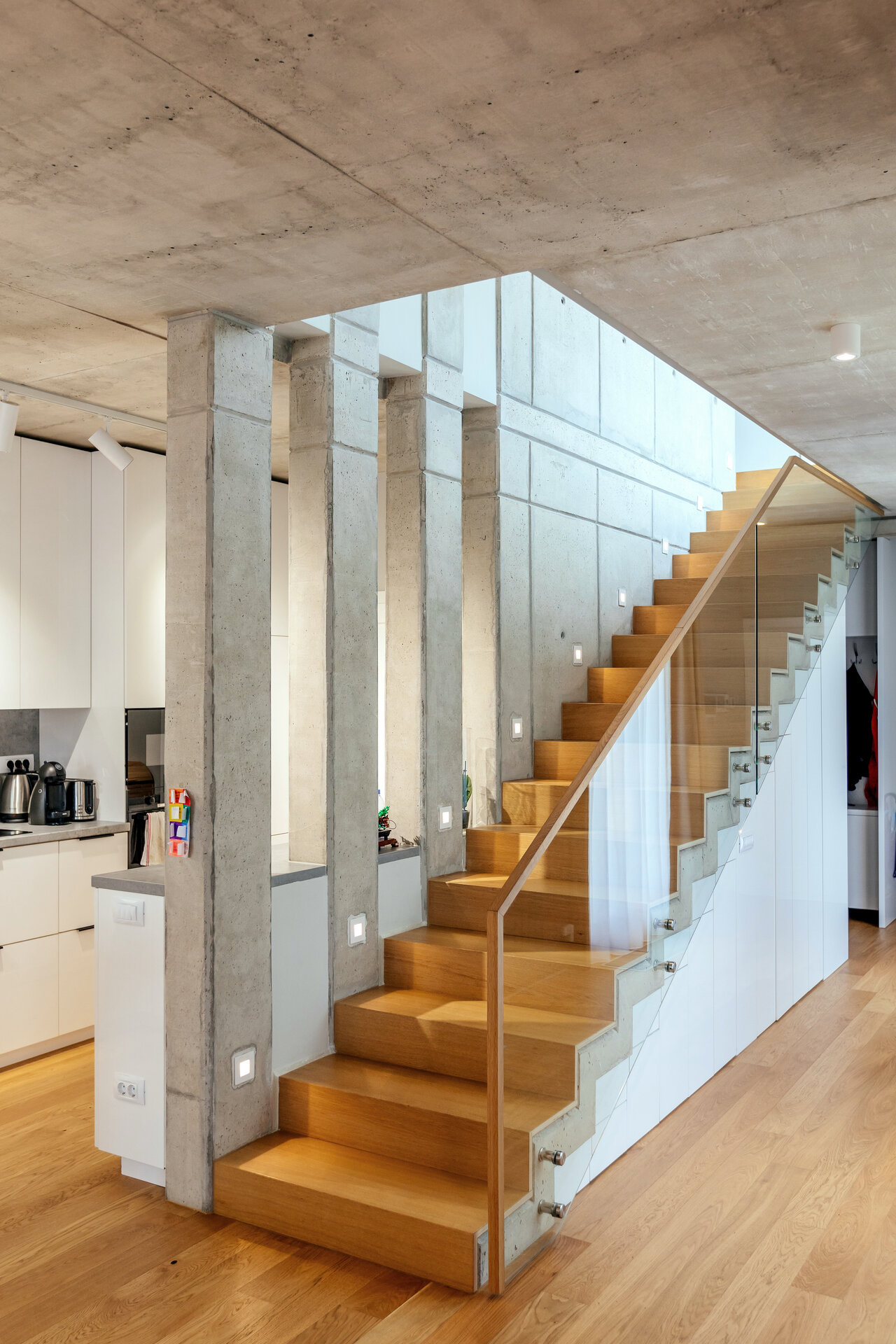 Așadar, un element important în compoziție este coloana vertebrală a casei: scara si peretele central conceput din beton aparent.