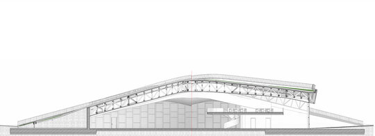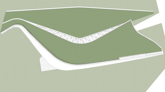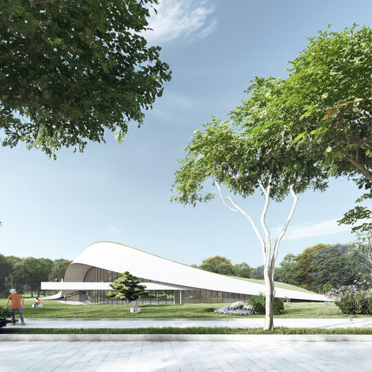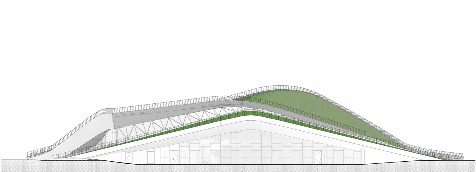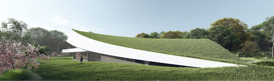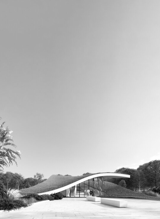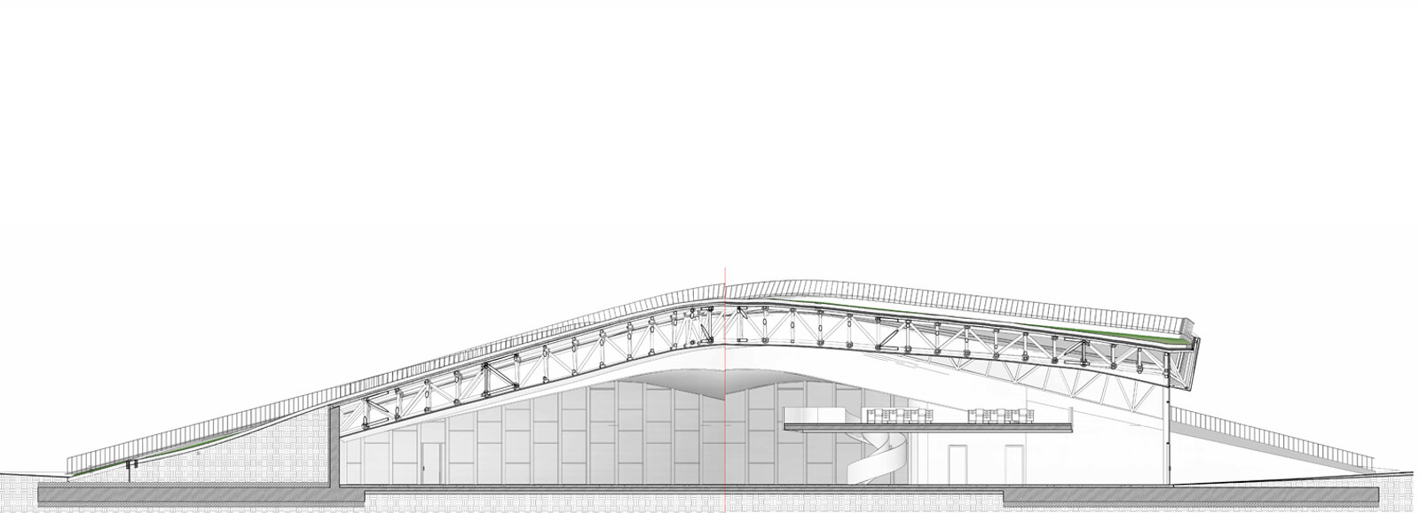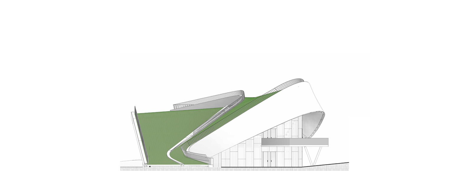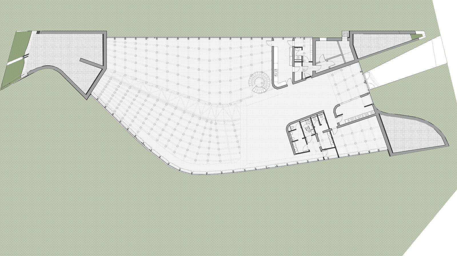 Ordinea inerentă parcului – traseele de alei și geometria sinuoasă a curbelor de nivel care descriu, în mod uzual, relieful unui loc – definesc, așadar, într-un mod cât se poate de direct, construcția/arhitectura pavilionului. Acoperirea care adăpostește sala principală a pavilionului este o suprapunere de două „falii geologice” artificiale care asigură continuitatea longitudinală a parcului. În același timp însă, ruptura discretă dintre pajiștea parcului și cele două „pliuri geografice” nou construite devine un prilej pentru asimilarea și încorporarea naturală a tuturor elementelor ce aparțin arhitecturii: fereastra-luminator este o fantă continuă dispusă median, iar fațadele sunt generate de discontinuitatea subtilă dintre suprafața continuă a parcului și proiectul propriu-zis. Sala principală a pavilionului este, așadar, o unică încăpere larg deschisă, care stă literalmente sub protecția parcului, subordonându-i-se acestuia, în vreme ce toate celelalte spații secundare/anexe se așează de o parte și de alta a ei.