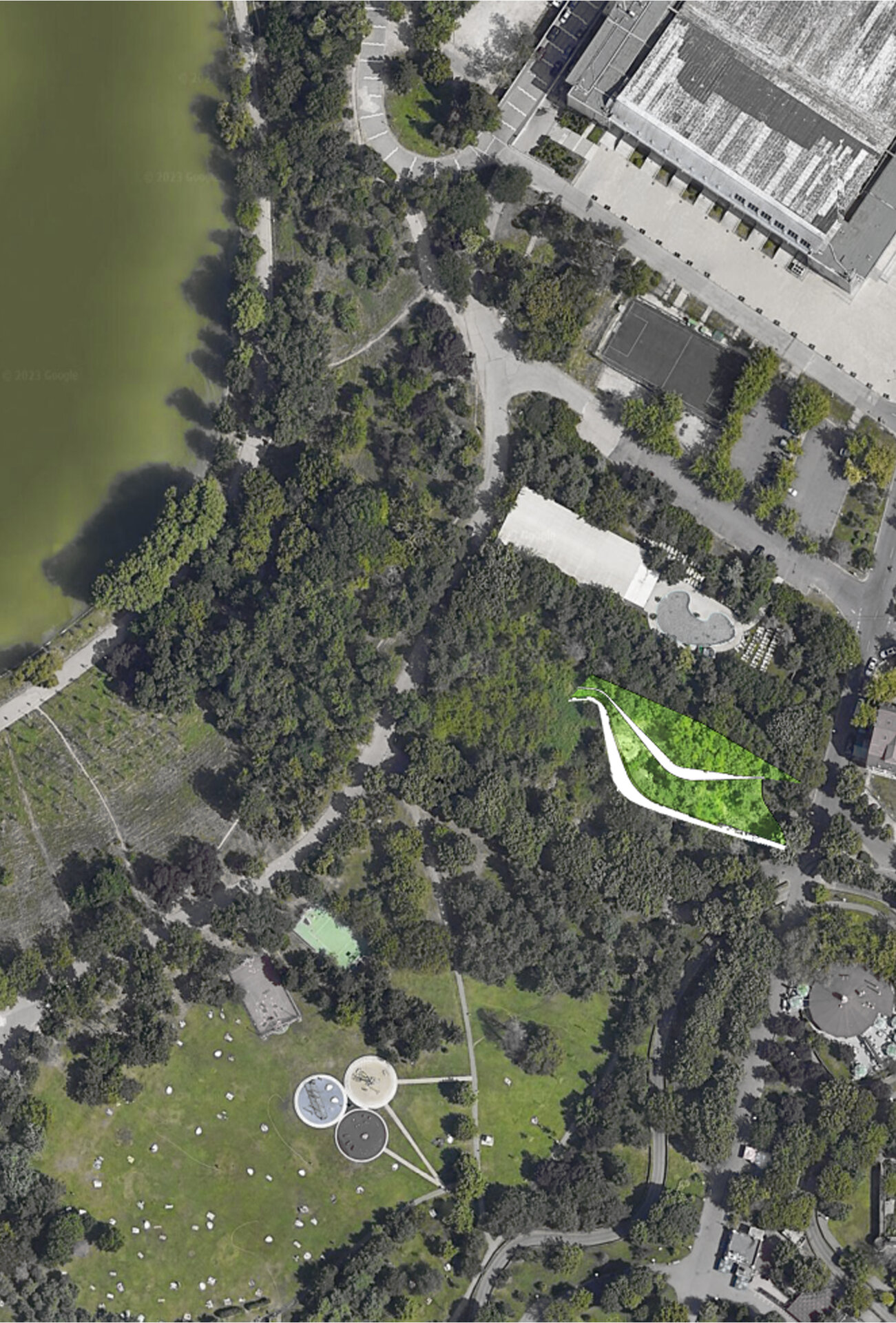 Tocmai în ideea recuperării acestei consistențe și a unei firești omogenități a pavilionului cu naturalismul parcului – nu doar în sensul autorității ecologice a unui cadru natural anonimizat adesea sub denumirea generică de „spațiu verde”, ci chiar în sensul lui fundamental de a fi, geografic/geologic – construcția trece într-un plan secund, potențând parcul într-o manieră aproape stratigrafică/tectonică și scufundându-și orice fel de capricii estetice/funcționale dedesubtul unei noi topografii.