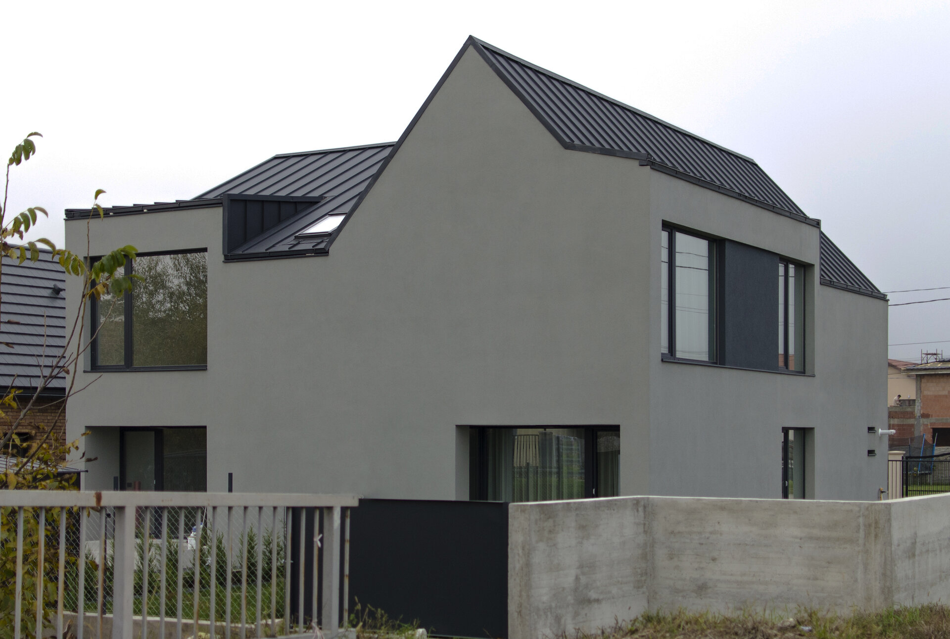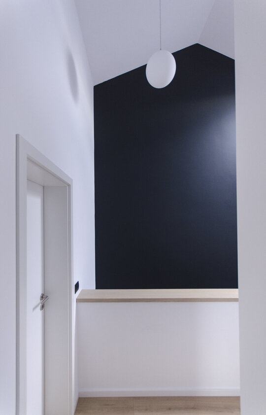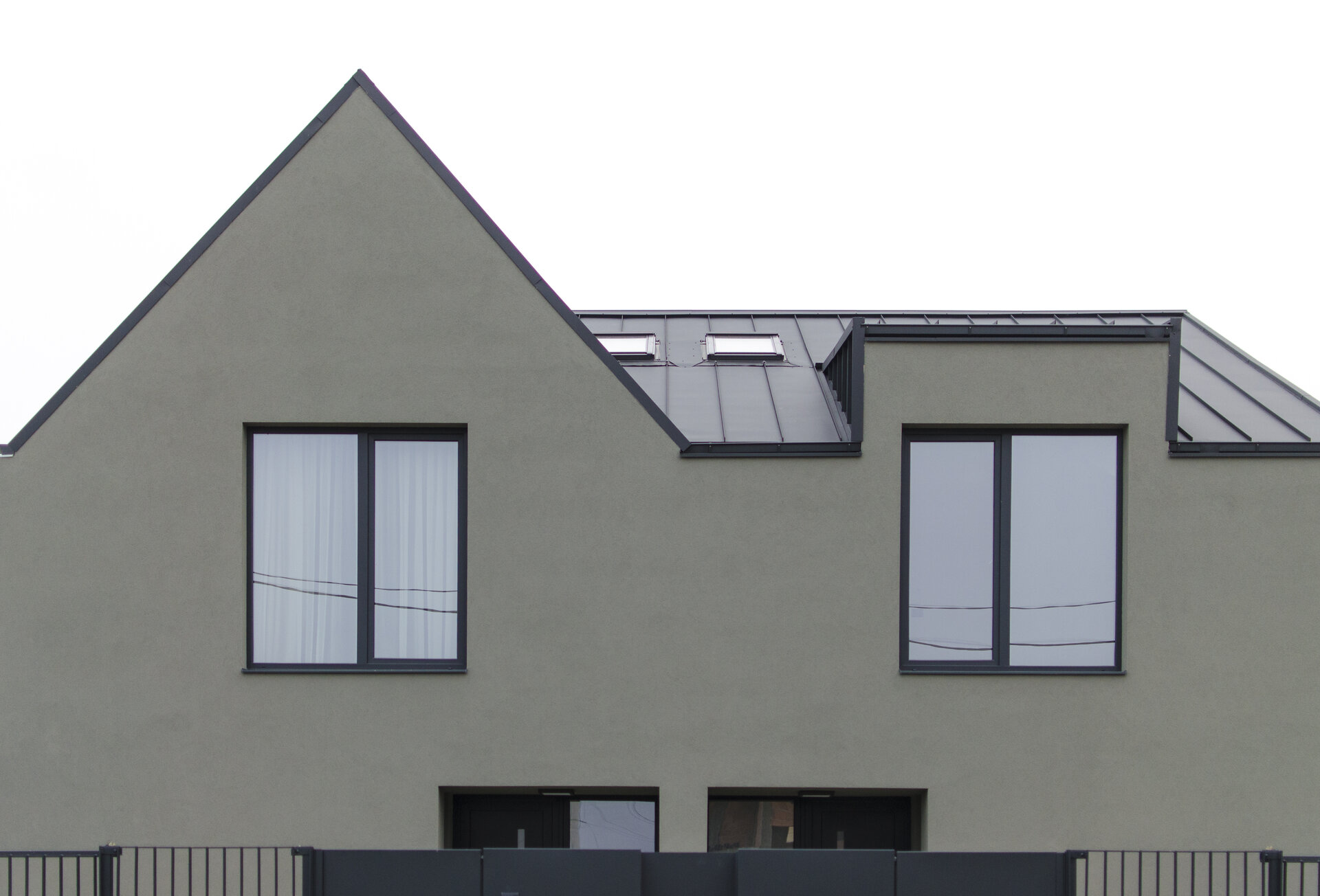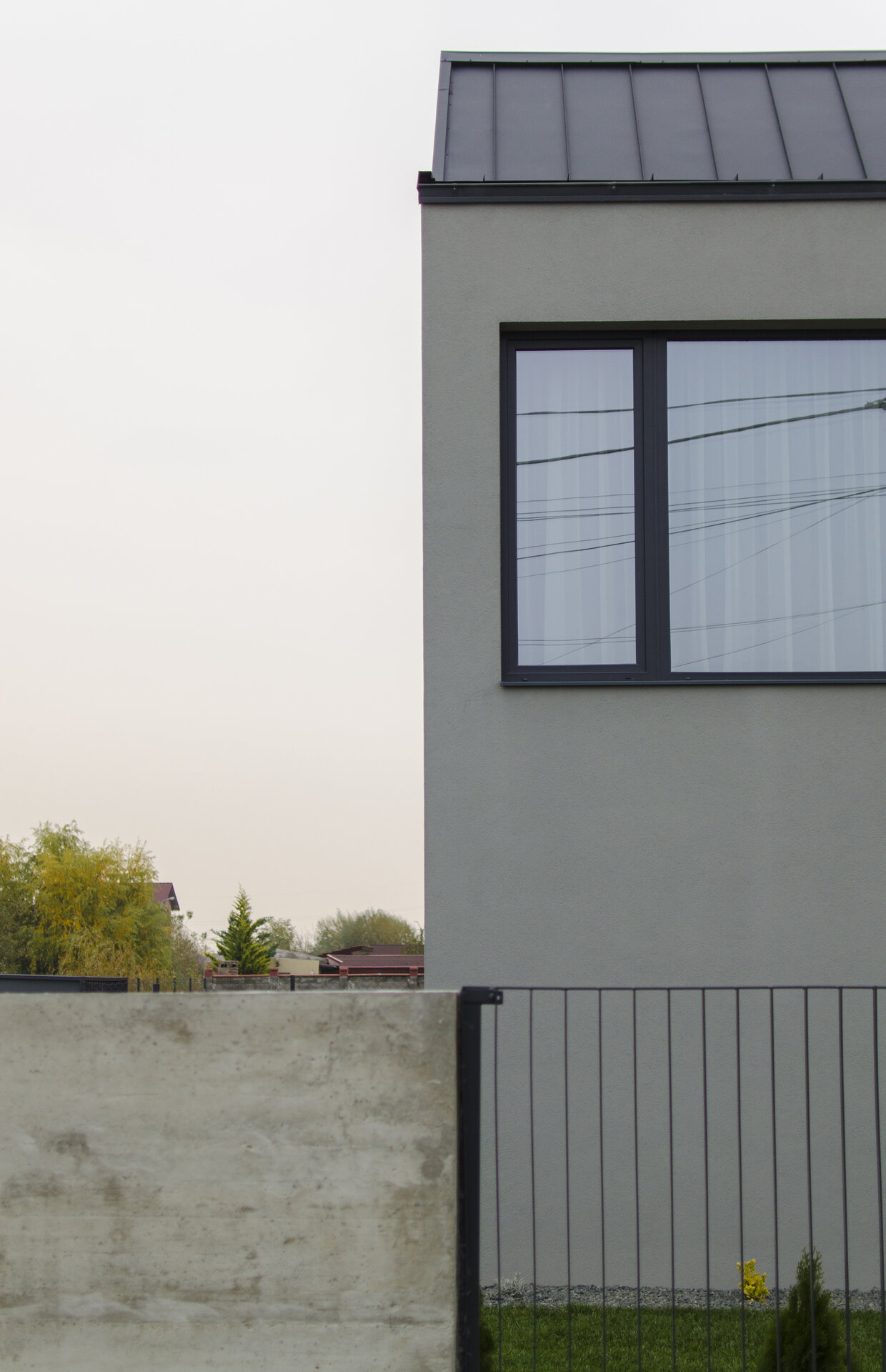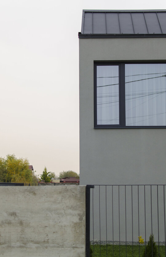 Acoperișul, ca element central al conceptului, nu îndeplinește doar funcția de a crea o conexiune vizuală cu mediul înconjurător și de a ascunde simetria funcțională, ci are un rol activ în conturarea și organizarea spațiului interior al etajului. În contrast cu nuanțele cenușii ale fațadei, interiorul se manifestă prin intermediul unei palete predominante de alb, iluminată de accente subtile de culoare care evidențiază zonele speciale ale locuințelor. Scopul nostru a fost să obținem o imagine simplă, dar evocatoare, care să sublinieze volumetria atât în exterior, cât și în interiorul clădirilor. Culoarea neutră a fațadelor a fost alesă cu atenție pentru a crea un fundal liniștit pentru activitățile zilnice și pentru a integra elementele naturale din grădină. Acoperișul din tablă fălțuită contribuie la personalitatea distinctă a clădirilor, îmbrăcându-le cu eleganță și adaptându-se cu grație la formele lor unice.