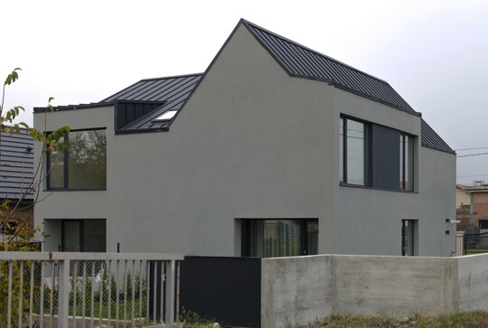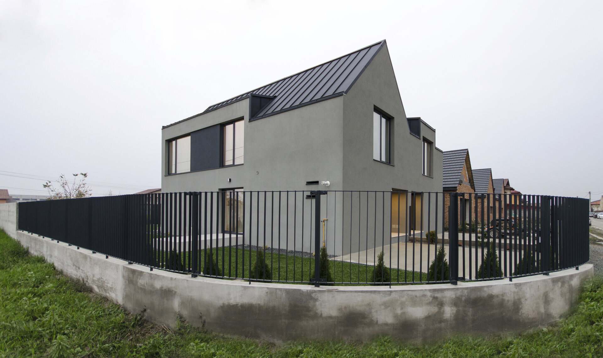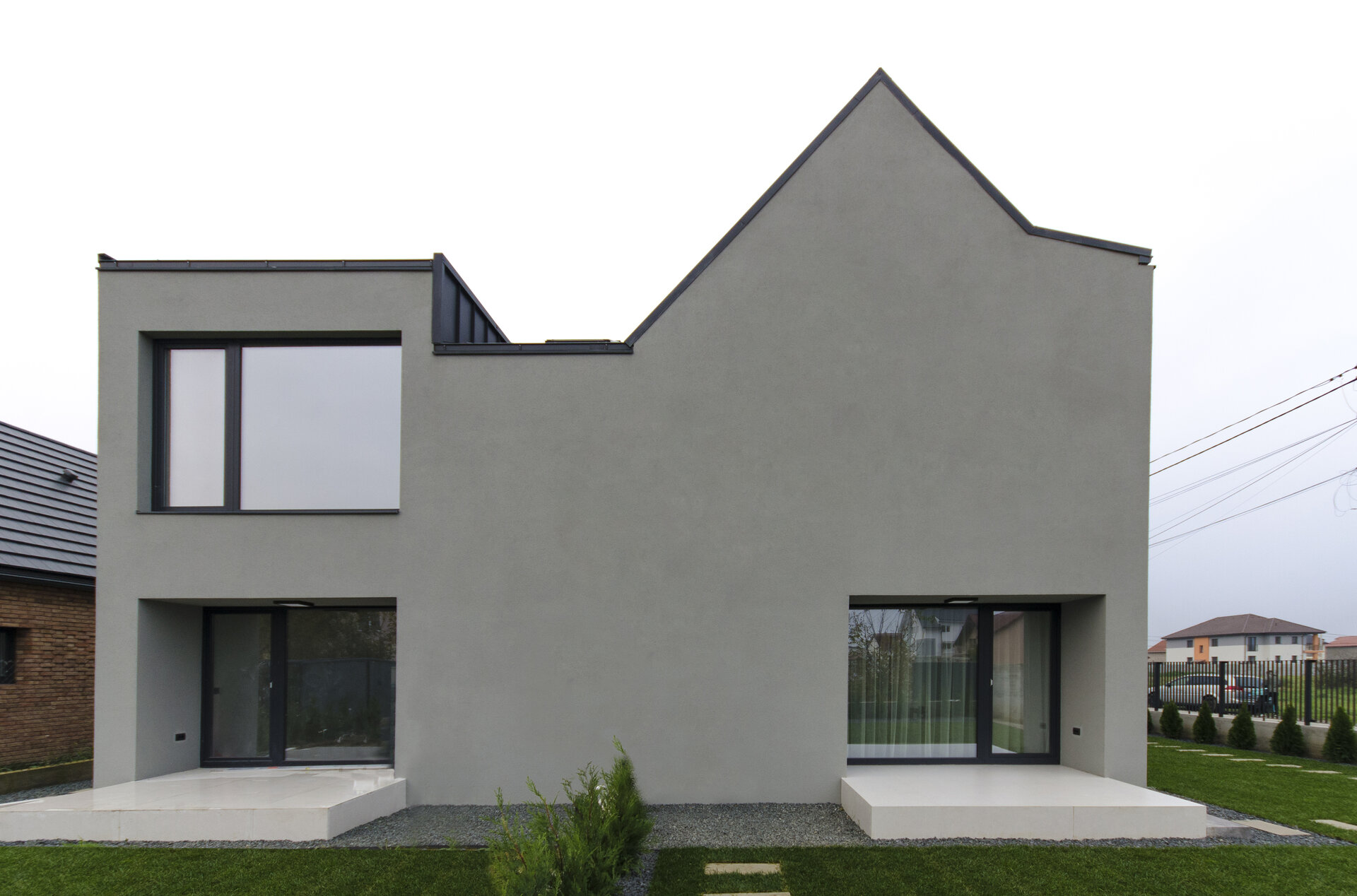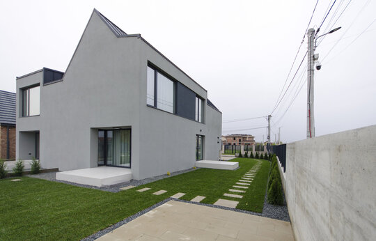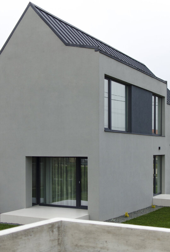 Prin urmare, am proiectat aceste clădiri care, la o primă vedere, nu revelează simetria funcțională interioară. În plus față de aceasta, casa aflată la colt beneficiază de deschideri suplimentare și o terasă, elemente care nu numai că o completează, ci și conferă unicitate volumului în cadrul ansamblului arhitectural.