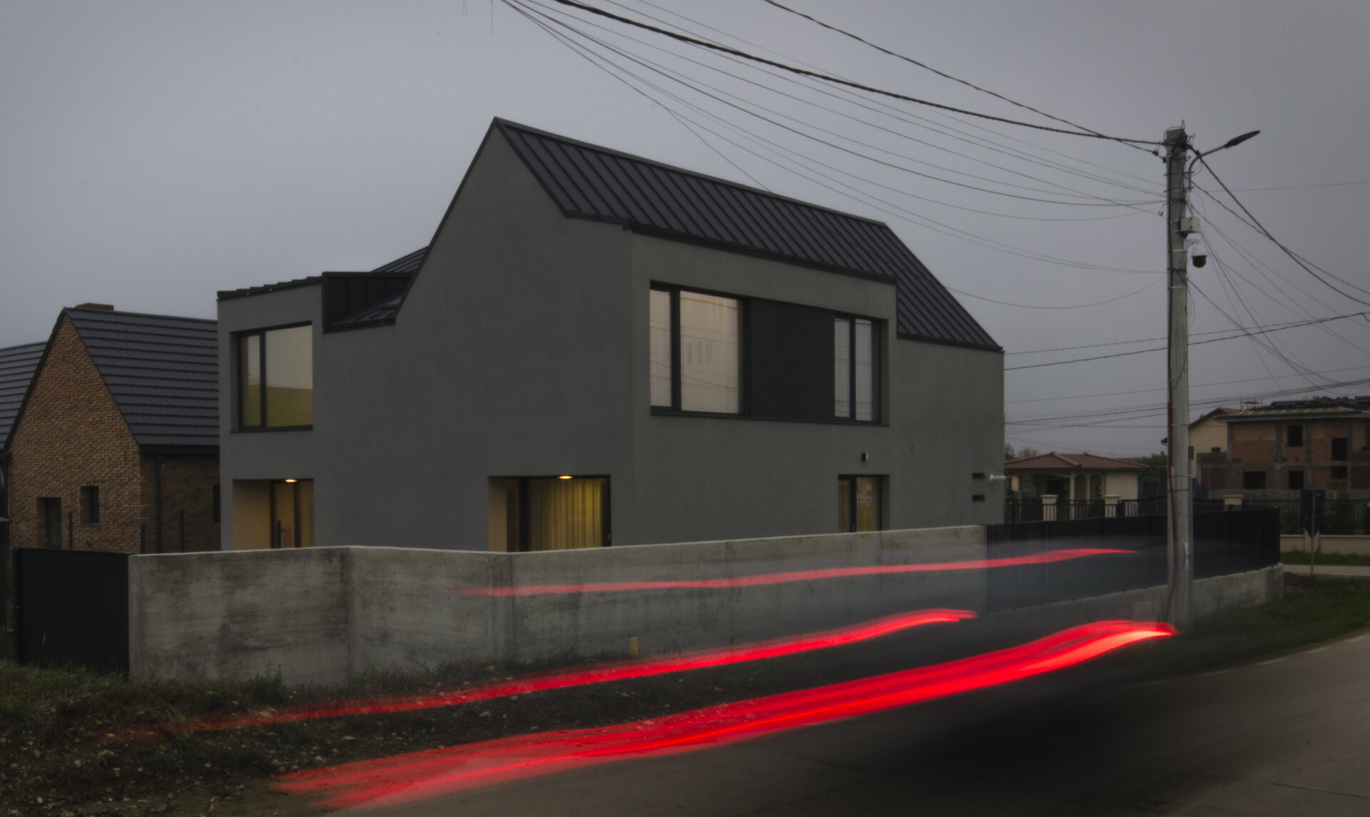 Amplasarea atentă a locuinței pe un teren situat la capătul unei străzi conferă o perspectivă unică către unul dintre canalele distincte care conferă orașului Timișoara farmecul său aparte. În proximitate, atrage atenția o casă parter construită din cărămidă, care reinterpretează trăsăturile tradiționale ale locuințelor într-o manieră contemporană și inspirată, adăugând o notă dinamică prin intermediul unei volumetrii jucăușe și a unui acoperiș cu înclinare accentuată, elemente semnificative și caracteristice.