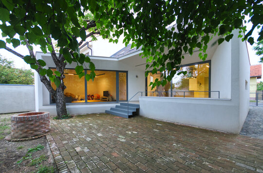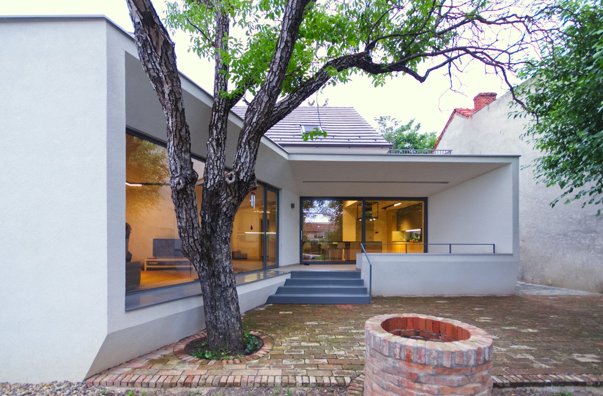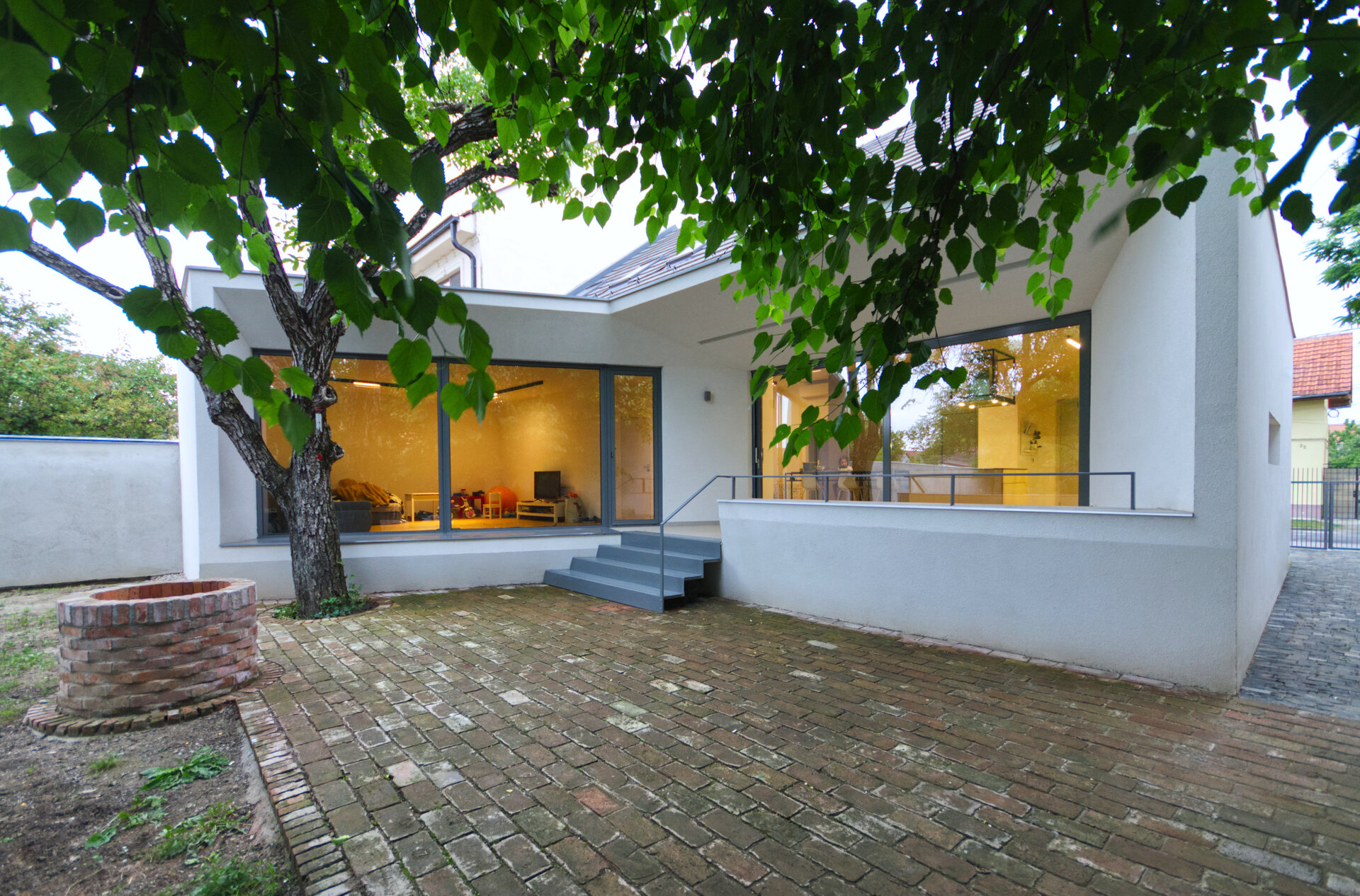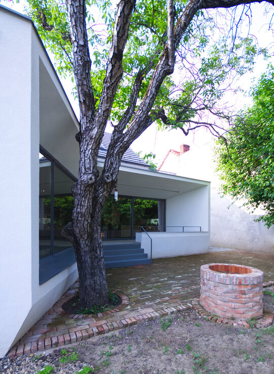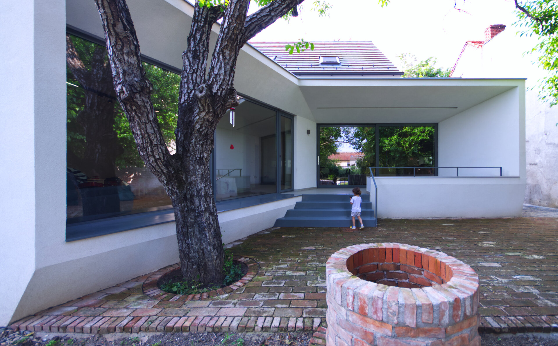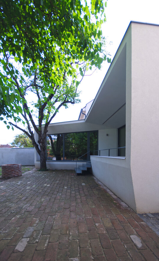 Volumul acestei extinderi este astfel conceput încât să protejeze un copac existent in curte, pe care noi l-am considerat important în definirea spațiului curții exterioare. Intreaga suprafata din imediata apropiere a noului corp este pavată cu cărămida și este organizată în jurul copacului și a unei mici fântâni. Aceasta este plasată la limita dintre curte si gradină, dintre spațiul mineral si vegetație. Volumul nou se deschide cu o larga vitrina spre aceste elemente ale curtii.