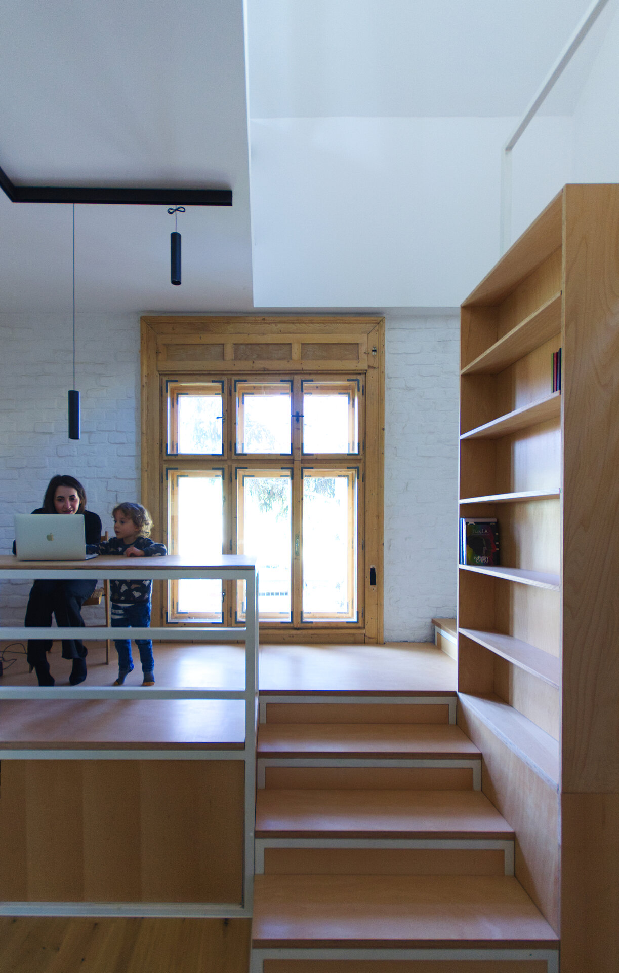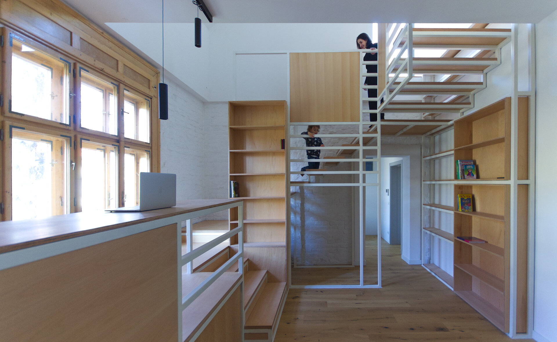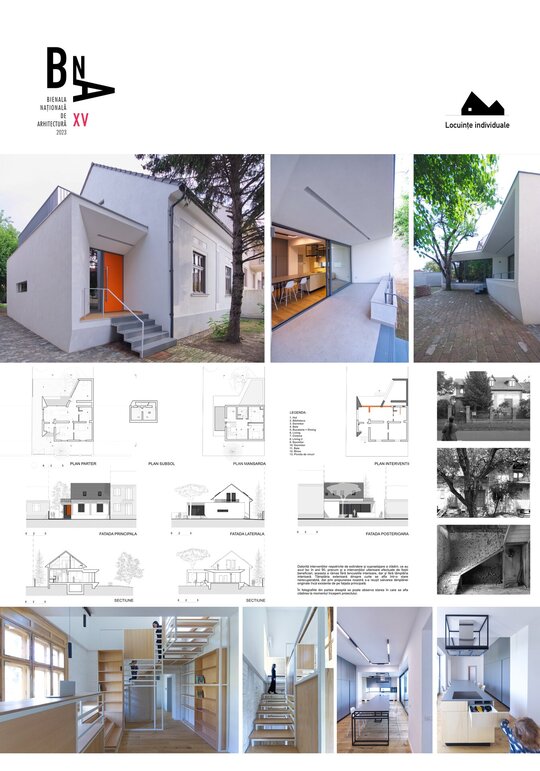 În ceea ce privește amenajarea interioară, parterul clădirii găzduiește diverse spații funcționale, inclusiv bucătăria, cu un spațiu pentru luat masa, un dormitor cu baie privată și o bibliotecă, unde o nouă scară propusă duce spre mansardă. Scara devine o biblioateca pe verticala , realizata dintr-o structura metalica alba, usoara, si elemente de placaj stratificata de fag ce formeaza atat treptele pe cat si suportul pentru carti. În mansardă, am creat două dormitoare, o baie, un birou și un spațiu deschis care poate fi folosit ca living secundar. Alegerea de a pune în valoare spațiile printr-un design modern și utilizarea strategică a gamei de culori contribuie la crearea unei atmosfere primitoare și atractive.