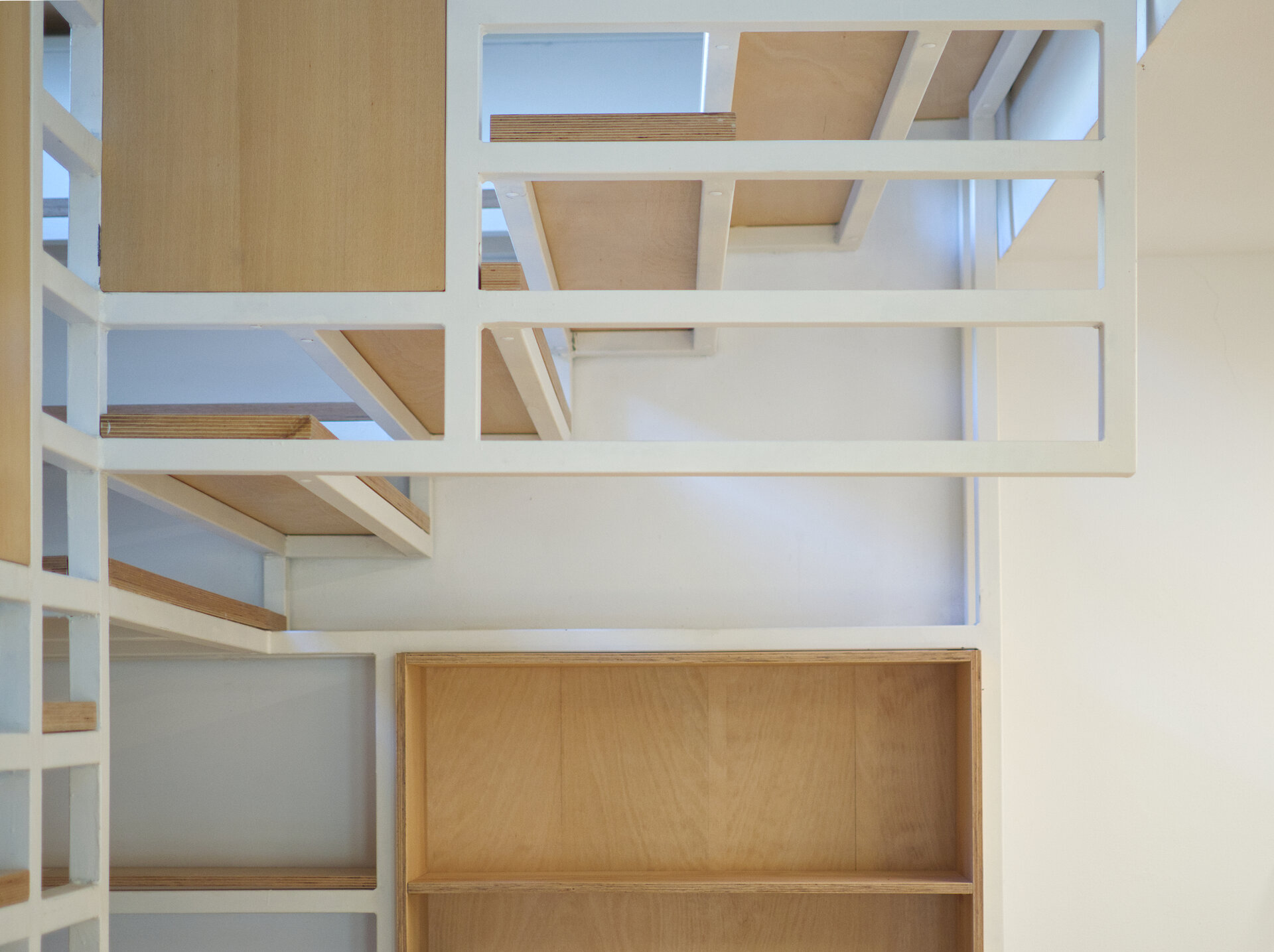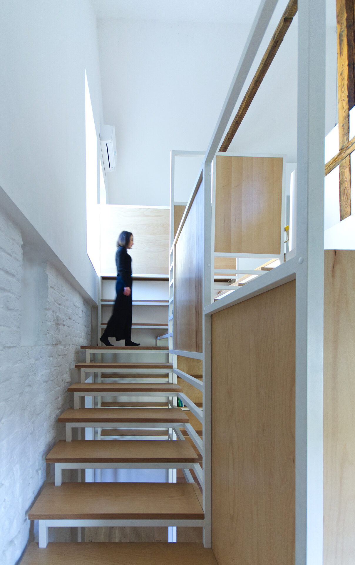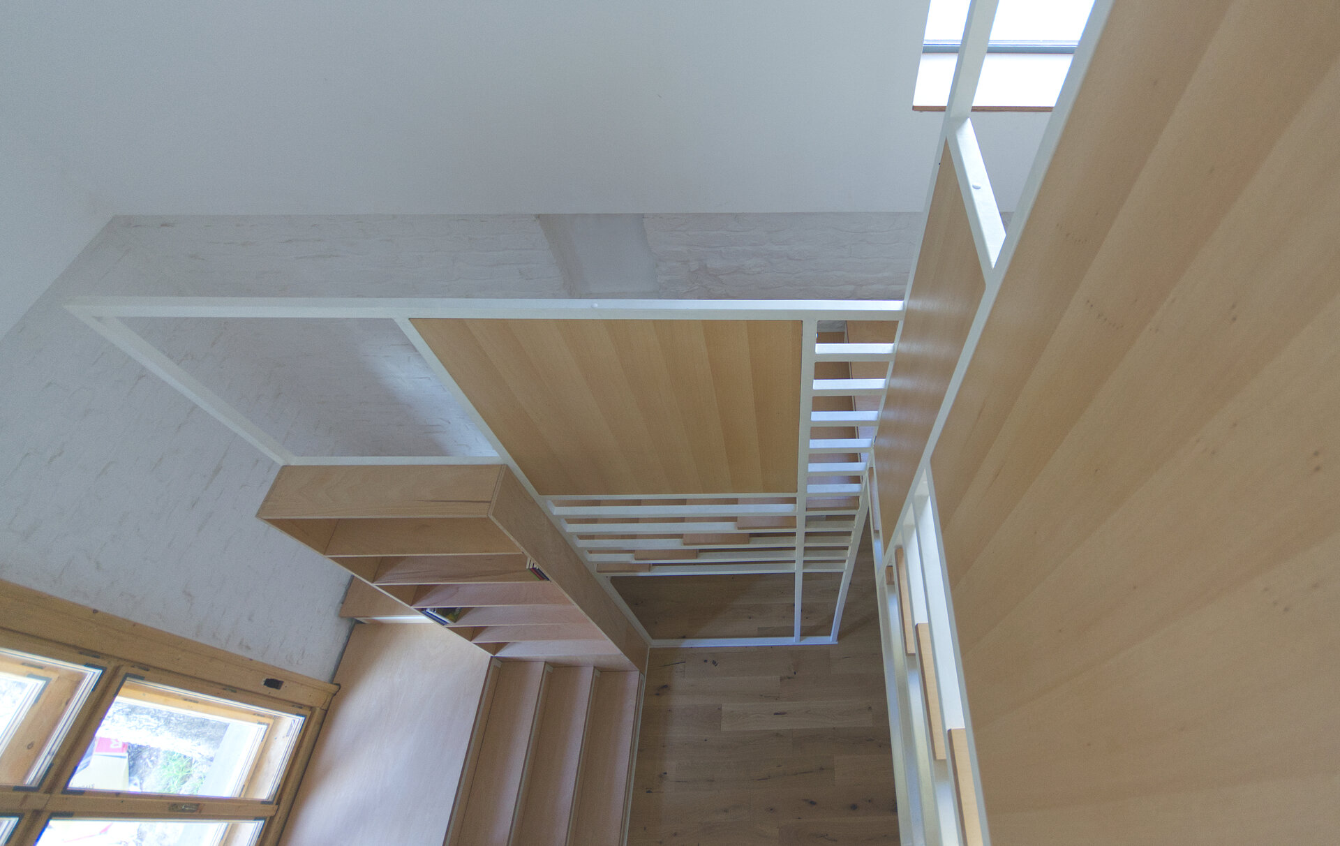 În ceea ce privește amenajarea interioară, parterul clădirii găzduiește diverse spații funcționale, inclusiv bucătăria, cu un spațiu pentru luat masa, un dormitor cu baie privată și o bibliotecă, unde o nouă scară propusă duce spre mansardă. Scara devine o biblioateca pe verticala , realizata dintr-o structura metalica alba, usoara, si elemente de placaj stratificata de fag ce formeaza atat treptele pe cat si suportul pentru carti. În mansardă, am creat două dormitoare, o baie, un birou și un spațiu deschis care poate fi folosit ca living secundar. Alegerea de a pune în valoare spațiile printr-un design modern și utilizarea strategică a gamei de culori contribuie la crearea unei atmosfere primitoare și atractive.