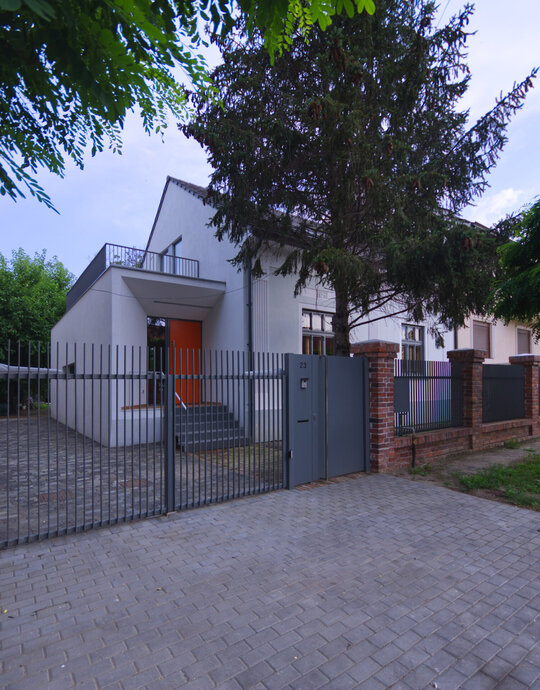 Prin extinderea casei, am creat un nou element de acces către clădire, poziționat strategic spre stradă, și am adăugat un volum nou care găzduiește o zonă de zi complet nouă, precum și o scară ce conduce către subsol și o mansardă spațioasă. Acest nou element de acces, alipit de clădirea existentă pe latura sa stângă, prezintă o estetică sinceră și contemporană, astfel încât să fie perceput ca o adiție nouă și utilitară, definind totodată fațada stradală într-un mod inovator.