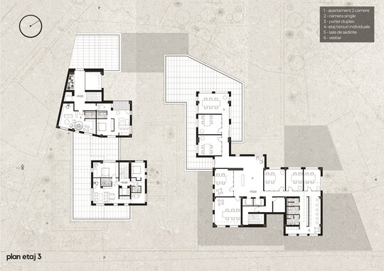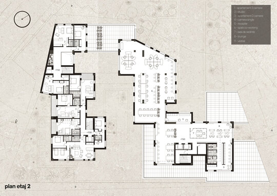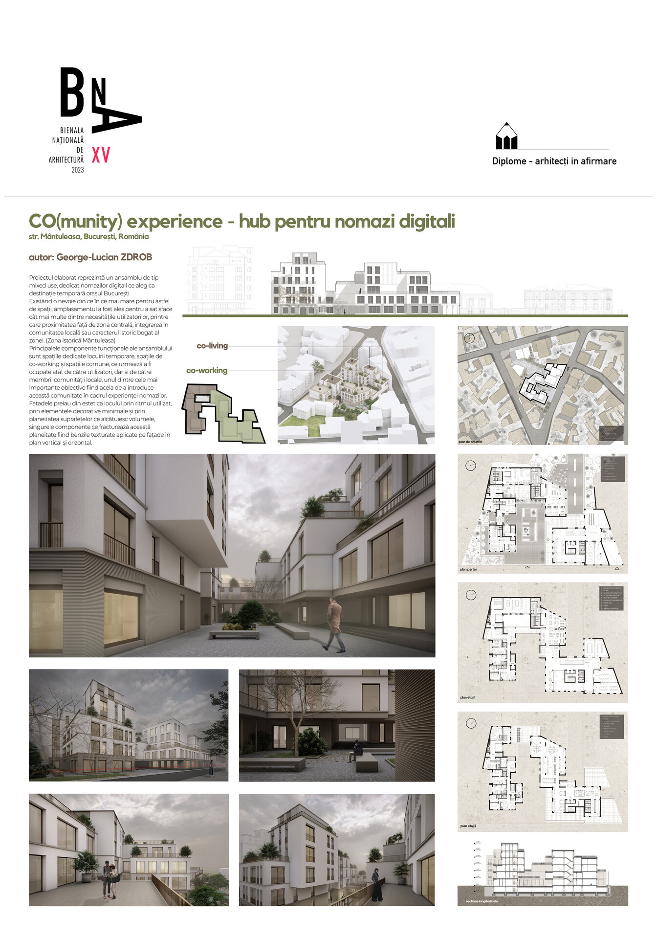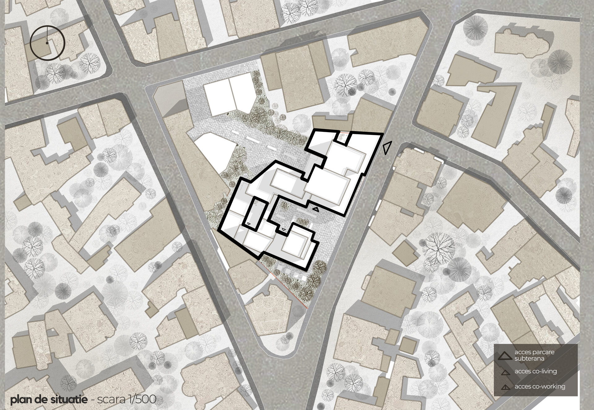 Soluția propusă este o clădire sau un ansamblu de clădiri de tip mixed - use care vor îndeplini toate cerințele specifice acestui tip de nomad și anume: componenta ce cuprinde locuirea (co - living), componenta tipică muncii (co - working) și cea care va îndeplini aspecte legate de loisir. Acest proiect va fi benefic atât pentru utilizatori, cât și pentru comunitatea locală, scopul principal fiind acela de a o integra prin plurivalența spaților comune. În urma studiului realizat asupra comportamentului nomazilor digitali am ajuns la concluzia că proiectul ar trebui amplasat într-o zonă semi-centrală, cu acces facil la principalele utilități ale orașului, tocmai pentru a-i face pe utilizatori să se integreze în cadrul comunității locale, scopul final fiind acela de a atrage tineri ce vor contribui la dezvoltarea orașului, din punct de vedere economic, social, dar și cultural.