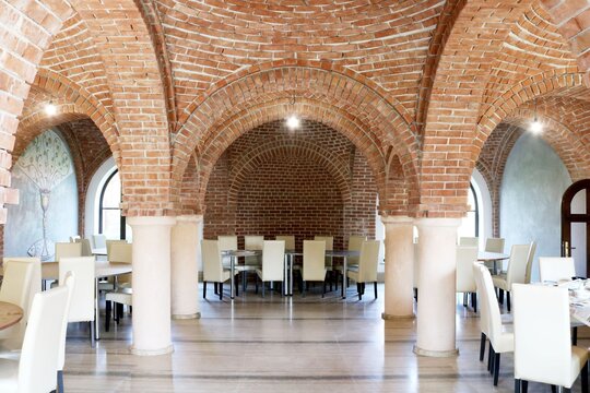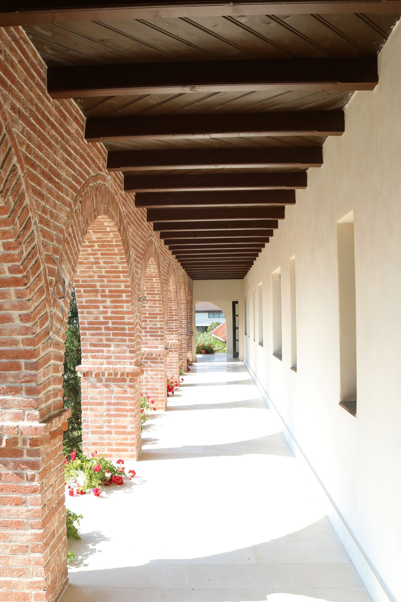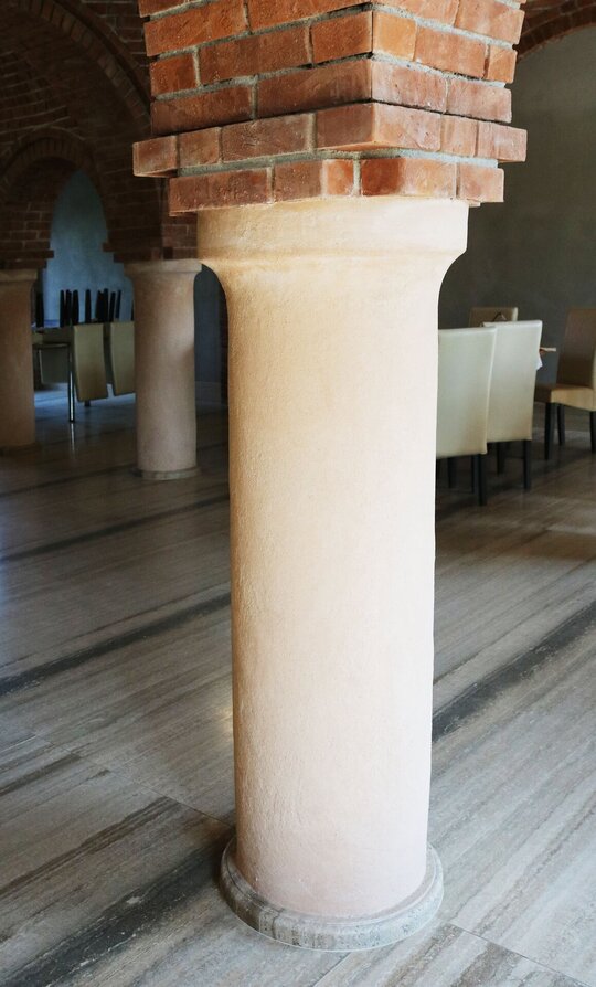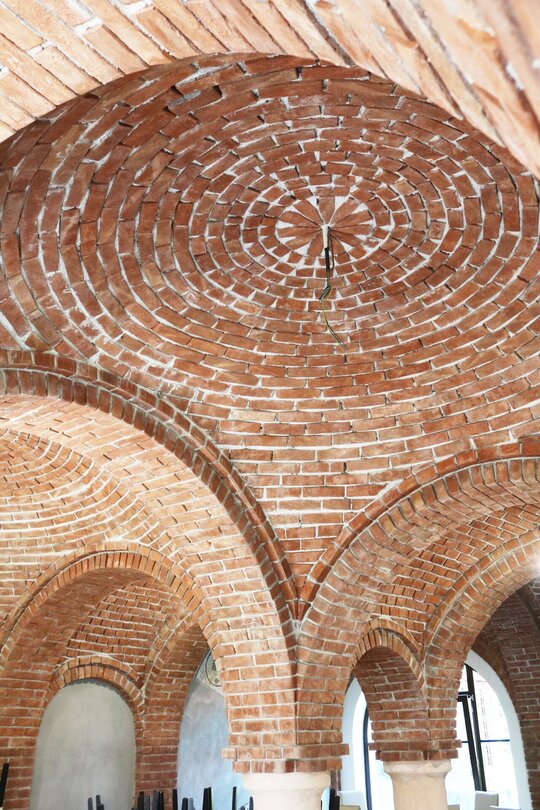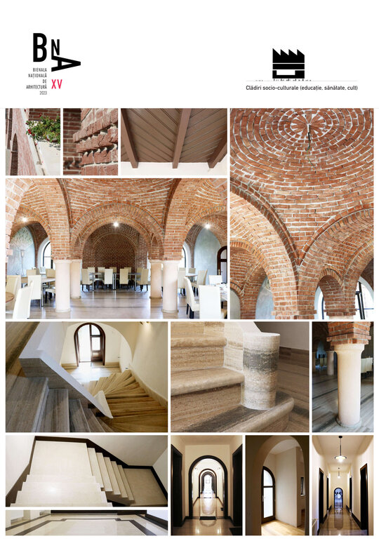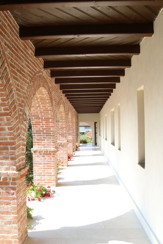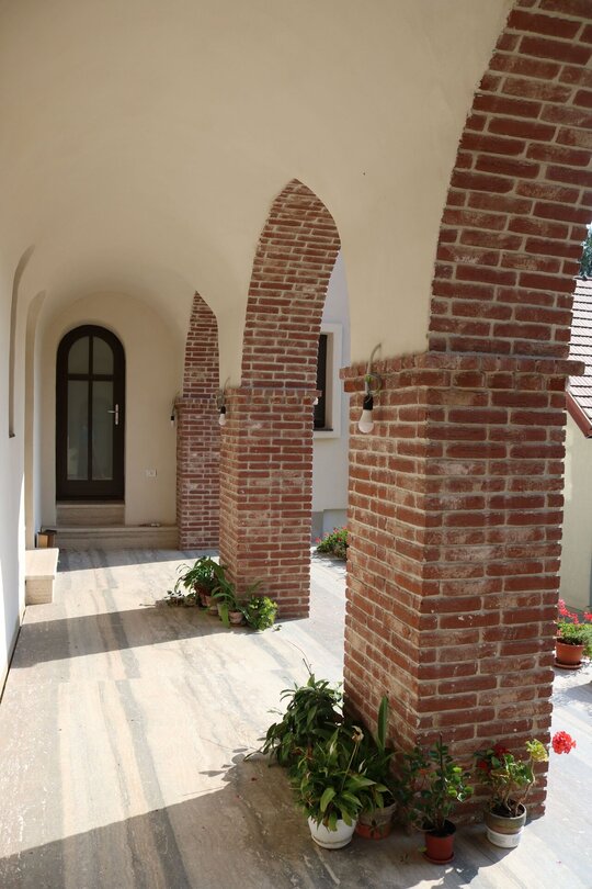 Nucleul central al întregului, sala de mese, este tratat complet boltit, cu bolți sferice sprijite pe 6 stâlpi, finisați în frescă și praf de cărămidă. Bolțile lăsate în cărămidă aparentă, conferă interiorului o patină bizantină. Contactul direct, atât vizual, cât și tactil cu materialele naturale este o condiție intrinsecă în cazul unei așezări cel puțin monahale, dacă nu și secular.