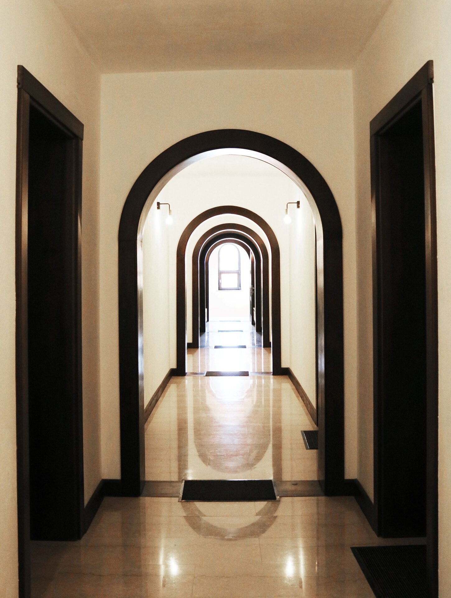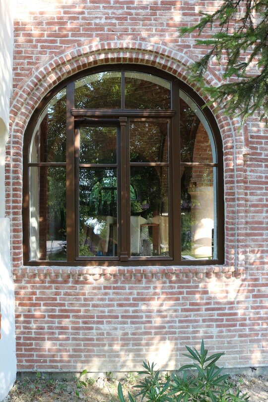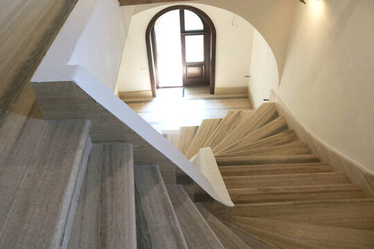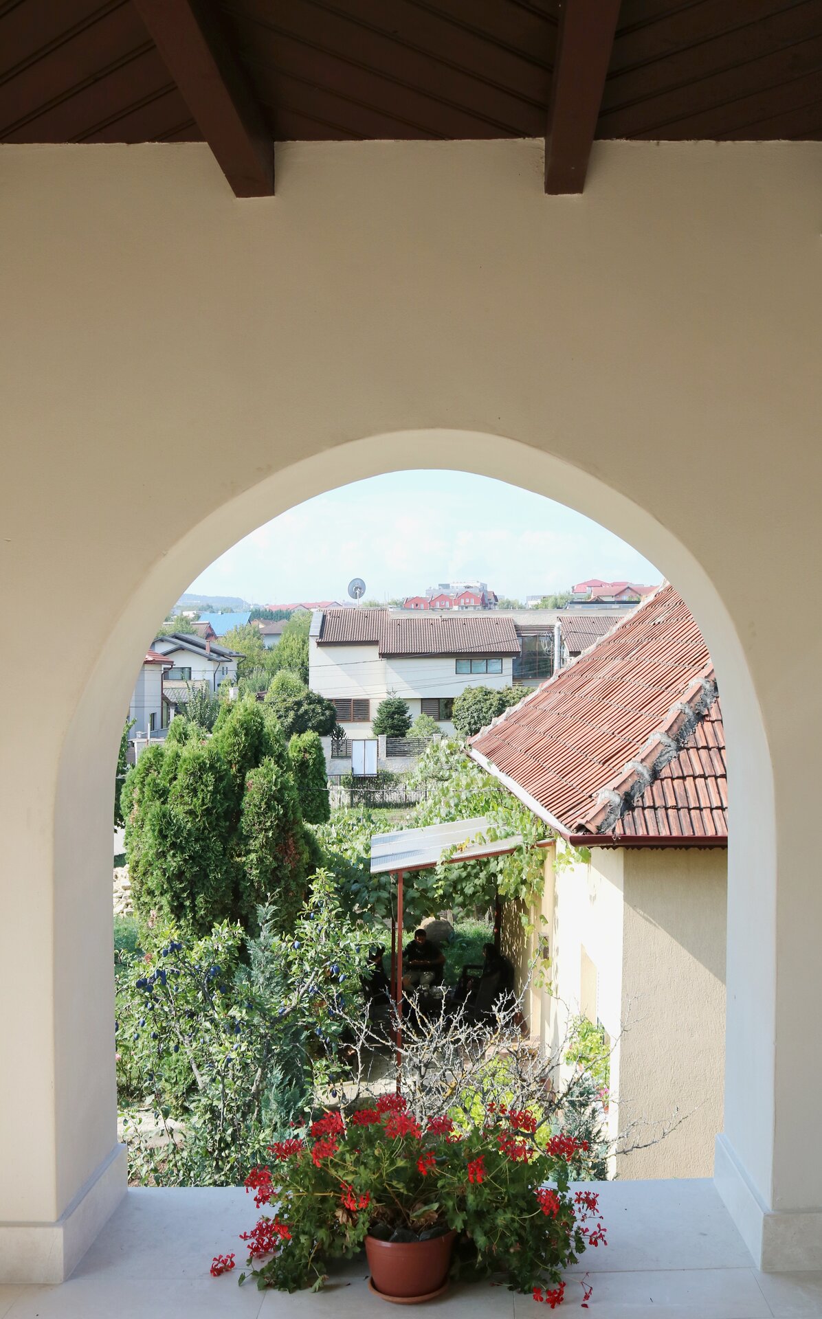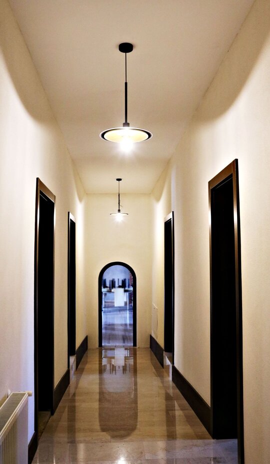Nucleul central al întregului, sala de mese, este tratat complet boltit, cu bolți sferice sprijite pe 6 stâlpi, finisați în frescă și praf de cărămidă. Bolțile lăsate în cărămidă aparentă, conferă interiorului o patină bizantină. Contactul direct, atât vizual, cât și tactil cu materialele naturale este o condiție intrinsecă în cazul unei așezări cel puțin monahale, dacă nu și secular.