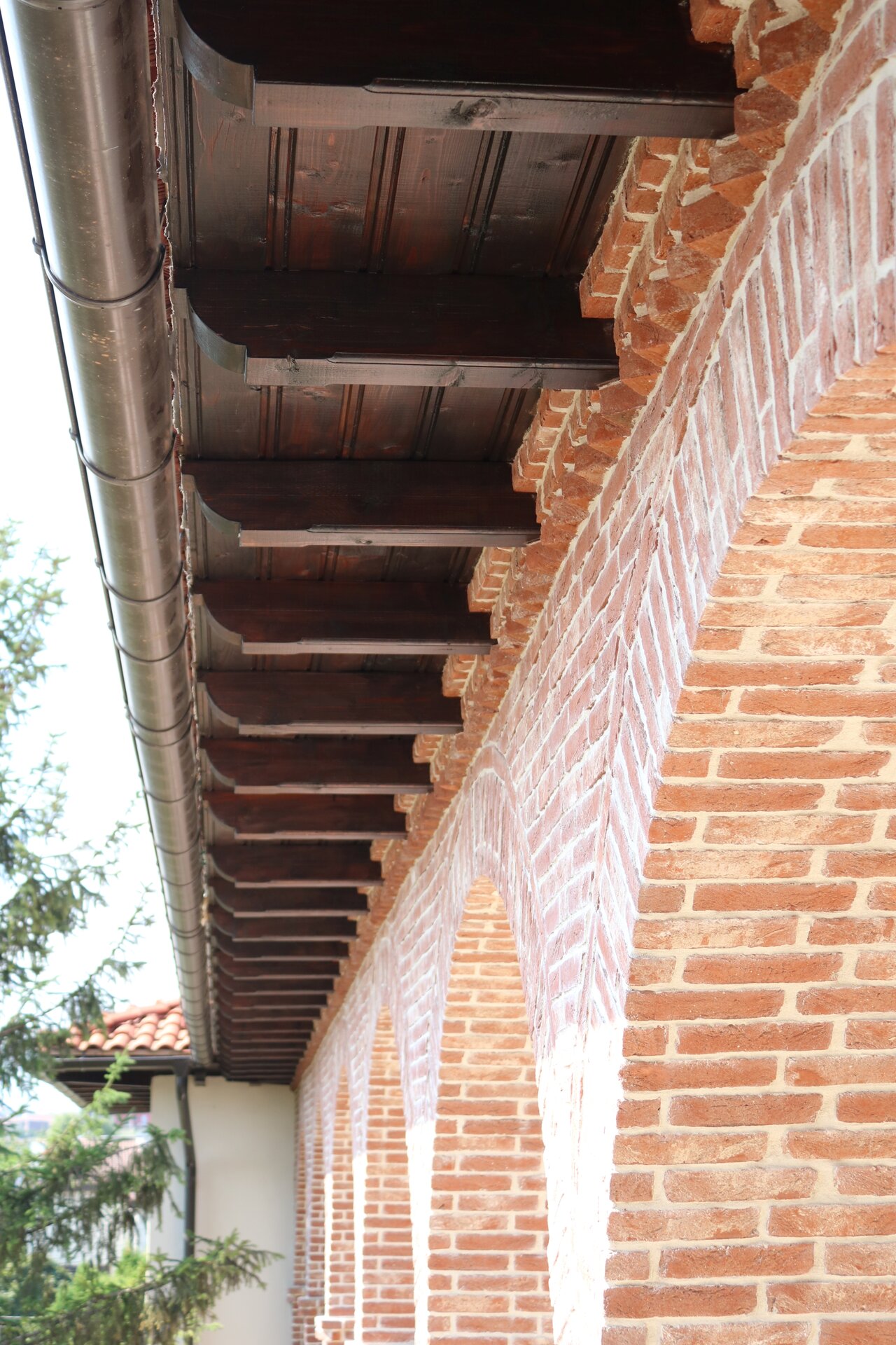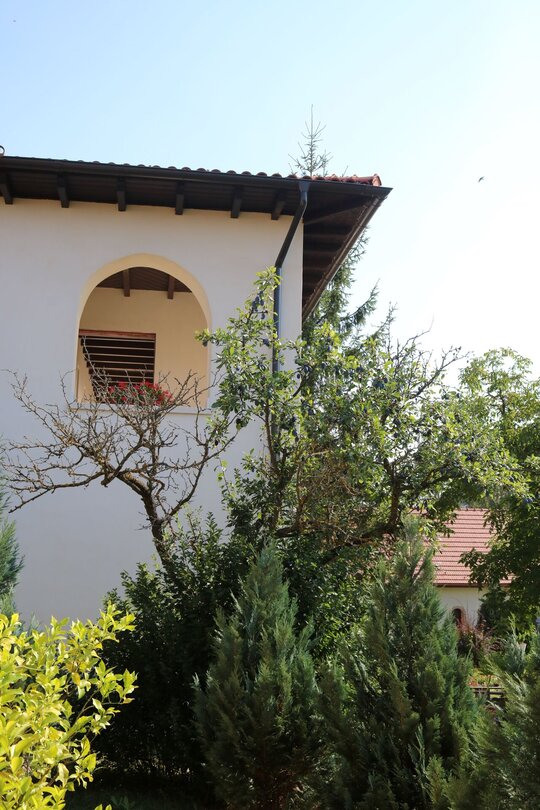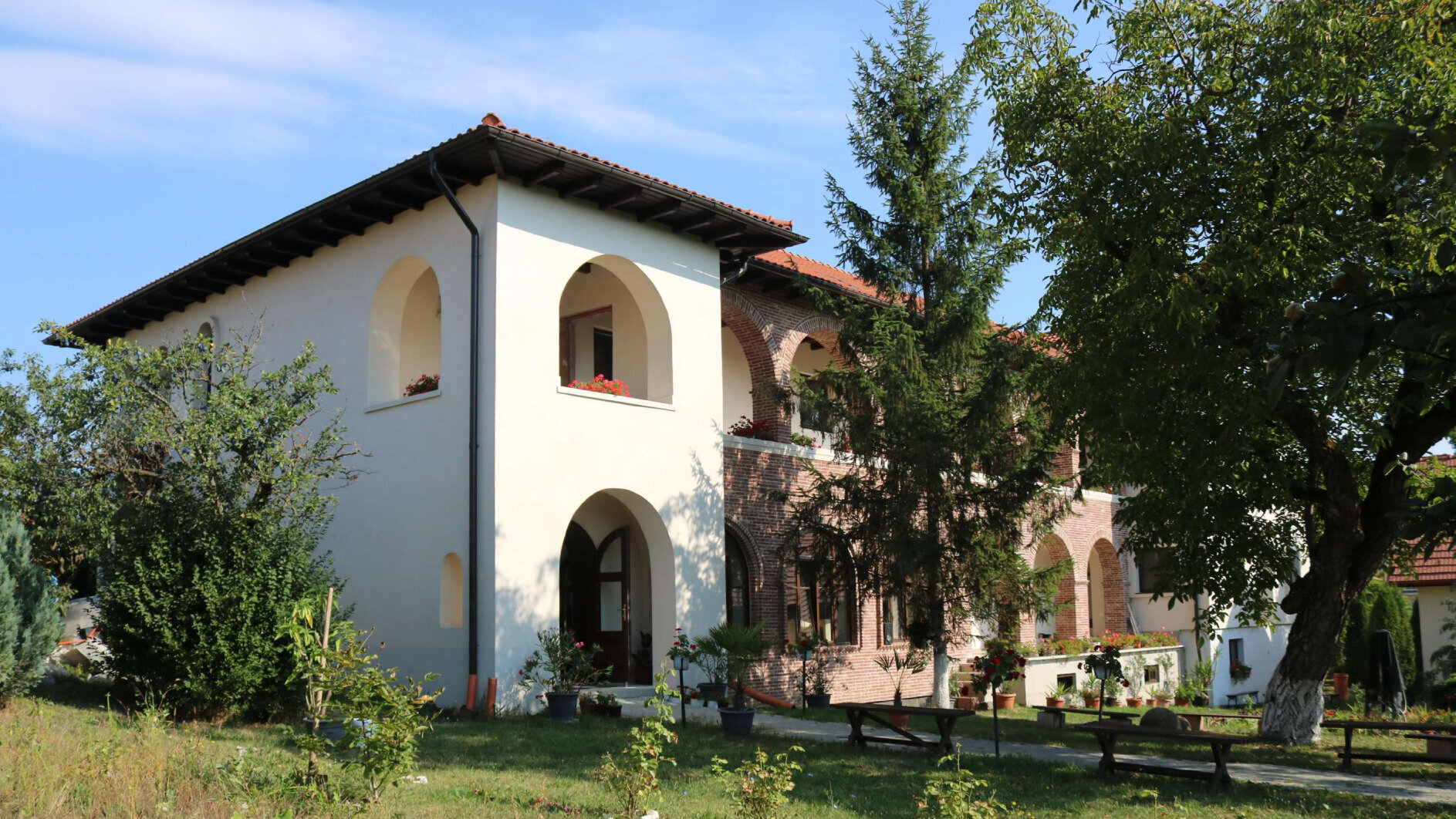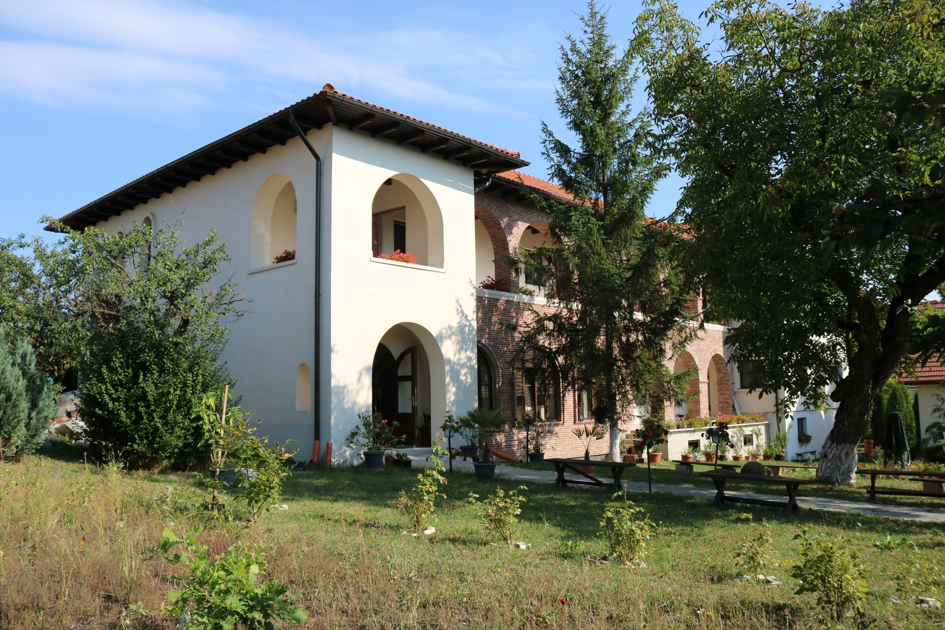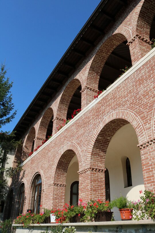 Arhitectura exterioară s-a dorit a păstrat din trăsăturile ansablurilor monahale din Tările Române și Balcani, cu pridvoare lungi, streșini largi și pante domoale.