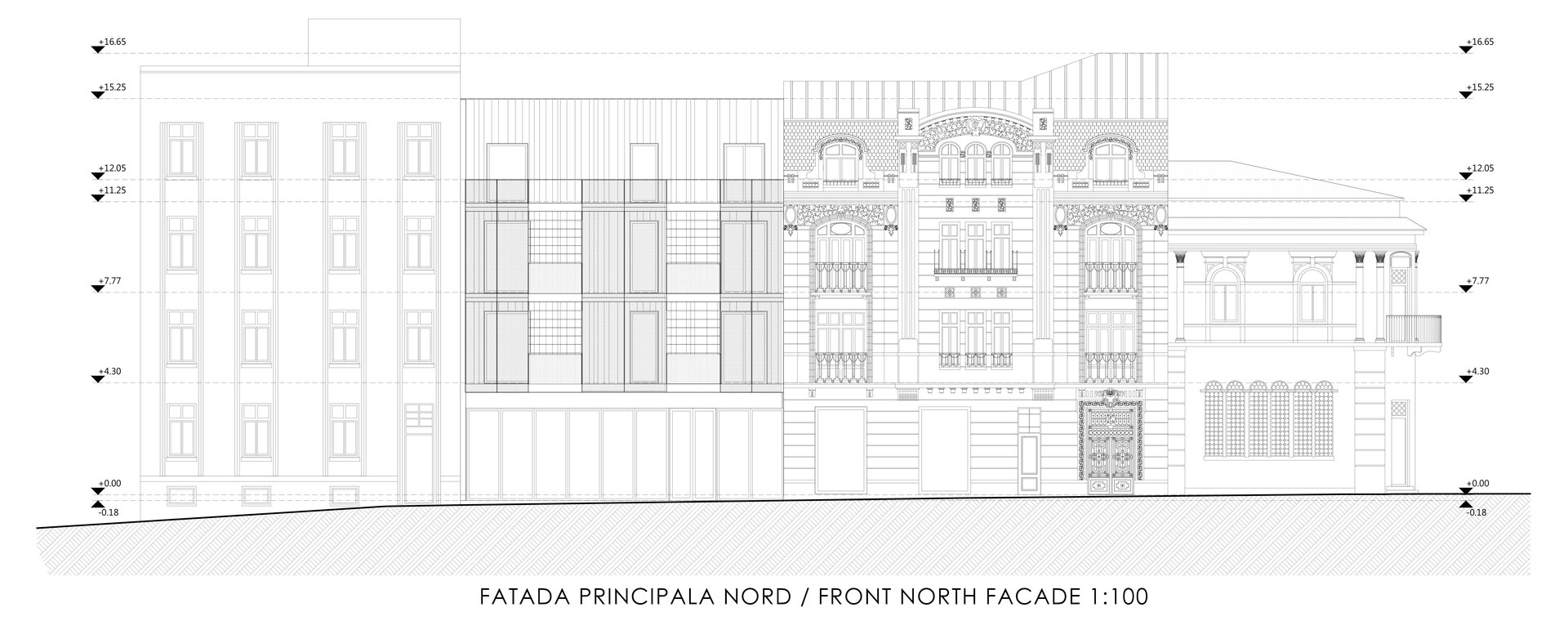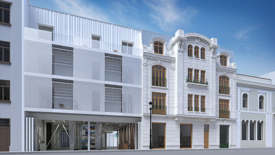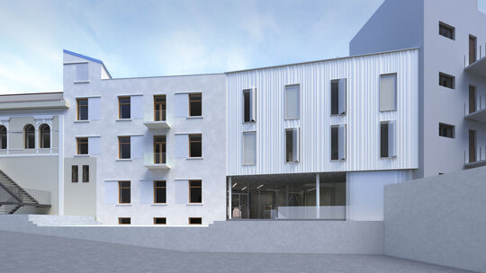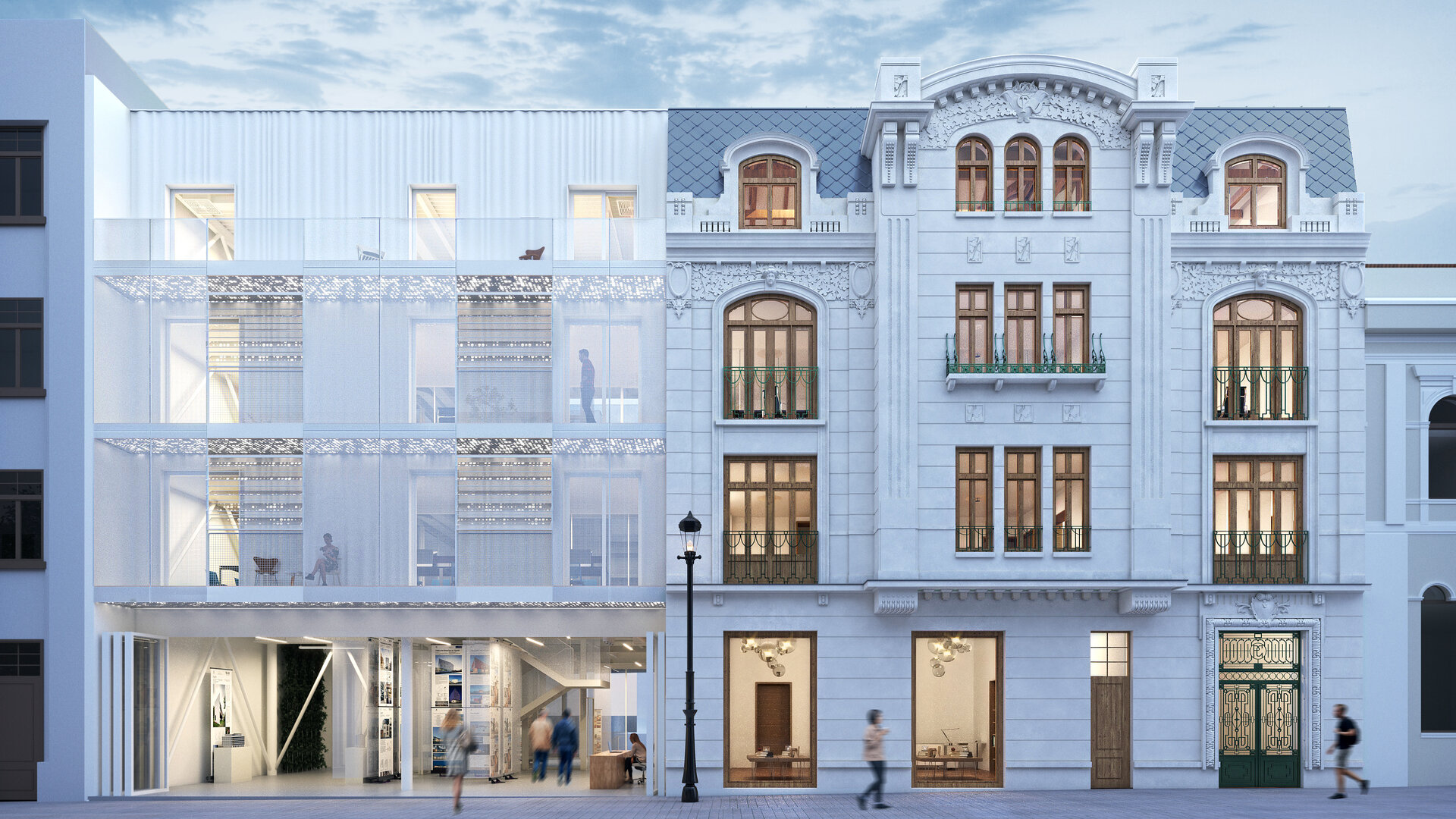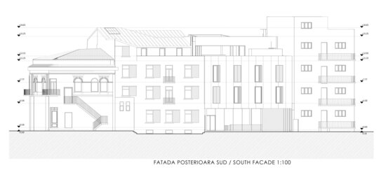 Fațada clădirii noi creează un dialog cu clădirea existentă: ondulațiile armonice reprezintă o referință a ornamentelor de tip art nouveau de la nivelul fațadei casei existente, se retrage față de stradă, accentuând elementul volumului central al casei existente aflat în consolă. În același timp, un ecran de sticlă preia aliniamentul străzii și continuă direcțiile și registrele casei existente, prin intermediul unor panouri perforate din mesh metalic și ferestre pivotante.
