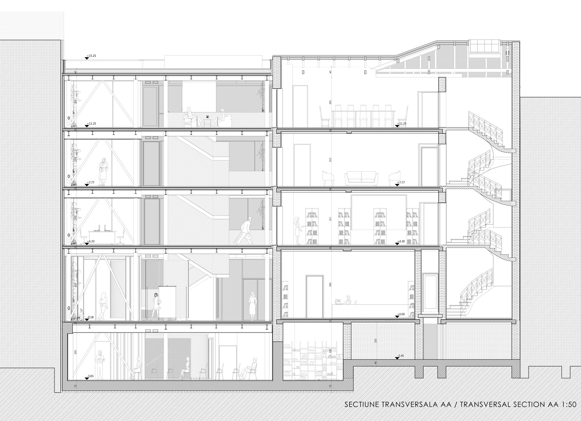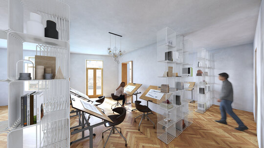 Spațiul interior al casei existente este remodelat pentru a face loc noii funcțiuni. Pereții care separă camerele de hol sunt înlocuiți cu un mobilier "transparent" ce îndeplinește rolul de compartimentare a spațiului, permițând totodată luminarea și deschiderea spațiului.