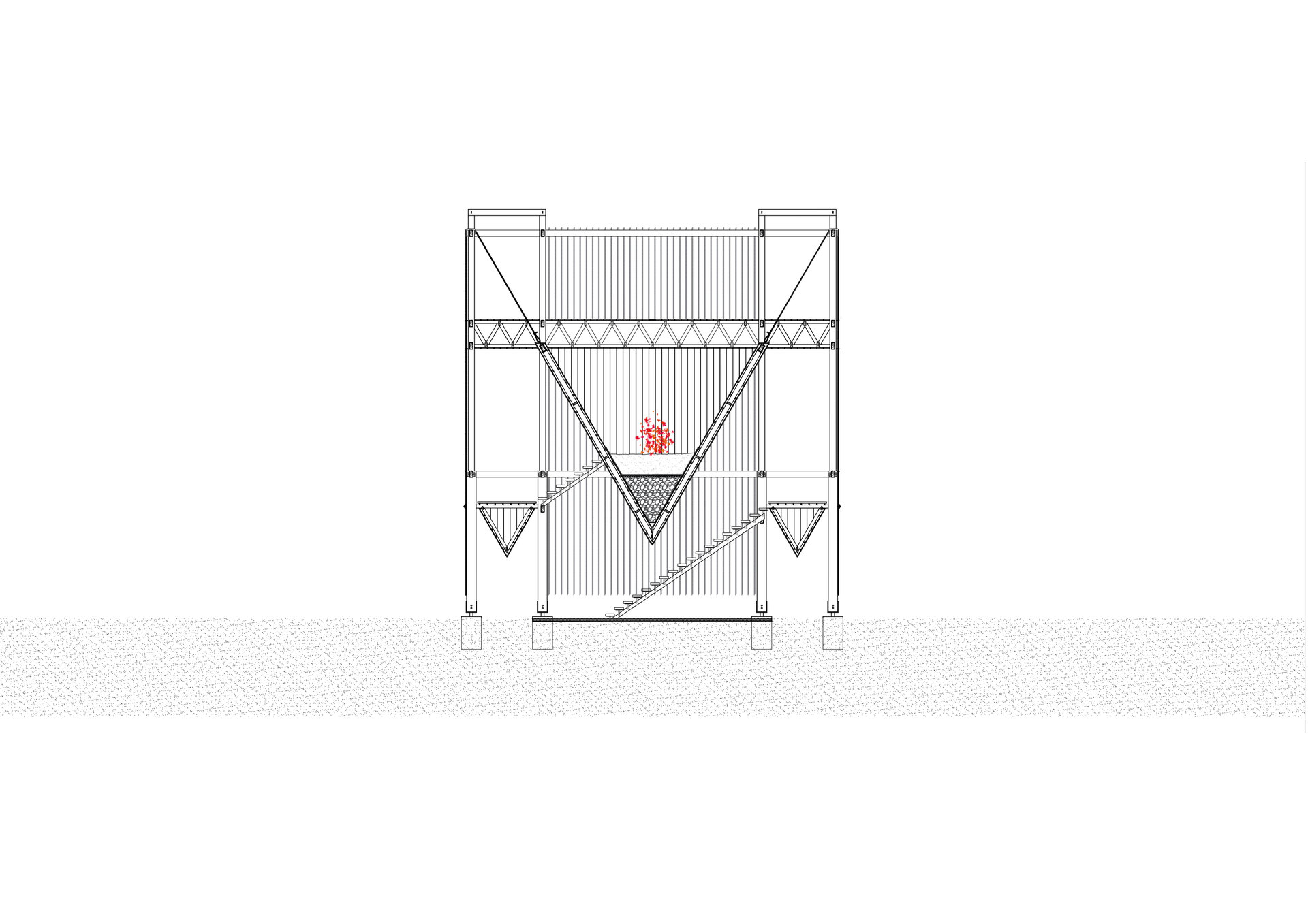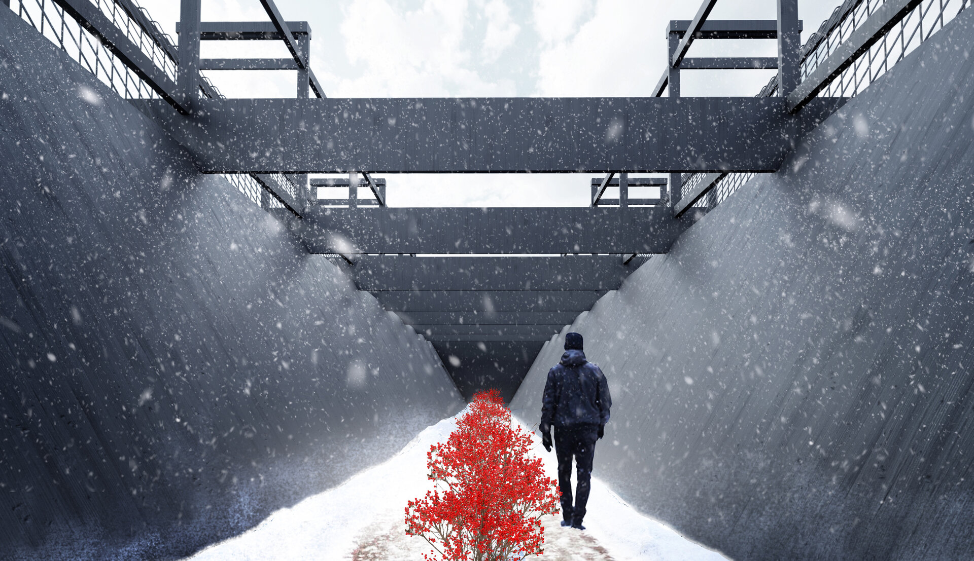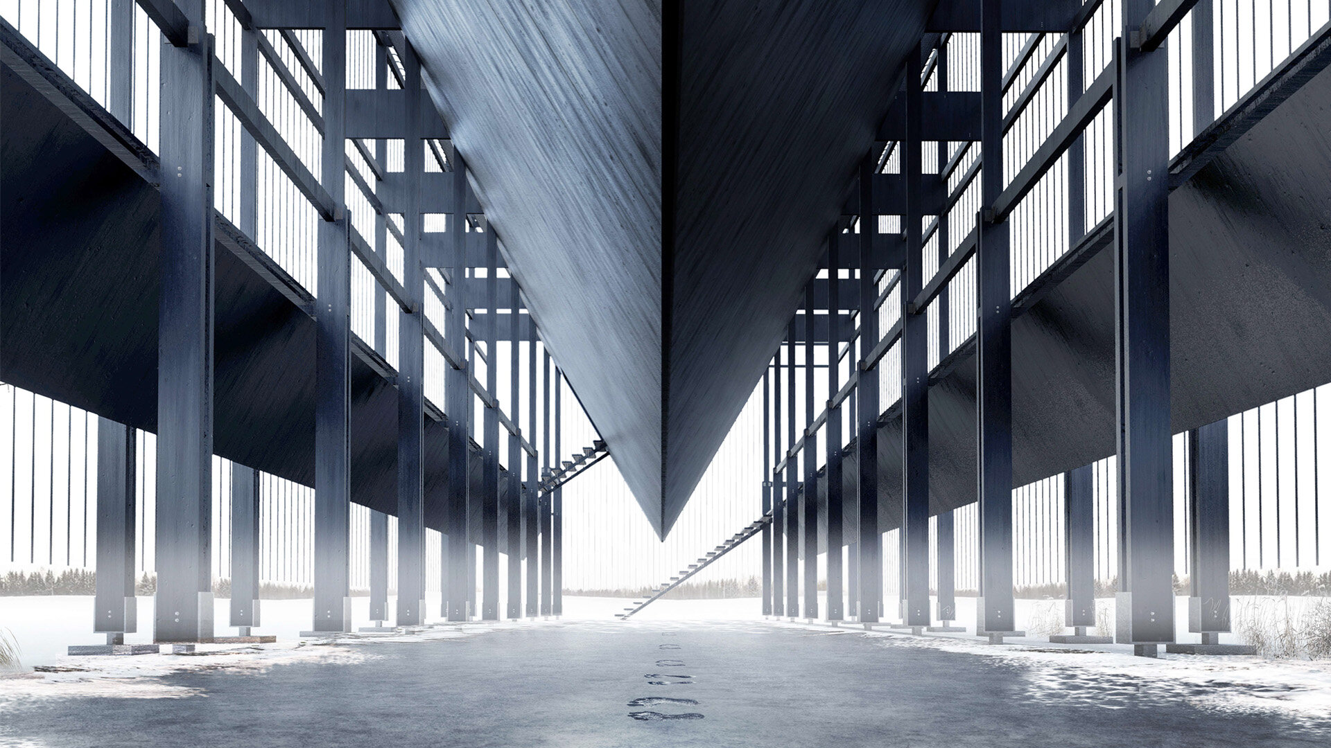 Memorialul propus este un spațiu al contrastelor. Sunt aduse împreună instanțele antagonice ale umanului: memoria genocidului, a sclaviei, torturii sau asupririi împarte același spațiu cu iertarea tuturor acestora. O structură scheletală din lemn și frânghii susține în interiorul ei trei volume masive, cu secțiune triunghiulară. Tensiunea ia naștere intre fragilitatea elementelor verticale și masivitate monoliților „plutitori”, cu muchii ascuțite orientate spre pământ.