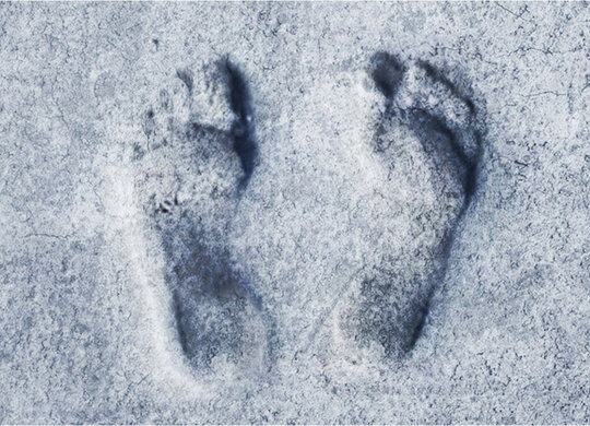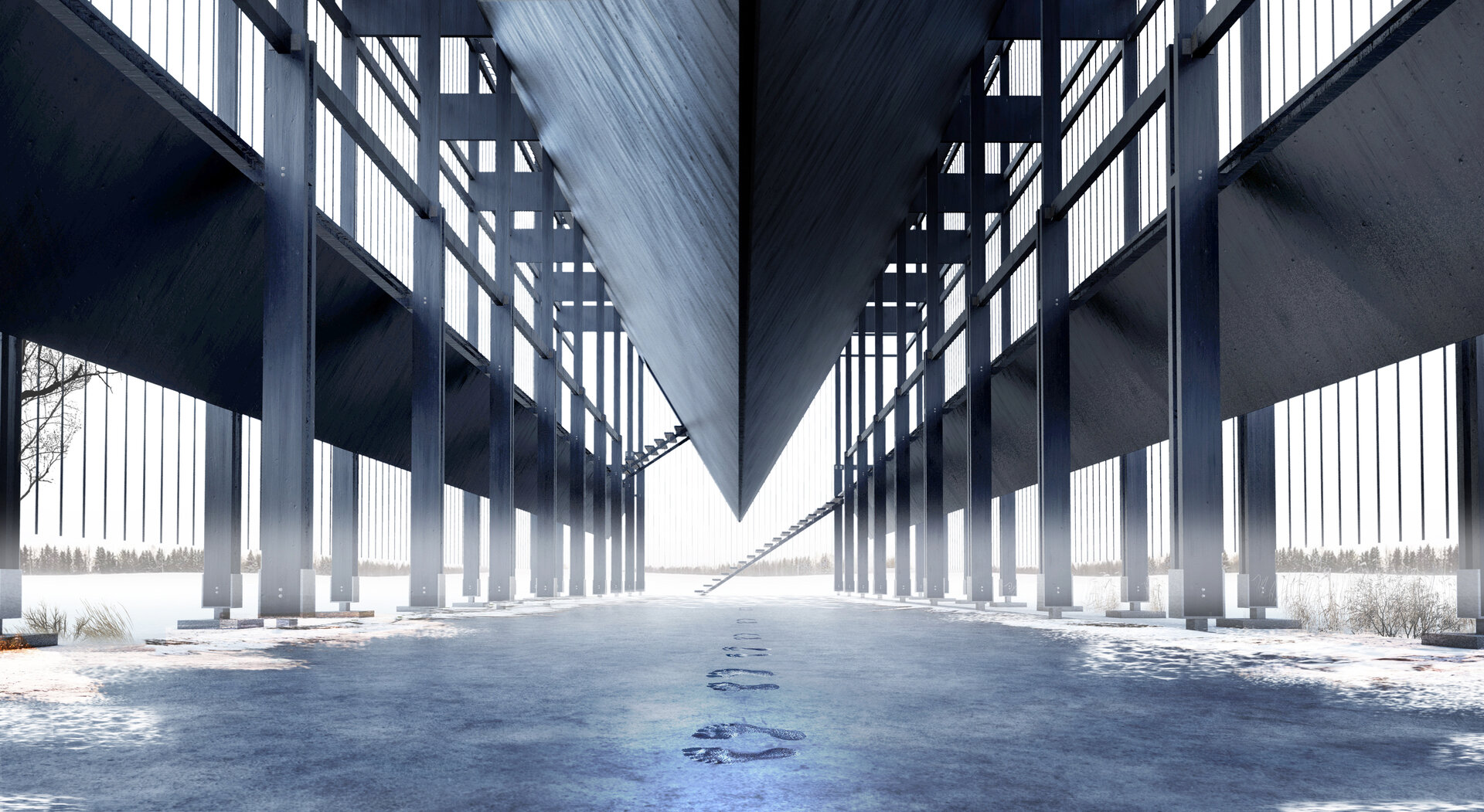 Un șir de tălpi desculțe este așternut chiar sub lama siluetei dominante. Urmele tălpilor amprentate în placa de beton sunt amintirile celor fragili și goi, celor absenți, ce poartă toată greutatea judecăților nedrepte. Prismele triunghiulare secundare, amplasate simetric, servesc drept spații intermediare în parcurgerea memorialului. Accesând aceste zone, vizitatorul se află deasupra nivelului solului, deasupra urmelor amprentate, privindu-le acum dintr-o ipostază autoritară, din ipostaza celui care decide. Acest sector al memorialului se înfățișează asemeni unui memento tăcut pentru „să nu judeci”. Esențială pentru conceptul proiectului este axa verticală: suprapus deasupra urmelor, în interiorul obiectului dominant, descoperim un brâu roșu aprins - o cale de flori perene (berry poppins / ilex verticillata). Roșul nu se estompează niciodată, indiferent de anotimp, ca un simbol al nădejdii, iertării și vieții.