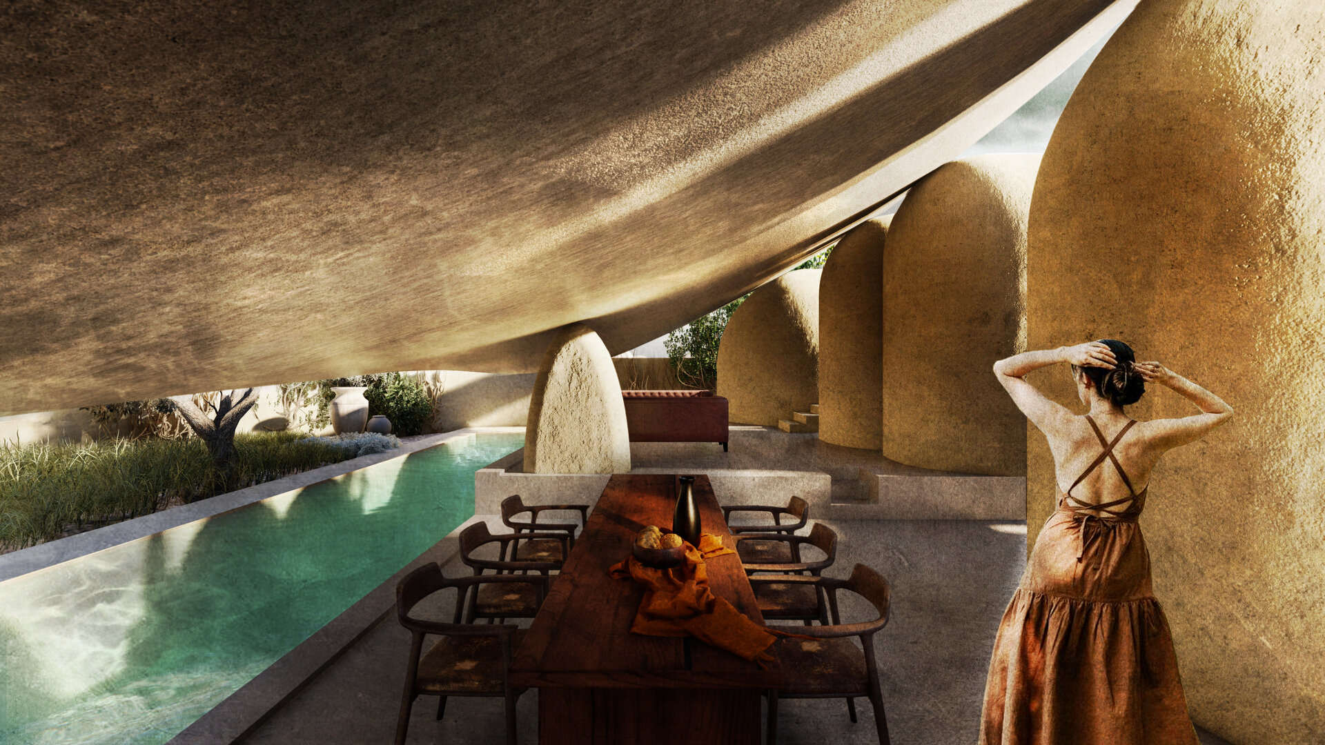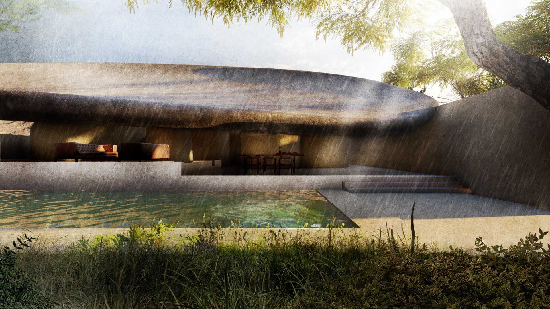 Elementul dominant al compoziției este volumul plutitor, ce se înclină către curte ca o aripă, ca o suprafață ce octrotește. Arhitectura joacă rolul unei pânze, al unui suport pe care sunt proiectate umbrele vegetației prezente în curte.