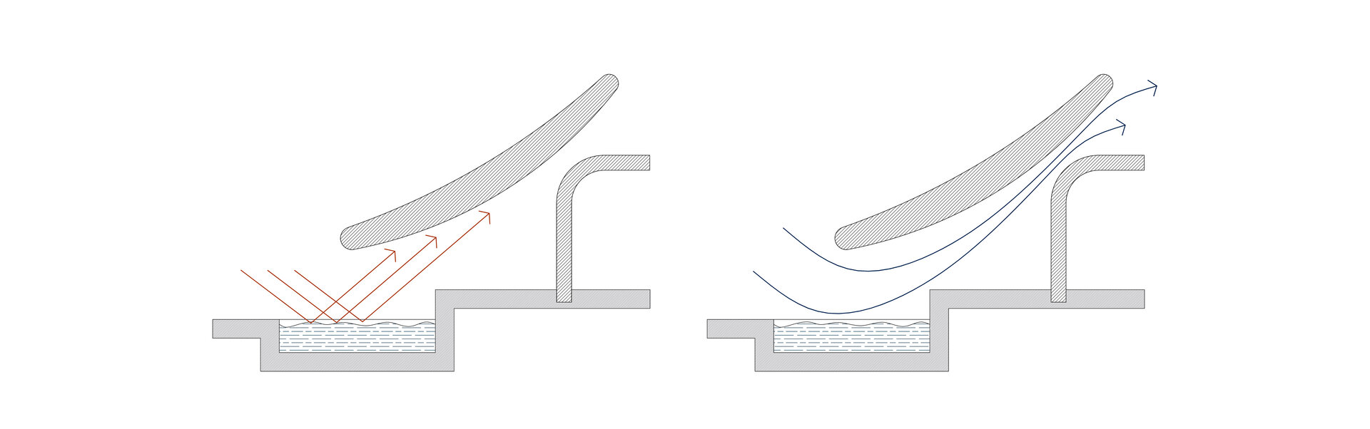 În proiect sunt prezente umbre de diferite naturi: întâlnim umbre diluate în gradiente, care alunecă pe suprafețele curbe, odata cu mișcarea lentă a soarelui, dar și umbre și lumini vii, tremurătoare, ce pulsează cu rapiditate, reflectate în suprafața apei.