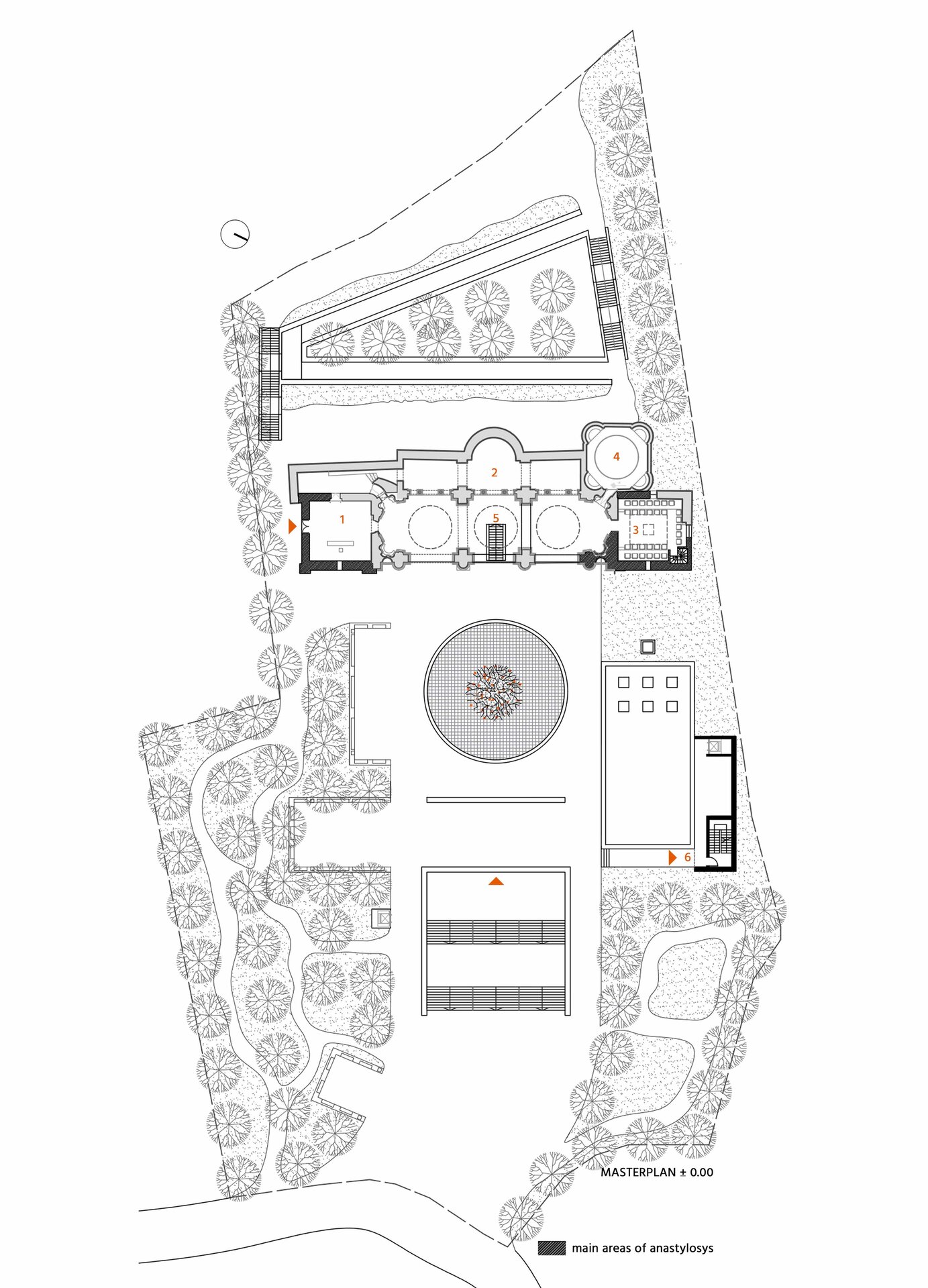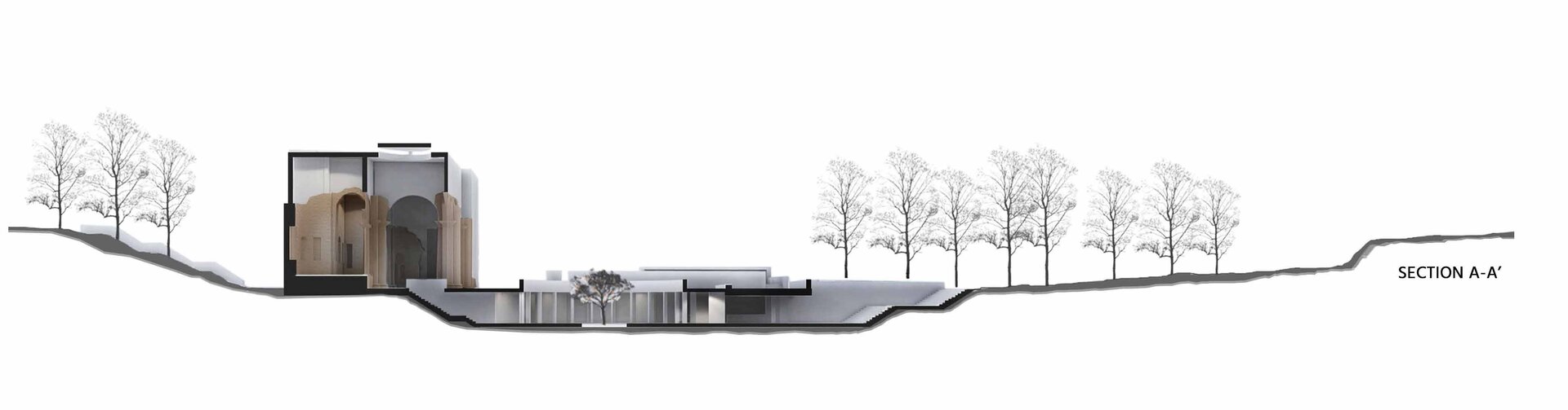 Pentru a sublinia perspectivele principale, pentru a menține atenția către monument și pentru a crea, la nivel urban, o zona ușor accesibilă publicului din ambele străzi ce accesează situl, terenul a fost nivelat într-o pantă lină. Astfel, noua intervenție este „ascunsă” în subteran.