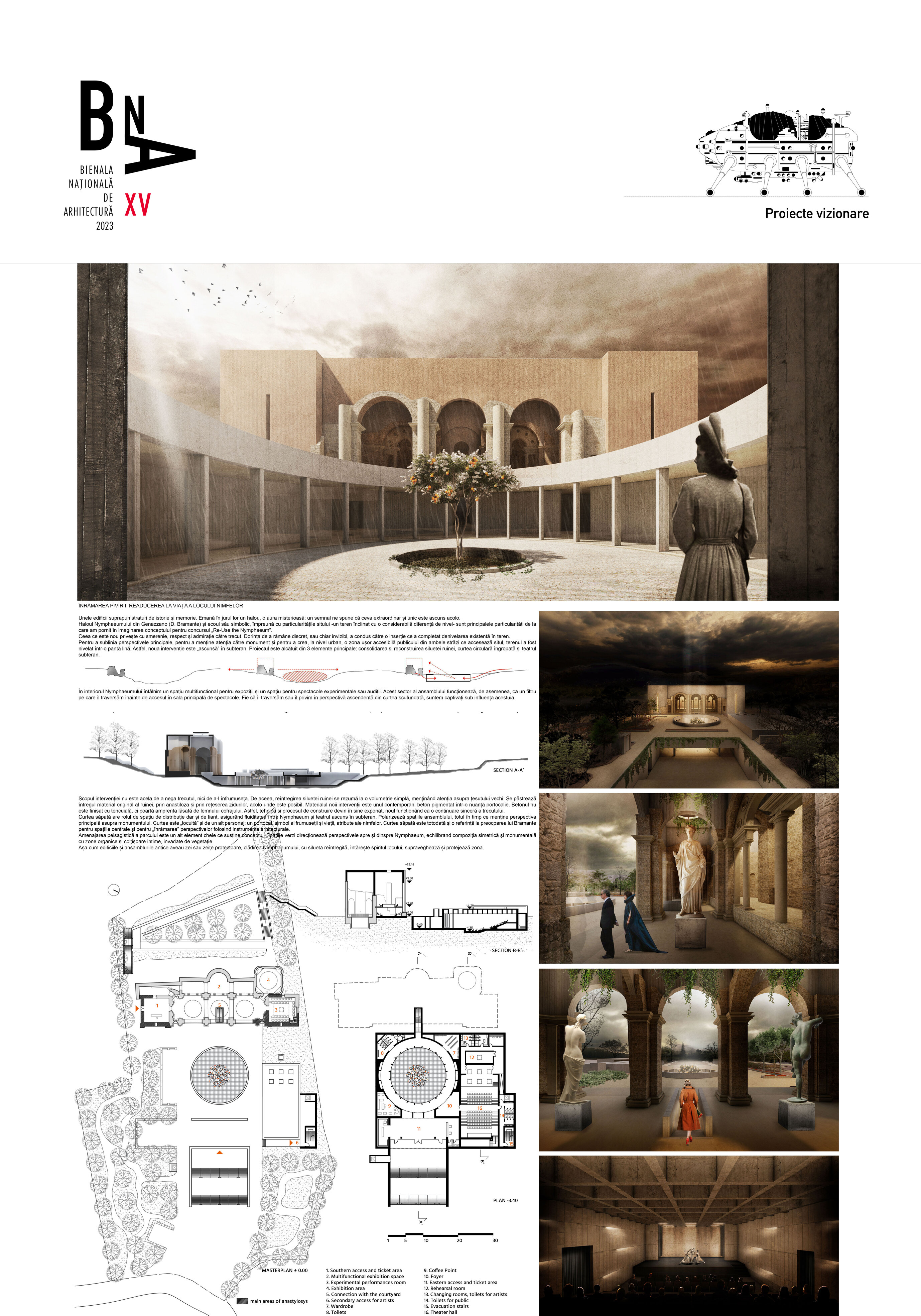 Haloul Nymphaeumului din Genazzano (D. Bramante) și ecoul său simbolic, împreună cu particularitățile sitului -un teren înclinat cu o considerabilă diferență de nivel- sunt principalele particularități de la care am pornit în imaginarea conceptului pentru concursul „ReUse the Nymphaeum”.
