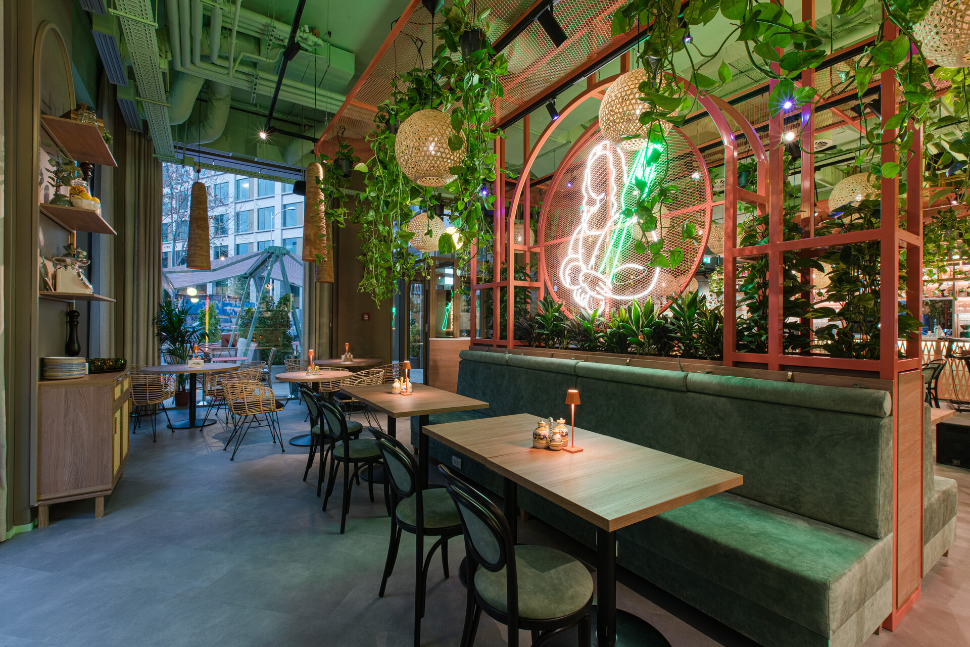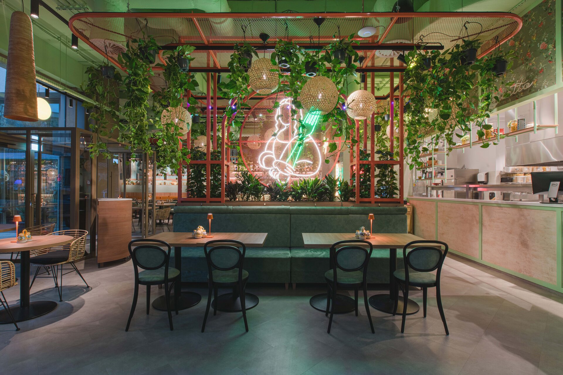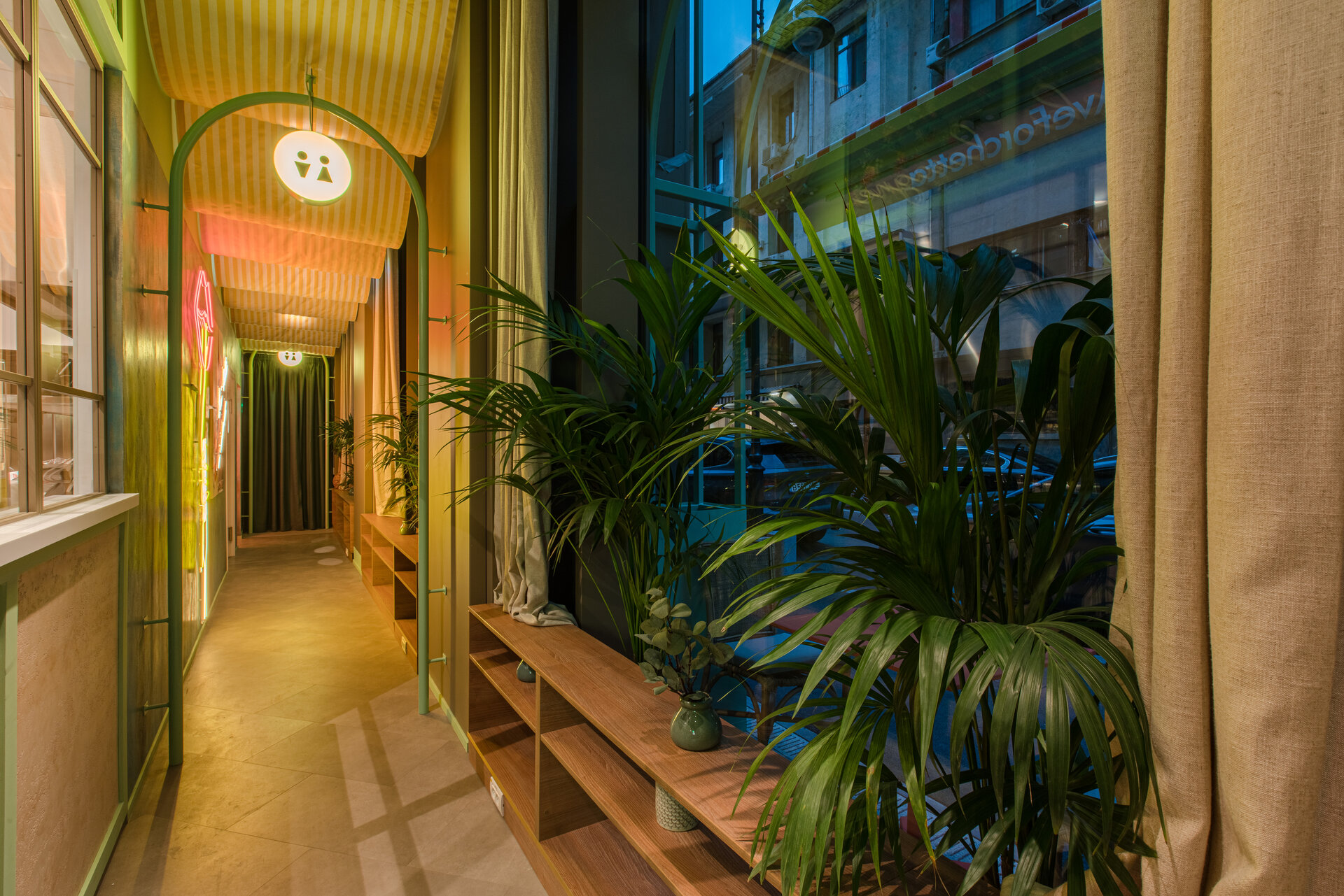 florale și argila ghivecelor din lut - o juxtapunere a cadrelor dintr-o călătorie. Suprapunerea arcului în plin cintru, ca esență a arhitecturii din Italia cu fațada modernă minimalistă a clădirii gazdă, referințele interpretate recunoscute în arta și arhitectura italiană sunt transpuse în lumini de neon, conectând tânărul consumator de vasta cultură a Italiei.