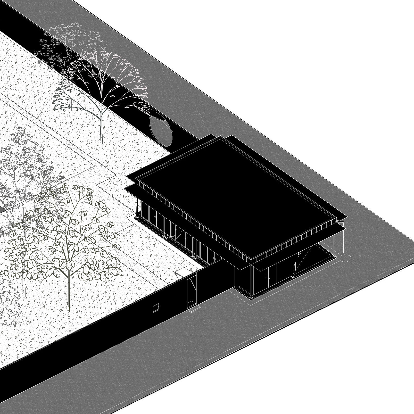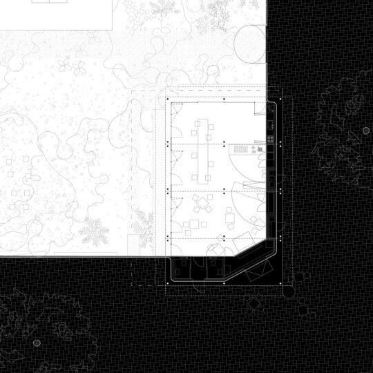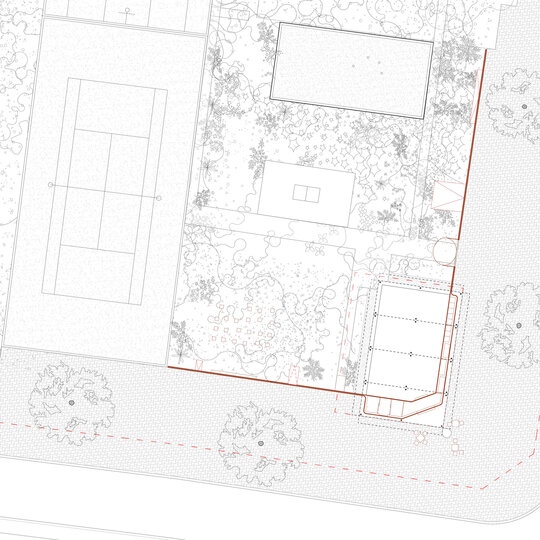 Abordarea noastră este contextuală, în măsura în care, proiectul caută să lucreze cu întreaga parcelă. Punctul de origine, prilejul poziționării cladirii pe un colț de lot, reprezintă în ochii noștri oportunitatea de a propune o clădire care își îndeplinește menirea originară, aceea de a fi o casă de colț. Așadar, în ipoteza propusă prin temă, ca această casă să fie repoziționată ulterior în amsamblu, aceasta va ocupa întotdeauna un colț de lot.