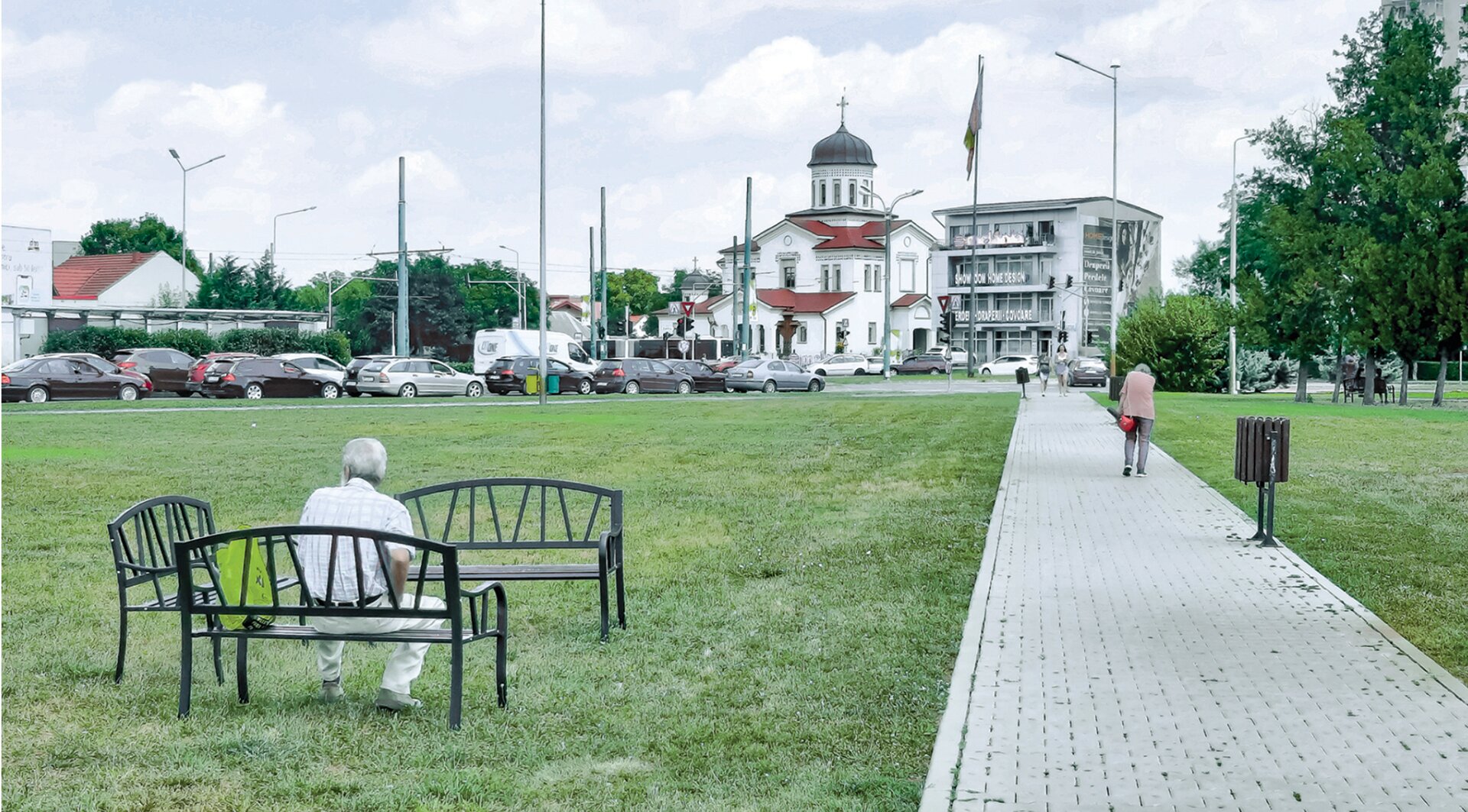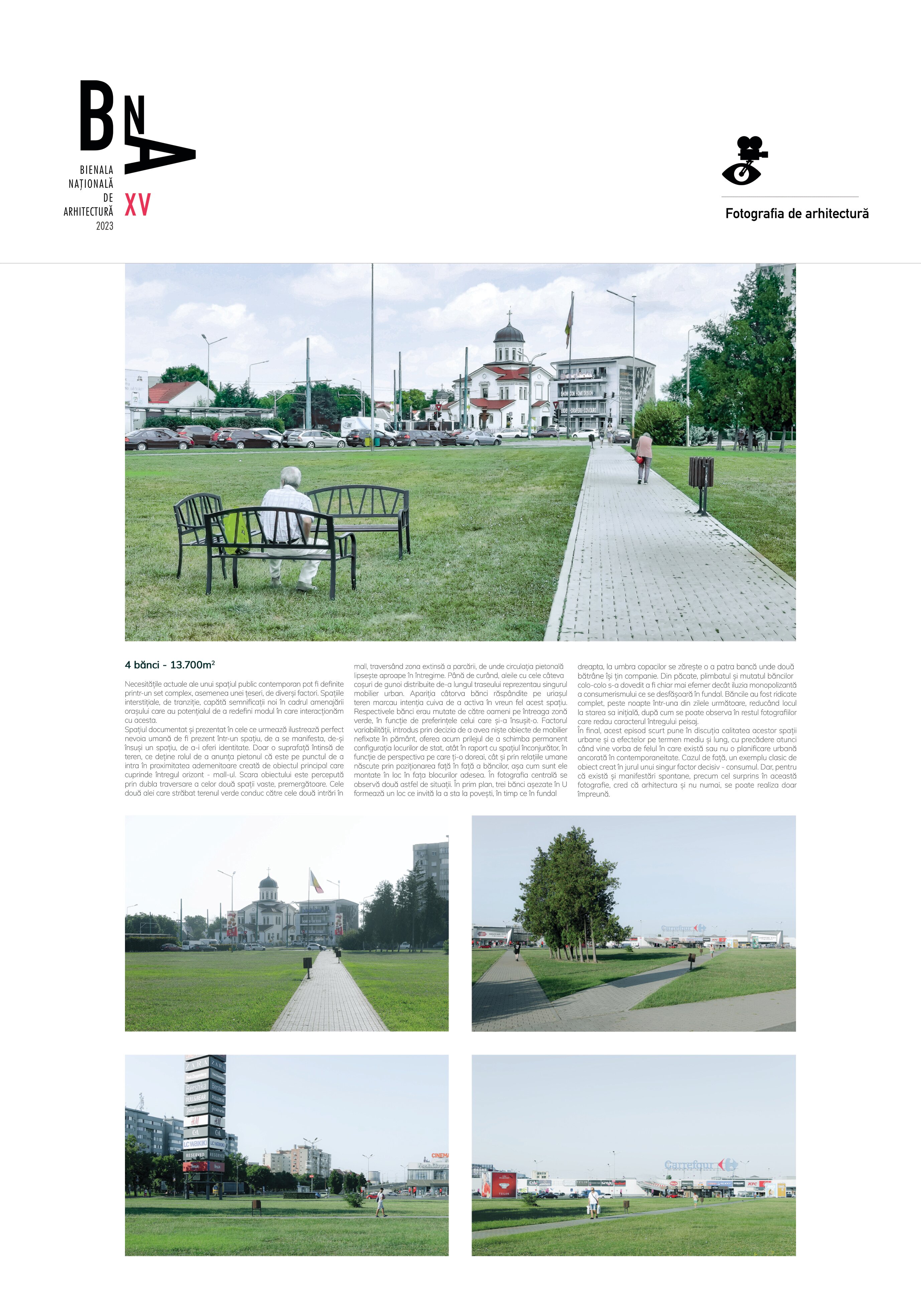 Până de curând, aleile cu cele câteva coșuri de gunoi distribuite de-a lungul traseului reprezentau singurul mobilier urban. Apariția câtorva bănci răspândite pe uriașul teren marcau intenția cuiva de a activa în vreun fel acest spațiu. Respectivele bănci erau mutate de către oameni pe întreaga zonă verde, în funcție de preferințele celui care și-a însușit-o. Factorul variabilității, introdus prin decizia de a avea niște obiecte de mobilier nefixate în pământ, oferea acum prilejul de a schimba permanent configurația locurilor de stat, atât în raport cu spațiul înconjurător, în funcție de perspectiva pe care ți-o doreai, cât și prin relațiile umane născute prin poziționarea față în față a băncilor, așa cum sunt ele montate în loc în fața blocurilor adesea. În fotografia centrală se observă două astfel de situații. În prim plan, trei bănci așezate în U formează un loc ce invită la a sta la povești, în timp ce în fundal dreapta, la umbra copacilor se zărește o a patra bancă unde două bătrâne își țin companie.