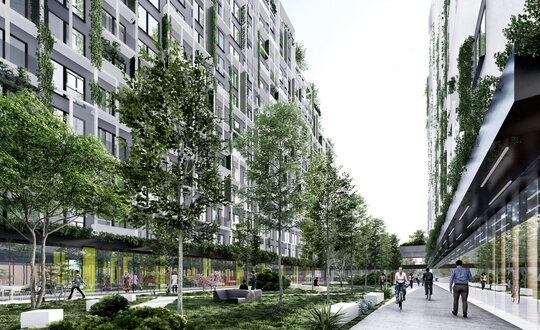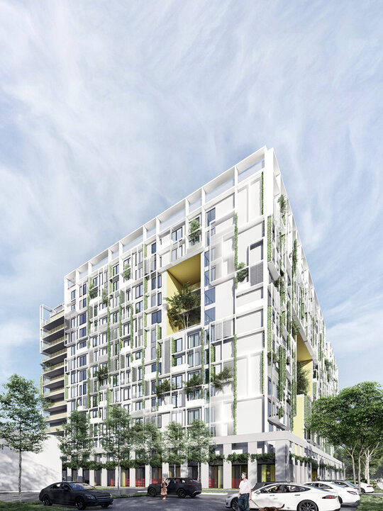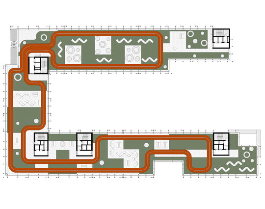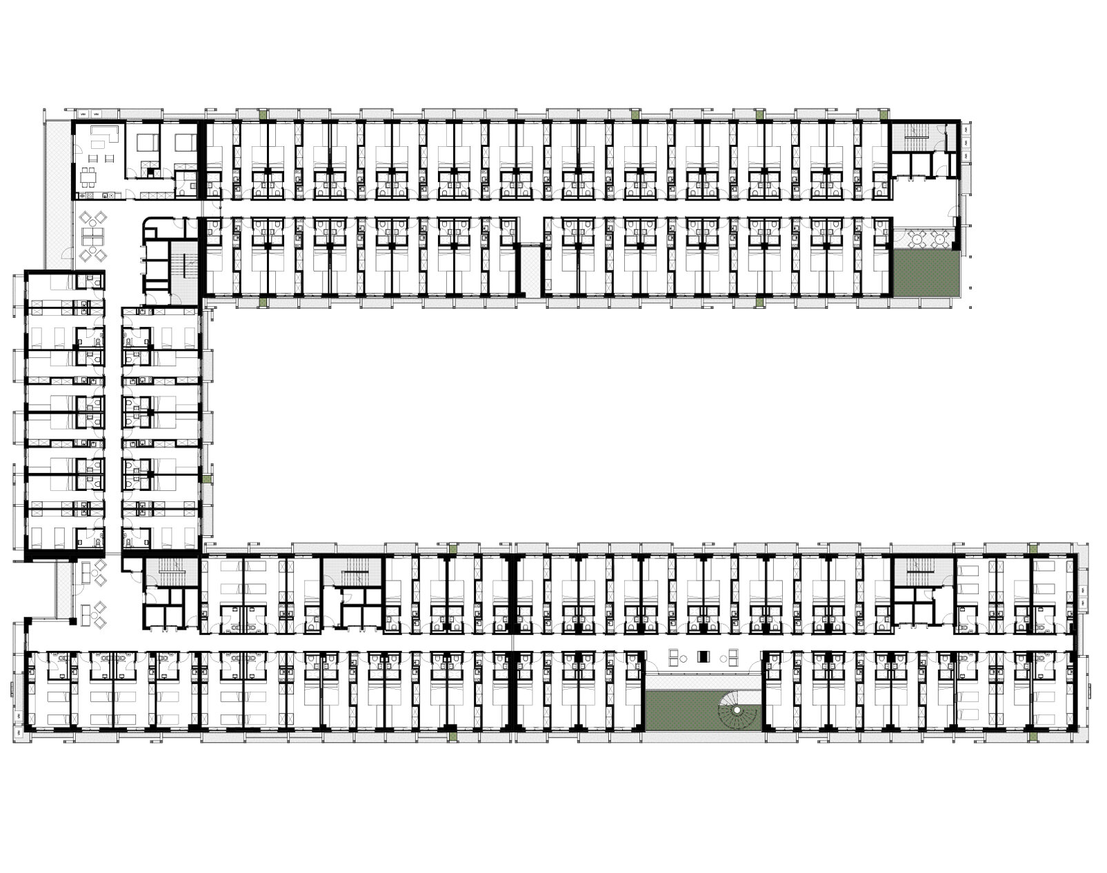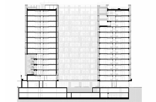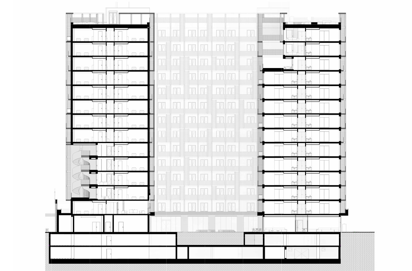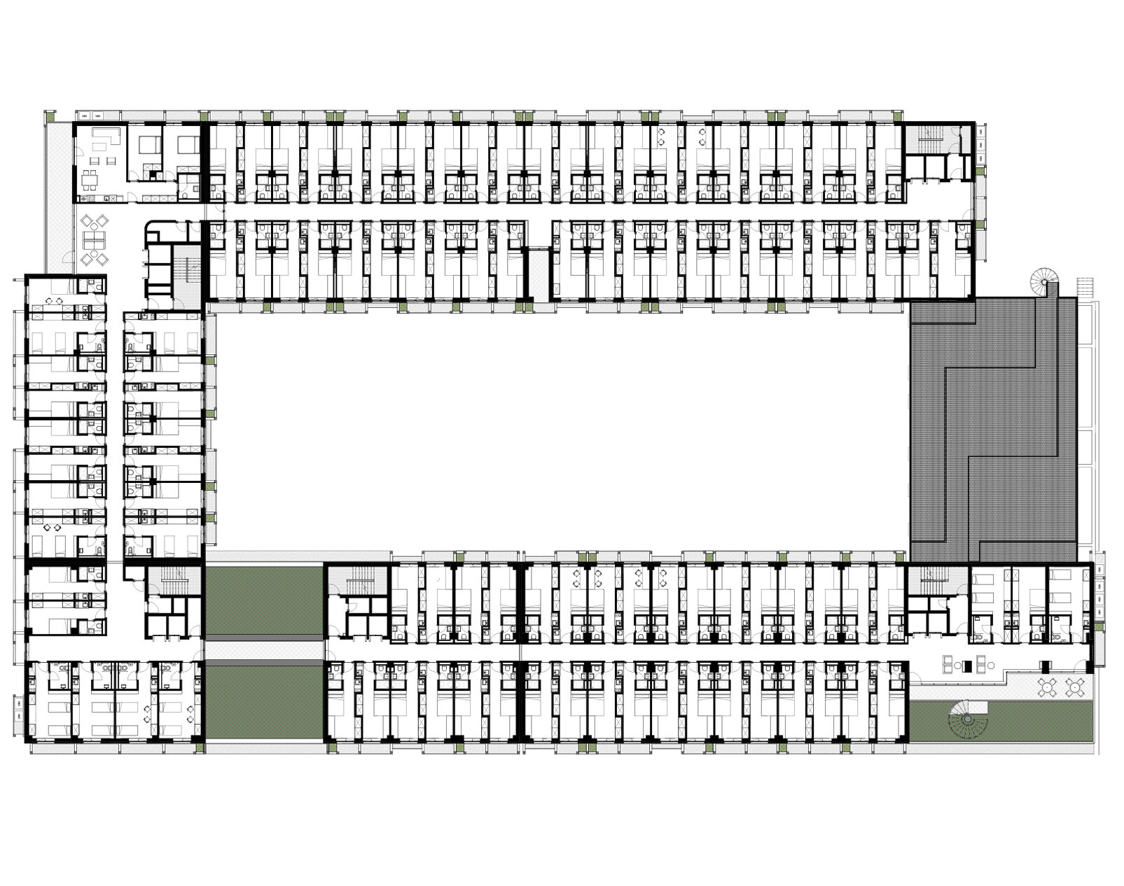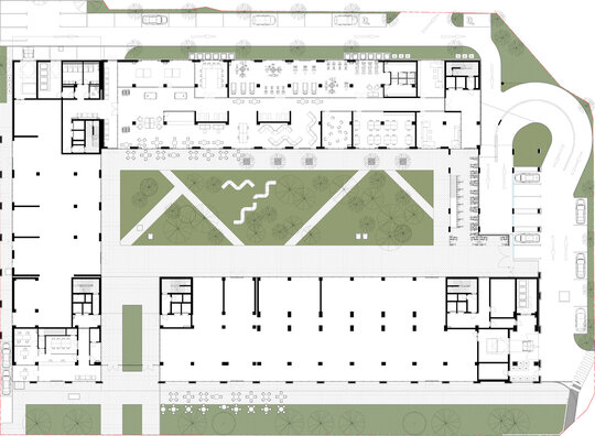 Clădirea se conformează, așadar, mai întâi ca o incintă care se resimte în registul inferior al acesteia, la cota unei curți rectangulare, un parc deservit de spații comerciale sau dedicate recreerii (sală de fitness, ateliere, camere media sau de socializare).