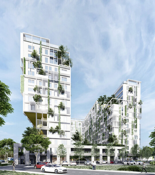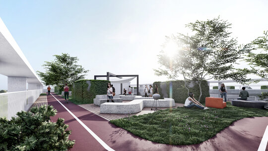 Deși ating regimul de înălțime P+13, tronsoanele nu sunt indiferente față de spațiul central al curții, celularul dens și stivuit al camerelor fiind întrerupt pe alocuri de o serie de decupaje supradimensionate, care lucrează în sensul fragmentării și al reducției de scară a obiectului. Ele devin o compensație și pentru spațialitatea coridoarelor interioare, interacțiunea specifică zonelor de hol fiind potențată de aceste adevărate „grădini suspendate”, cu geometrii și dimensiuni diferite. Mai mult decât atât, succesiunea lor anunță, de fapt, un ultim spațiu comun aflat pe terasa clădrii. Acest al doilea „parc” revendică terenul ocupat de însăși amprenta construcției prin intermediul unor spații verzi care fie sunt bordate, fie sunt întrerupte de o pistă de alergări „măsurând” întreg perimetrul.