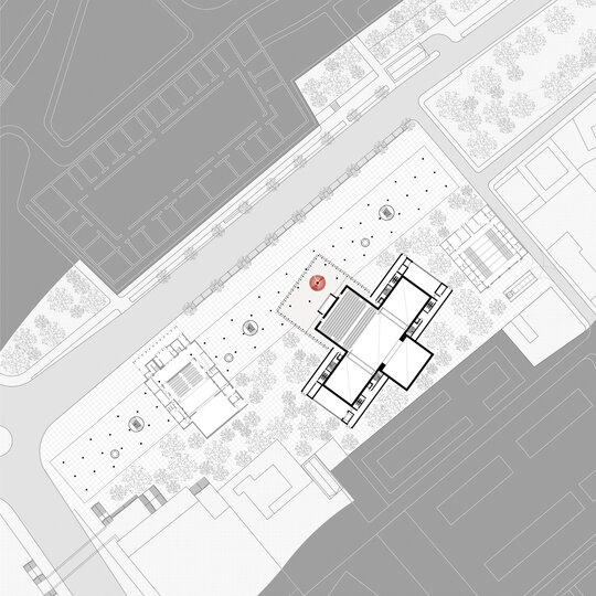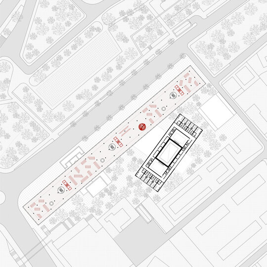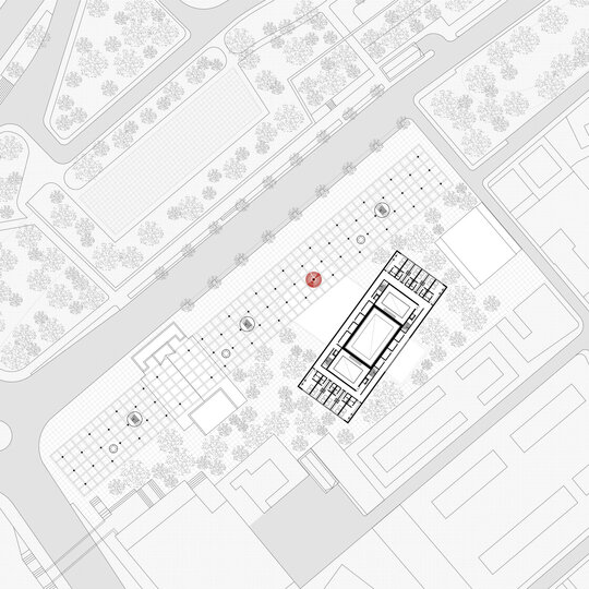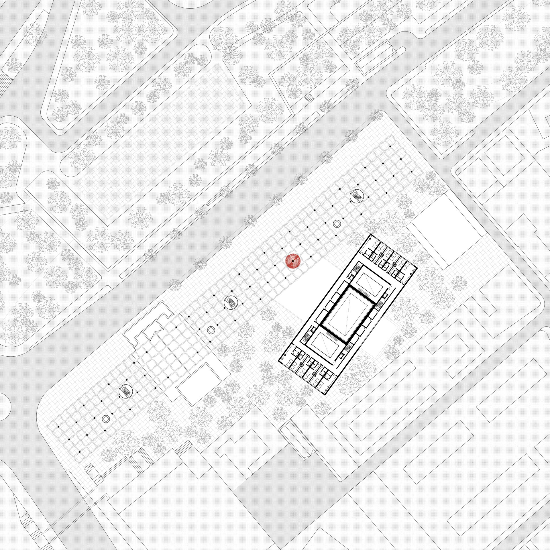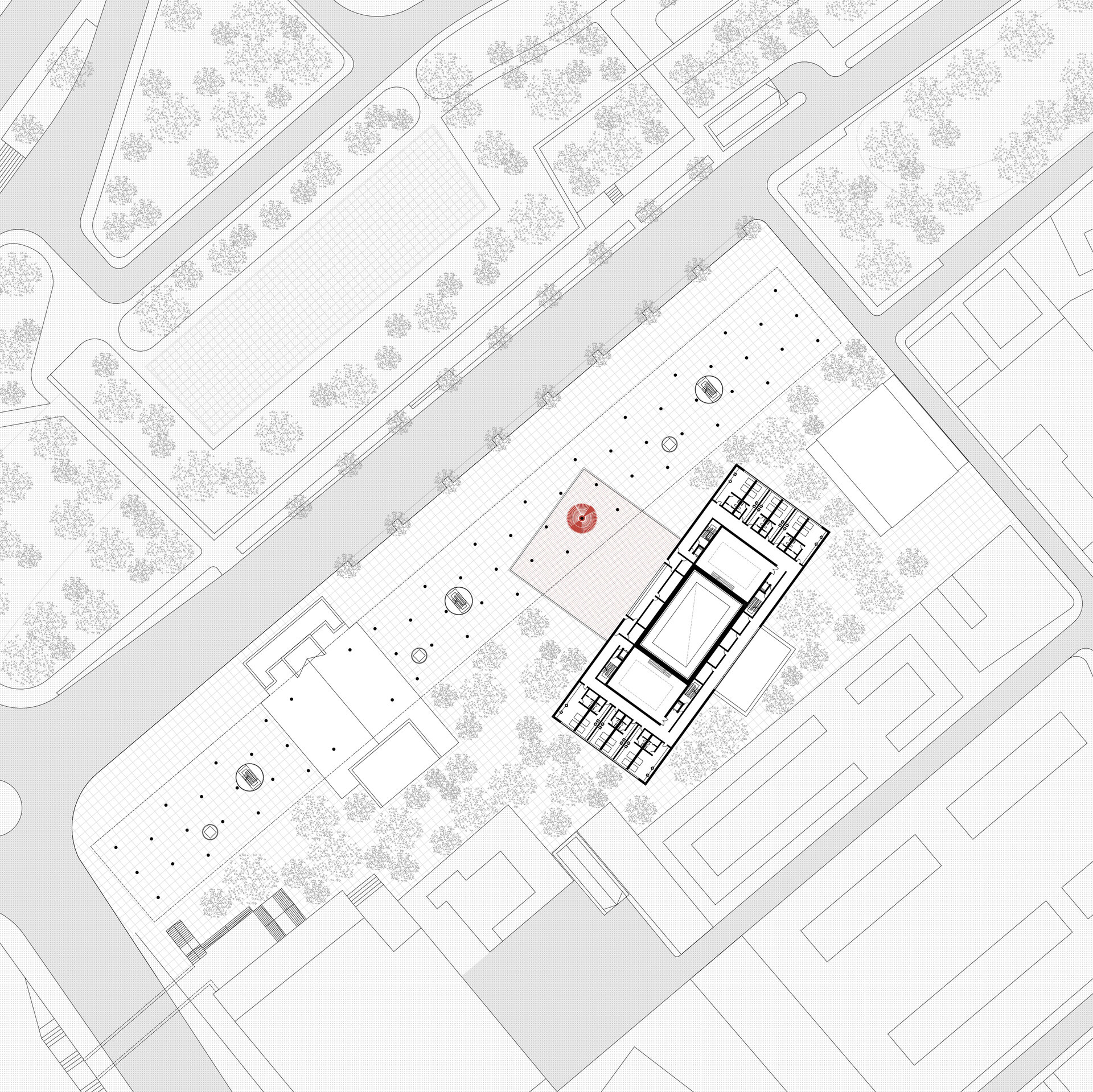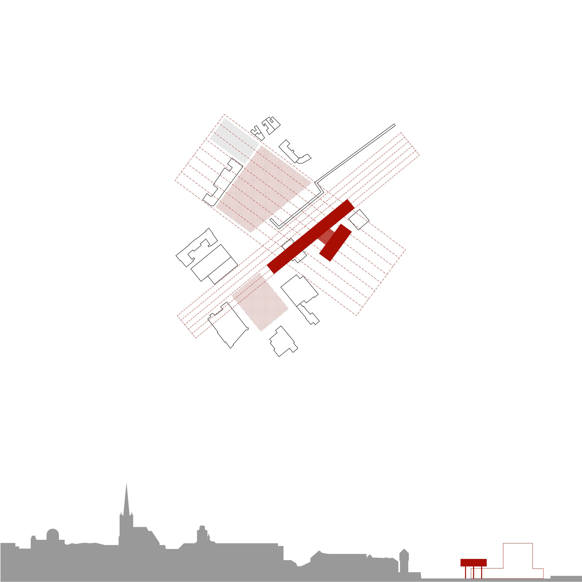 Amplasamentul studiat se află într-o zonă caracterizată de fragmentare, care are potențialul de a acționa ca un spațiu de tranziție, estompând limitele atât între oraș și teatru, cât și între fondul istoric și cel nou. Un prim gest la nivelul cadrului urban este acela de a contura o limită clară și în același timp permeabilă între spațiul major definit de Hotelurile Continental Forum, Ramada și Casa Prima Ardeleană, respectiv spațiul minor definit de Hotelurile Ibis, Ramada și Casa de Cultură a Sindicatelor. Gestul este reprezentat de un element arhitectural detașat de sol care traversează situl în lungul acestuia.