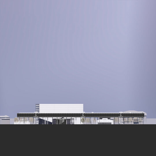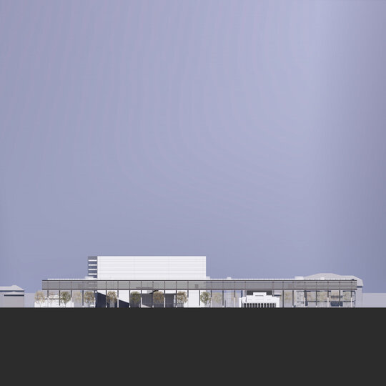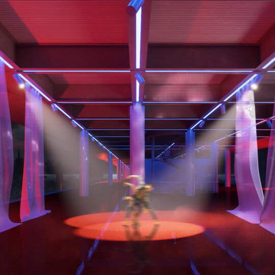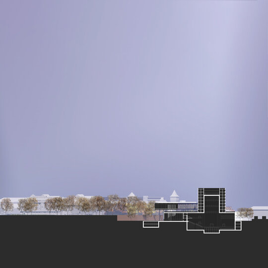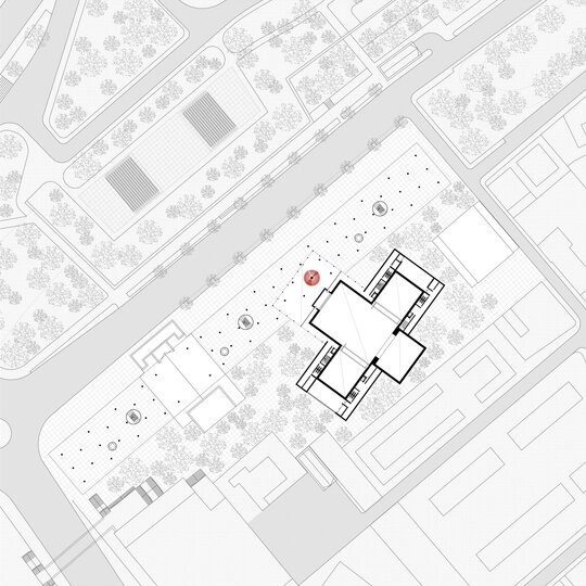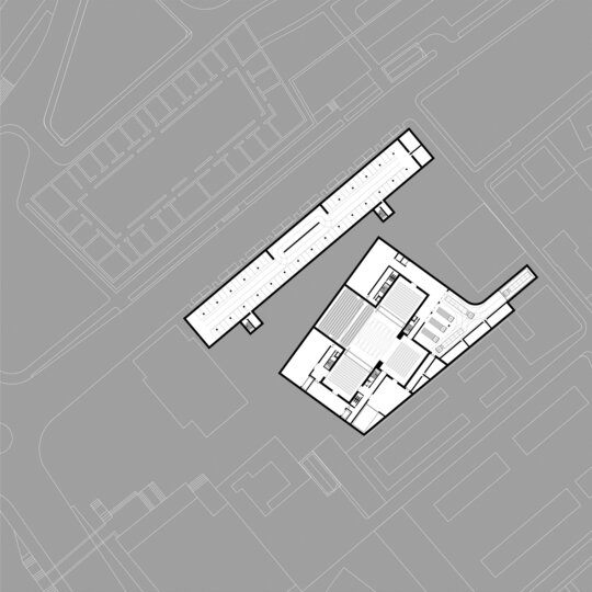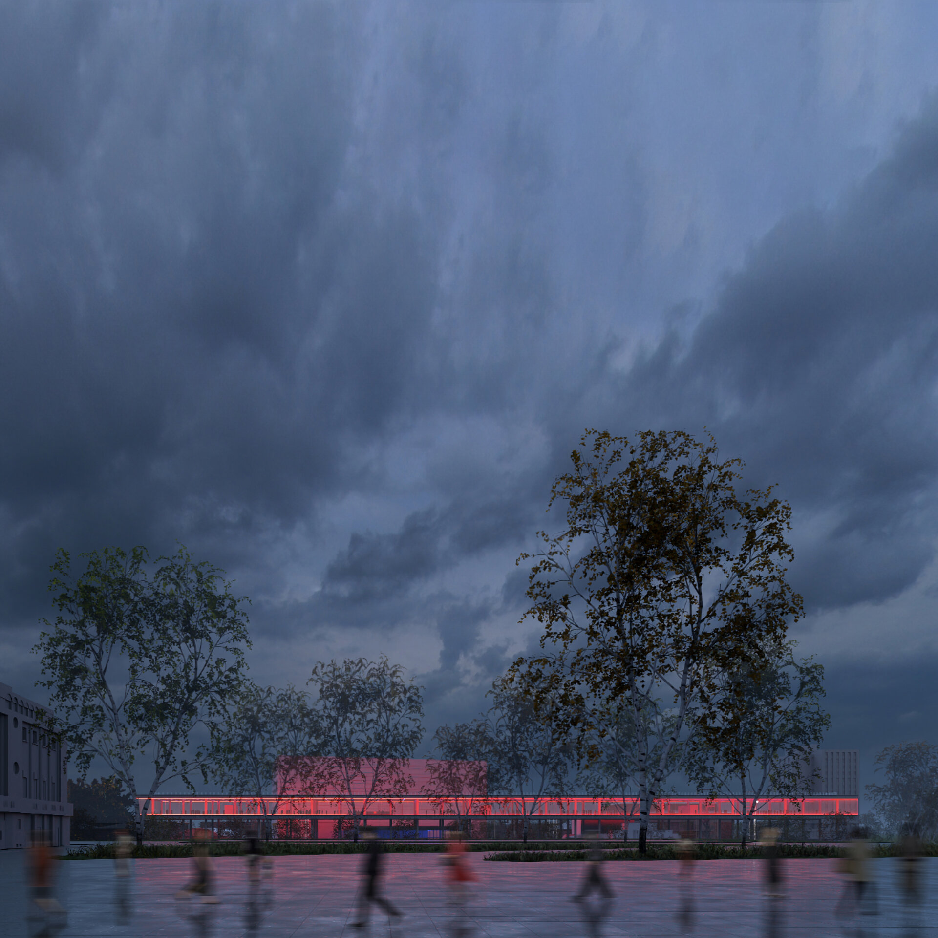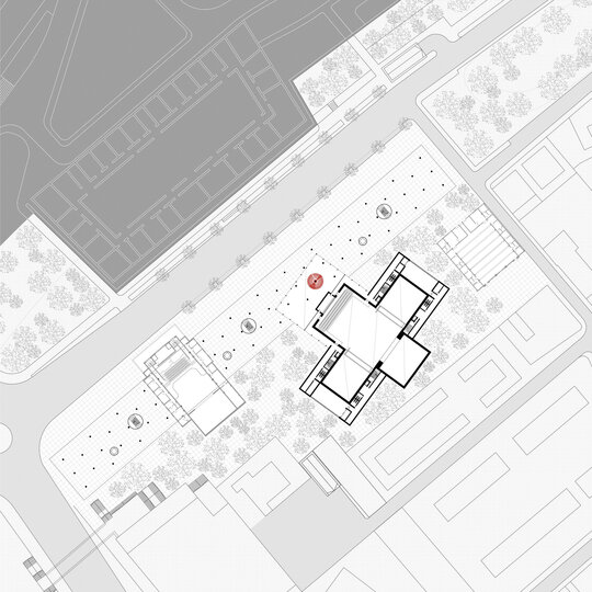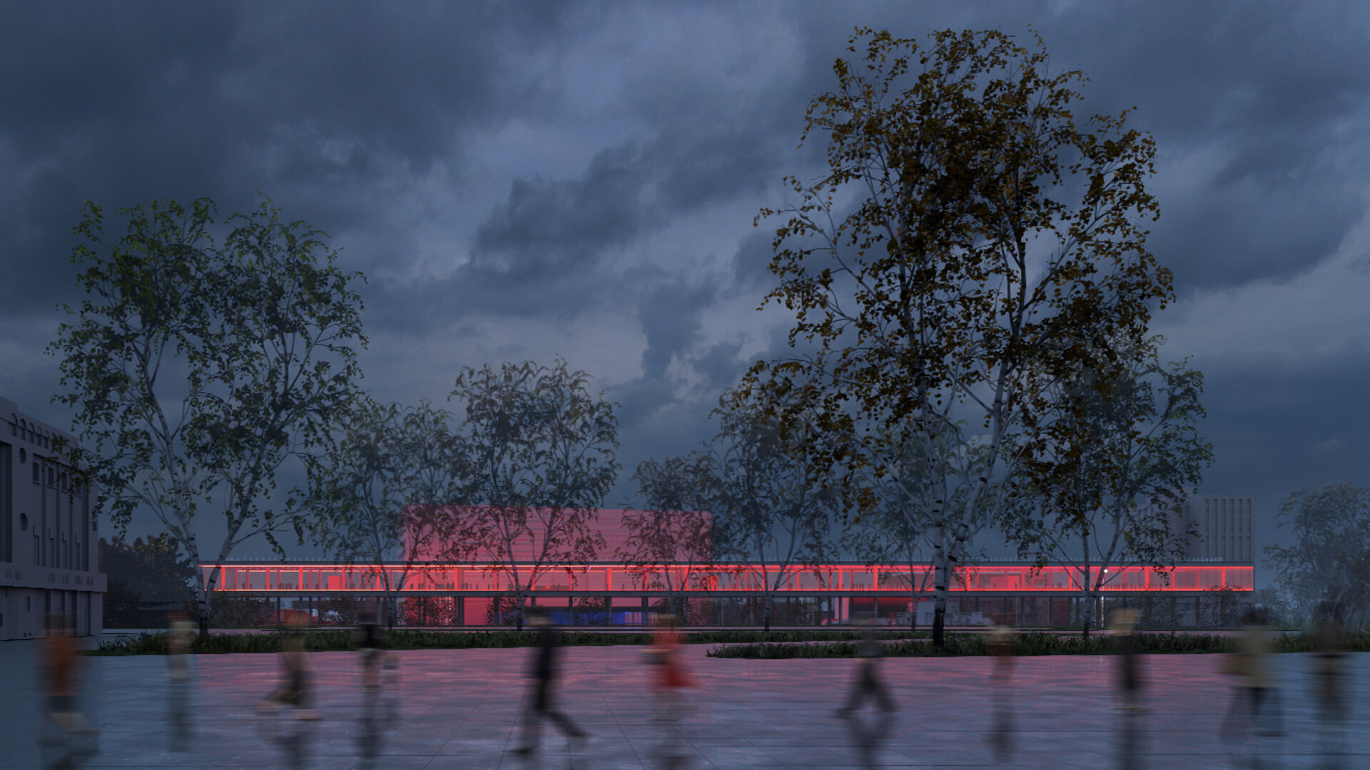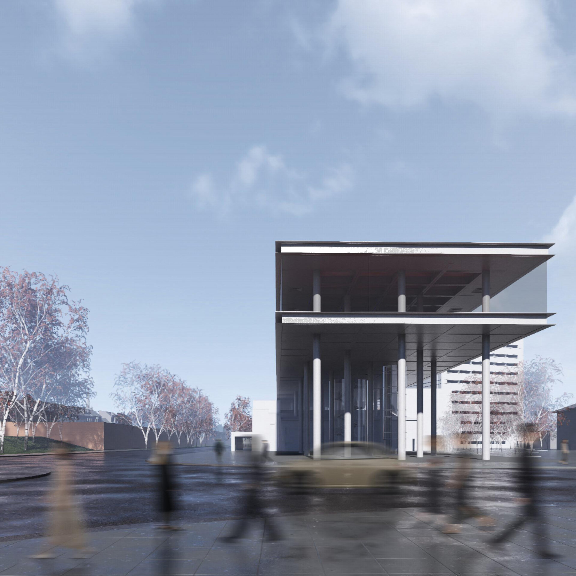 Pe de o parte, propunerea arhitecturală urmărește oferirea unui răspuns formal în planul apropiat, respectiv prezenței zidului fostei Cazărmi 90, prin eliberarea parterului de tensiunea constituită de acesta. Volumul rotit comunică, pe de altă parte, cu planul secund, din care fac parte Hotelul Continental Forum, Parcul Astra și orașul istoric, creând astfel un cadru al spectacolului pentru toți participanții la spațiul public. În același timp, gestul are intenția de a omogeniza spațiul prin conectarea sălii actualului Teatru Național Radu Stanca cu noua sală multifuncțională propusă prin proiect, precum și cu fostul pavilion expozițional al Târgurilor de Mostre din anii 1930 - 1940.