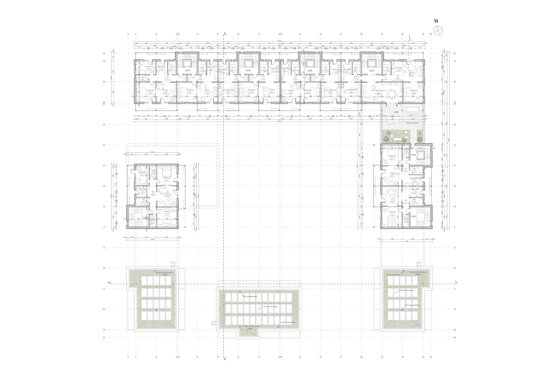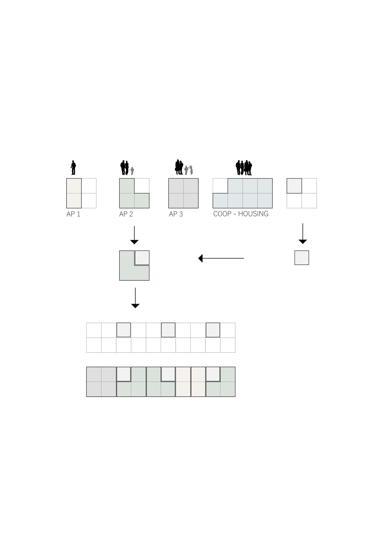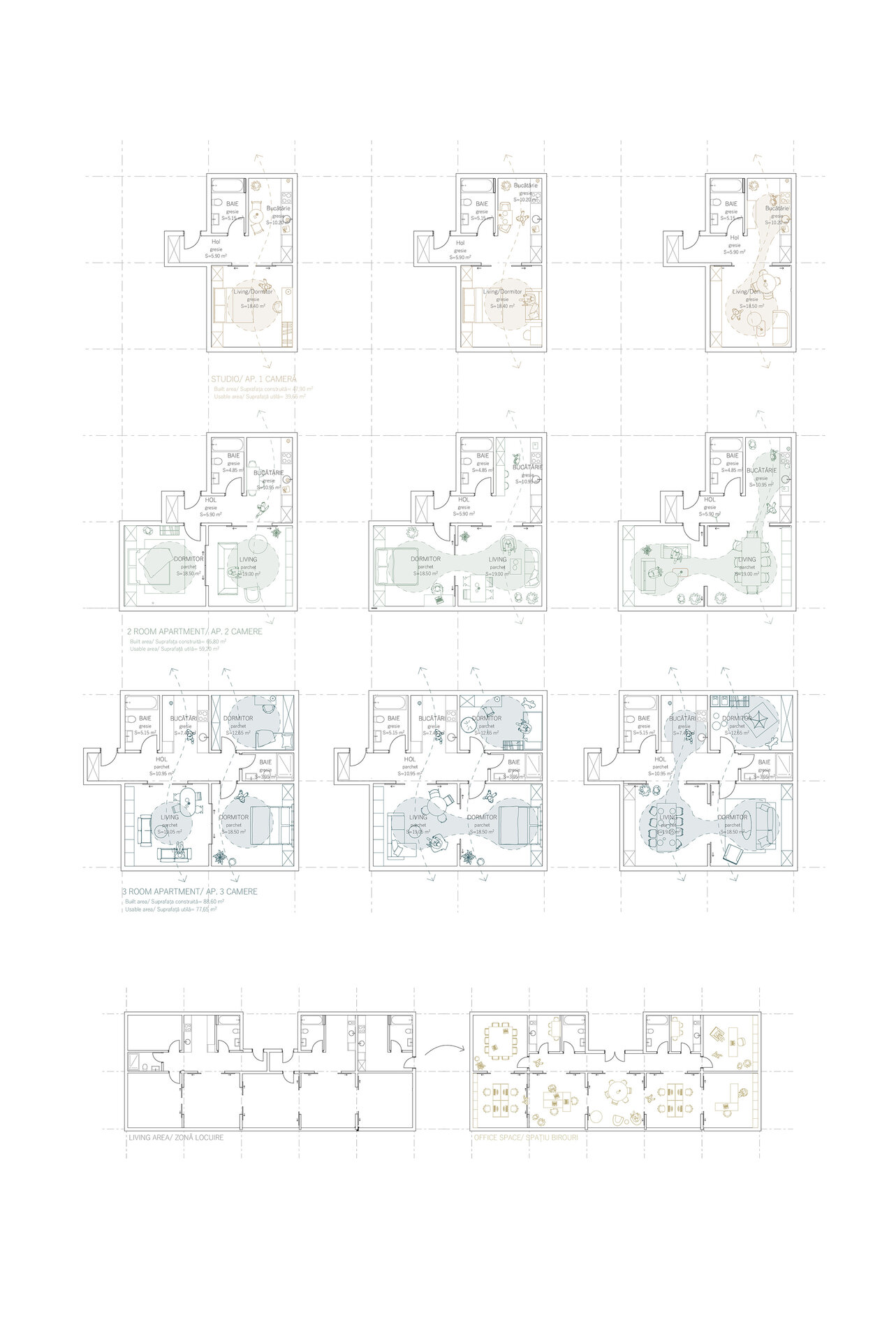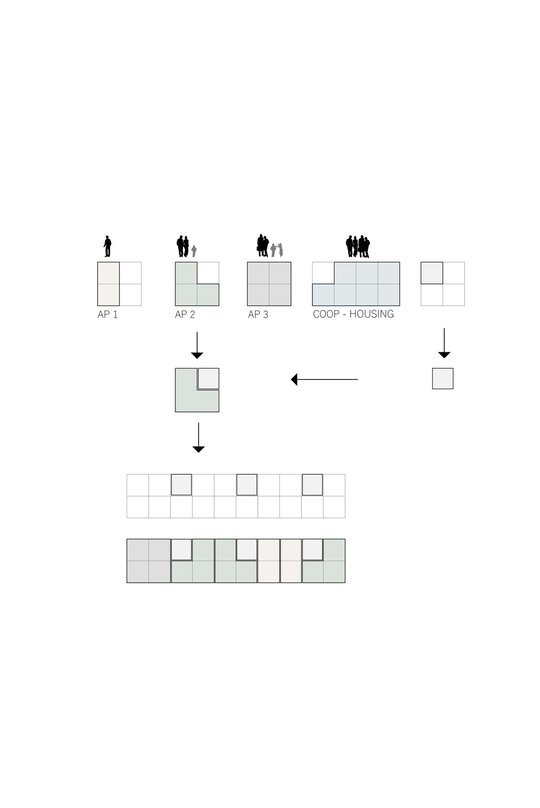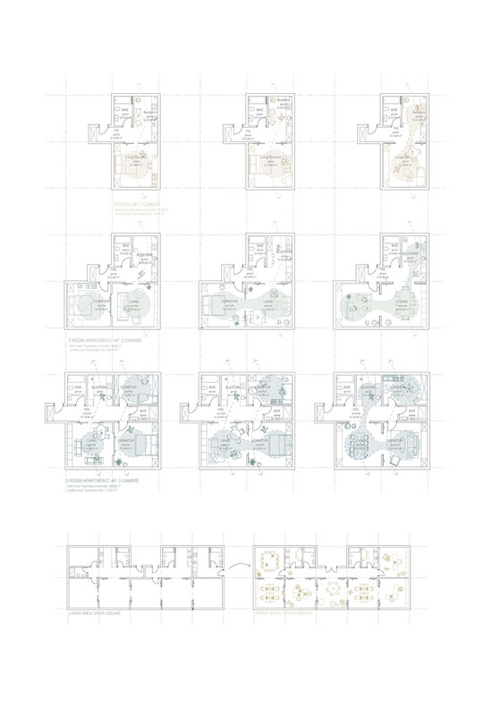 Etajele superioare sunt destinate locuirii. Ansamblul oferă o varietate de tipologii de apartamente, de la garsoniere până la apartamente de 4 camere și zone de co-living. Pentru o eficiență economică și energetică am optat pentru un sistem modular, o structură de tip grilă de 4,5x4,5 m. Apartamentele au o dublă orientare și sunt gândite din două componente, zonele private și zonele comune. Combinând aceste module pot forma apartamente de diferite tipologii. Flexibilitatea joacă un rol important în cazul ansamblului, astfel spațiile sunt dimensionate în așa fel încât ele pot fi adaptate schimbărilor și necesităților ulterioare. Clădirea poate să-și modifice funcțiunea în timp (din locuințe în clădire de birouri).