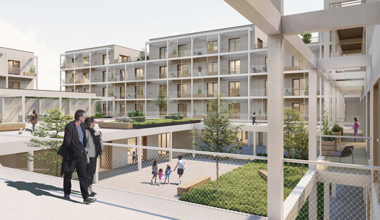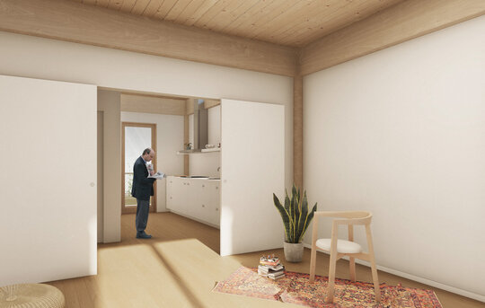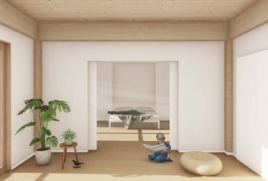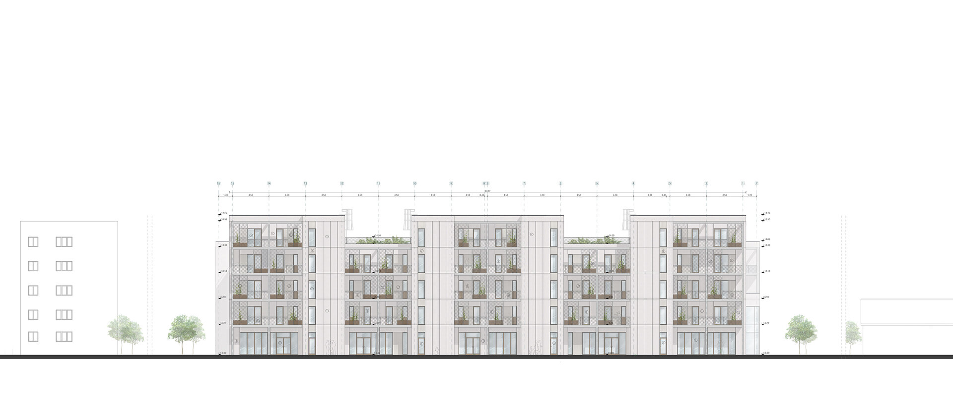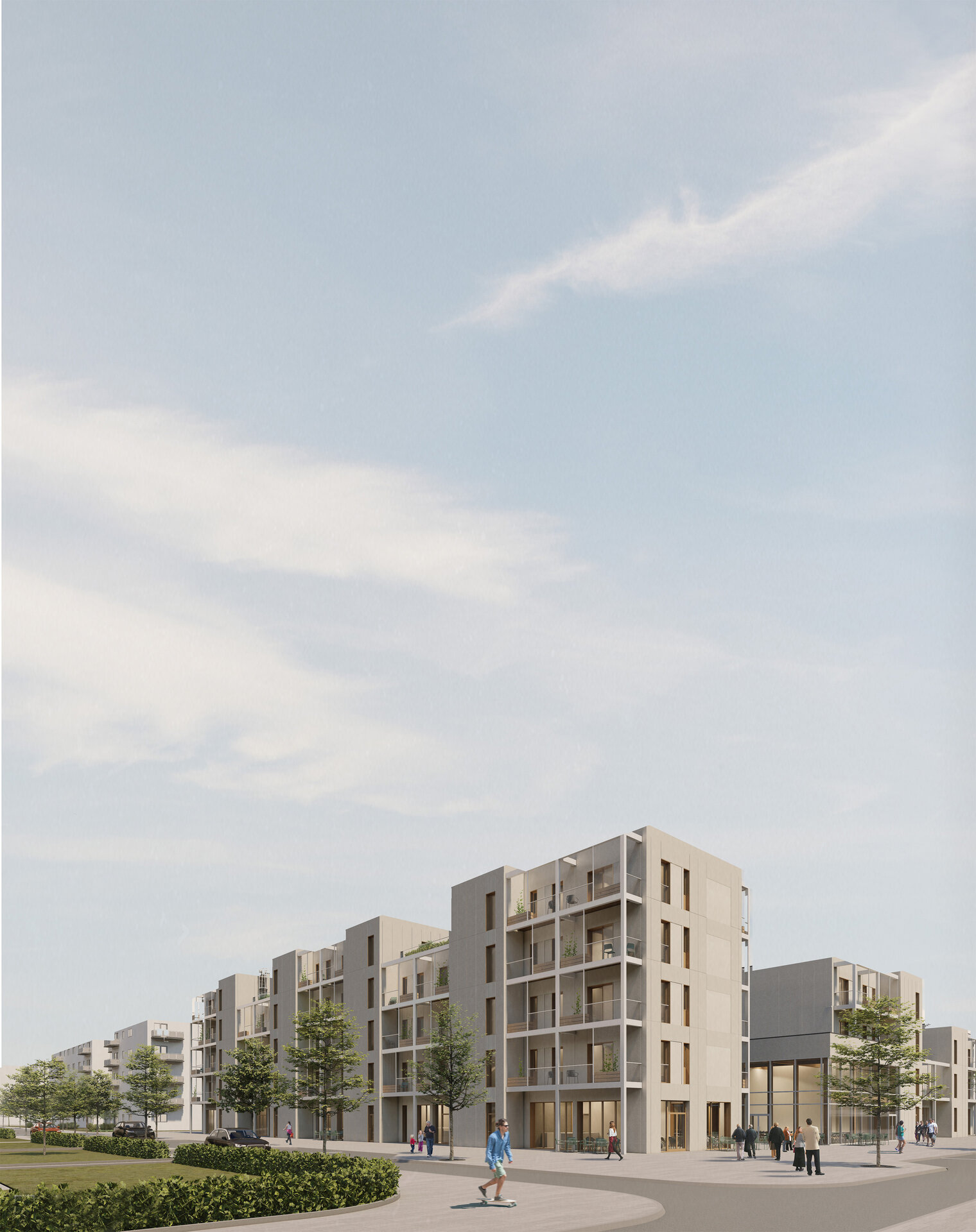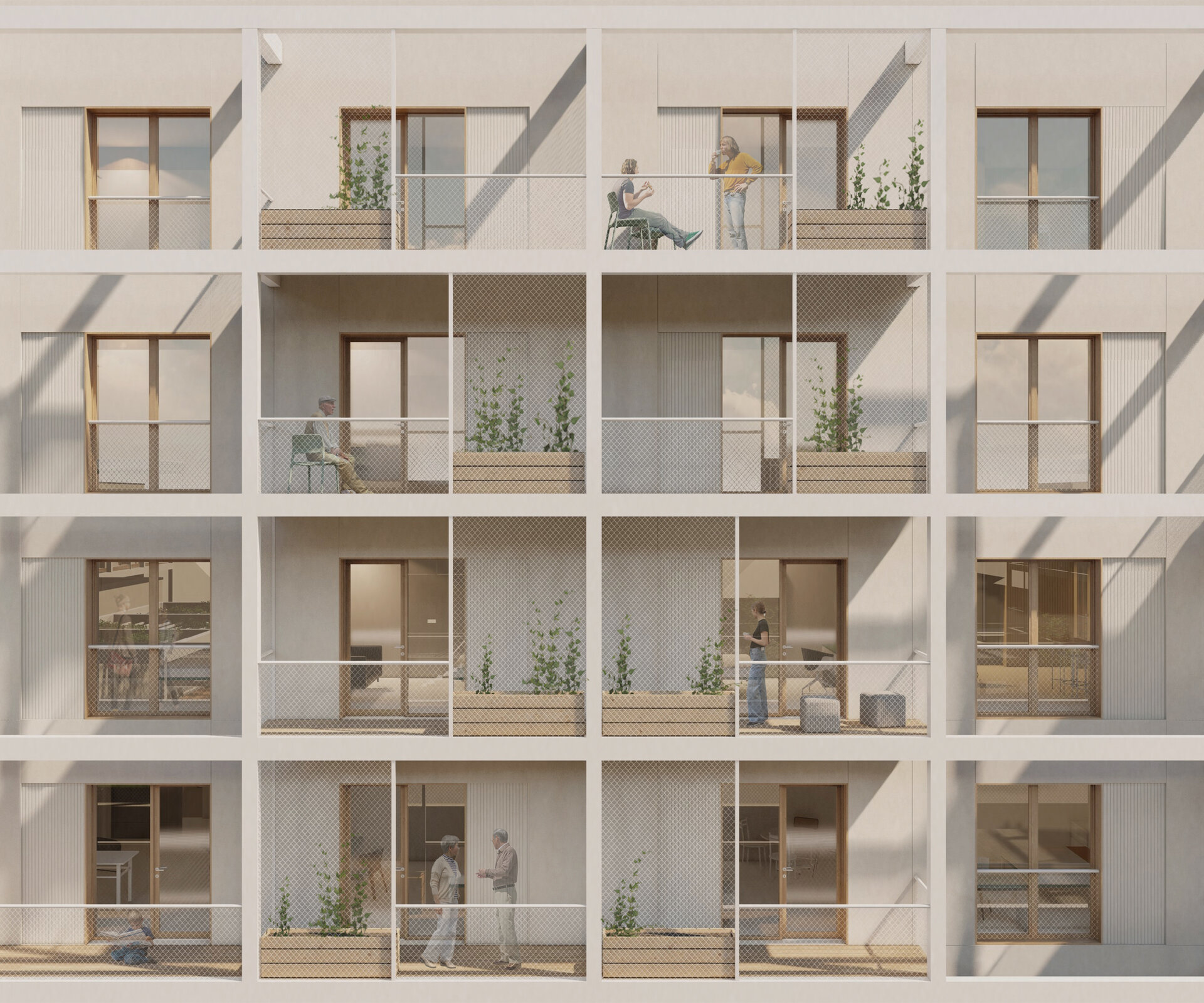 Etajele superioare sunt destinate locuirii. Ansamblul oferă o varietate de tipologii de apartamente, de la garsoniere până la apartamente de 4 camere și zone de co-living. Pentru o eficiență economică și energetică am optat pentru un sistem modular, o structură de tip grilă de 4,5x4,5 m. Apartamentele au o dublă orientare și sunt gândite din două componente, zonele private și zonele comune. Combinând aceste module pot forma apartamente de diferite tipologii. Flexibilitatea joacă un rol important în cazul ansamblului, astfel spațiile sunt dimensionate în așa fel încât ele pot fi adaptate schimbărilor și necesităților ulterioare. Clădirea poate să-și modifice funcțiunea în timp (din locuințe în clădire de birouri).