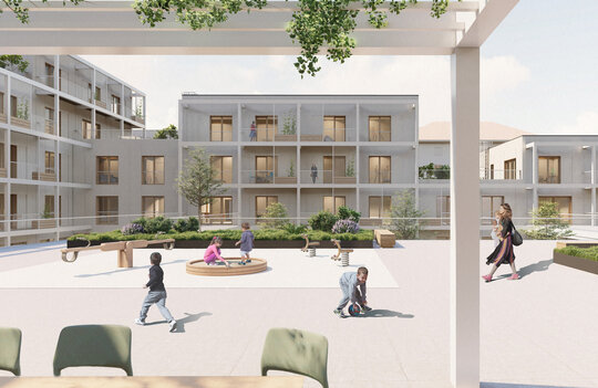 Proiectul oferă zone exterioare de socializare cu caractere diferite: promenada pietonală, curtea semi-publică, și terasele comune. Astfel am propus o ierarhizare a spațiilor exterioare pentru a lăsa loc manifestărilor de la individual la colectiv (grup de locatari și la comunitatea ansamblului și a vecinilor).