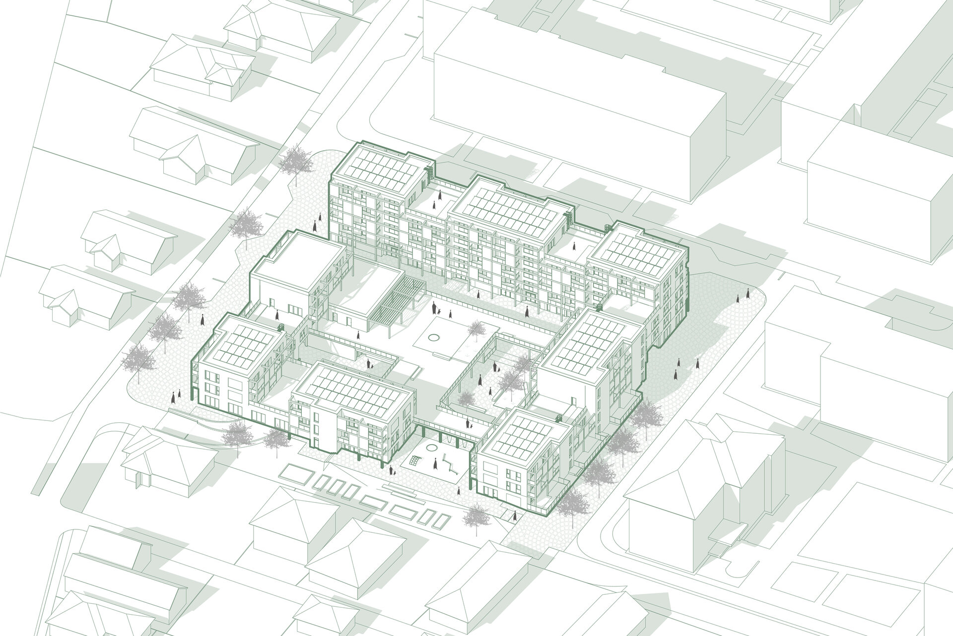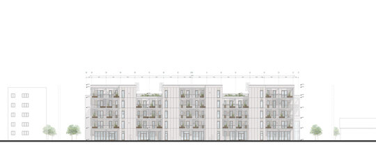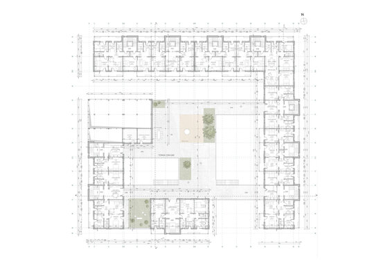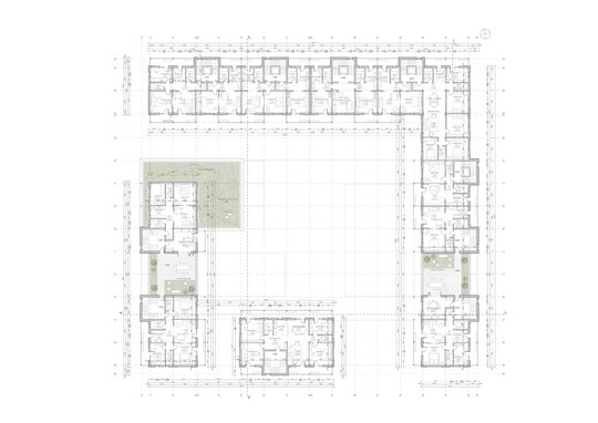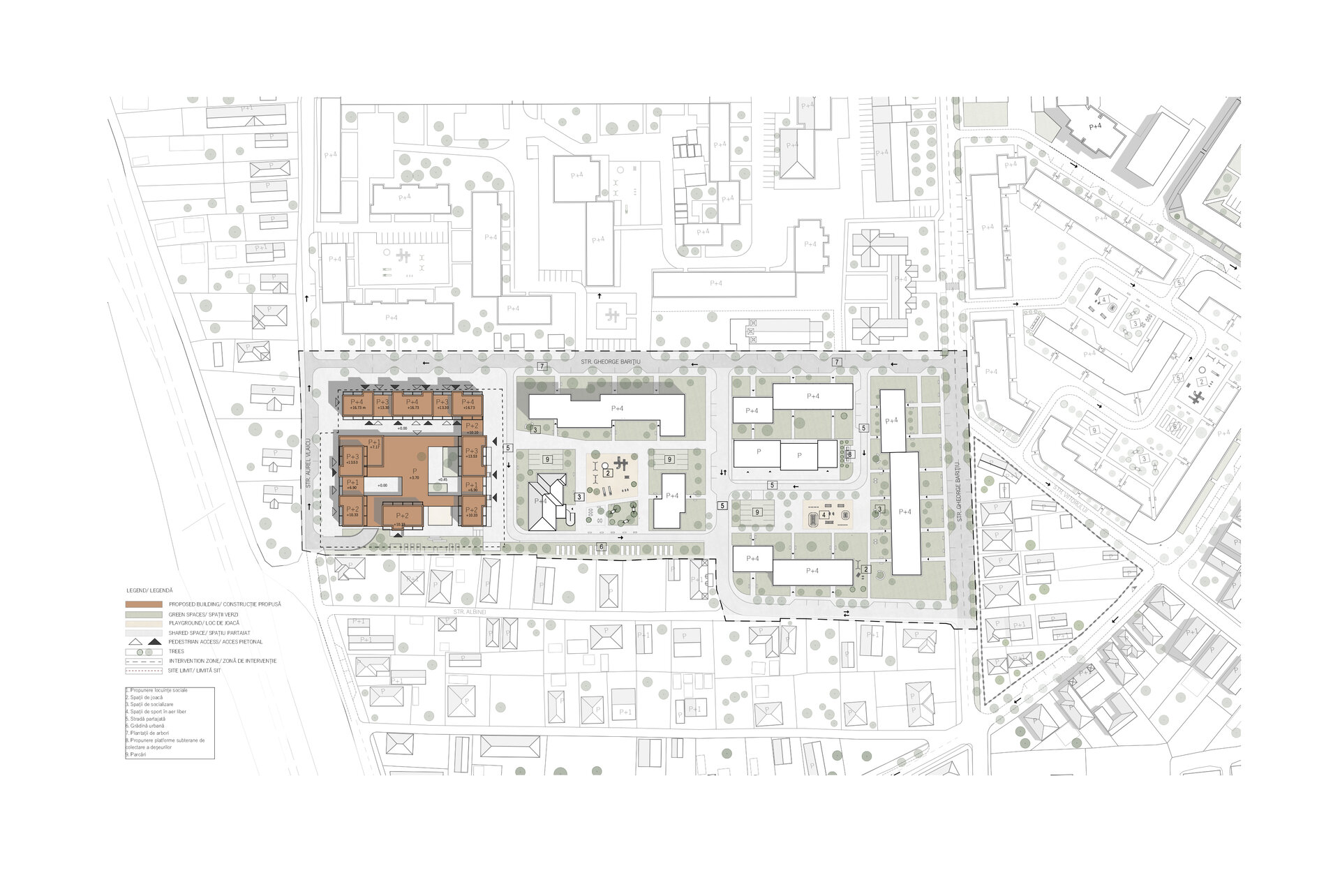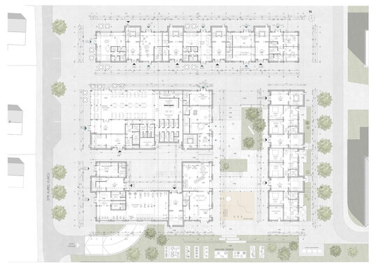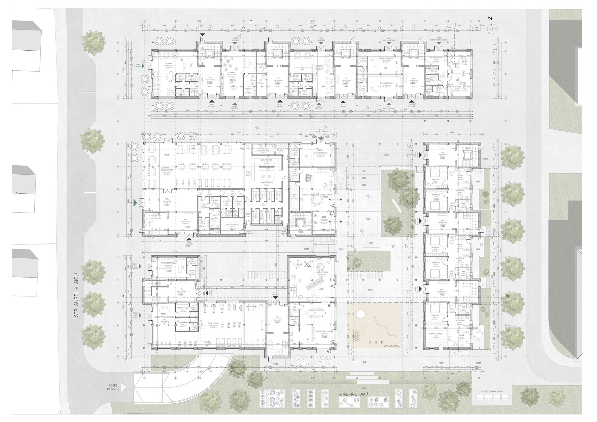 La parterul clădiri, către stradă se propun spații comerciale și diverse servicii, cu scopul de a elimina barierele sociale și de a spori interacțiunea între membrii comunității. Totodată ansamblul va îngloba și o cantină de ajutor social. Astfel toate grupurile sociale sunt încurajate să socializeze în zonele cu caracter public.