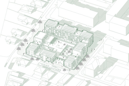 Conceptul proiectului se bazează pe crearea unei compoziții care să medieze trecerea de la locuințele colective la locuințele unifamiliale. Astfel la stradă se creează un front continuu în relație cu blocurile existente, după care volumele se descompun pentru o mai bună încadrare în context.