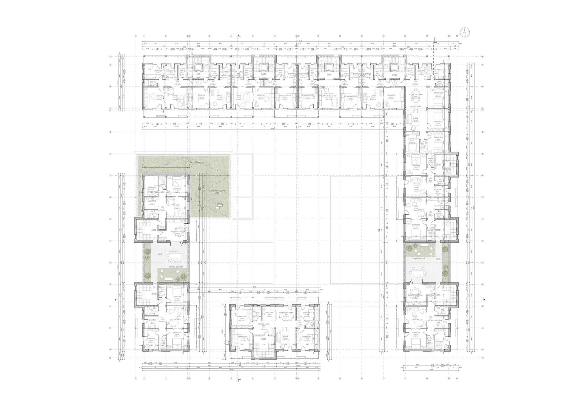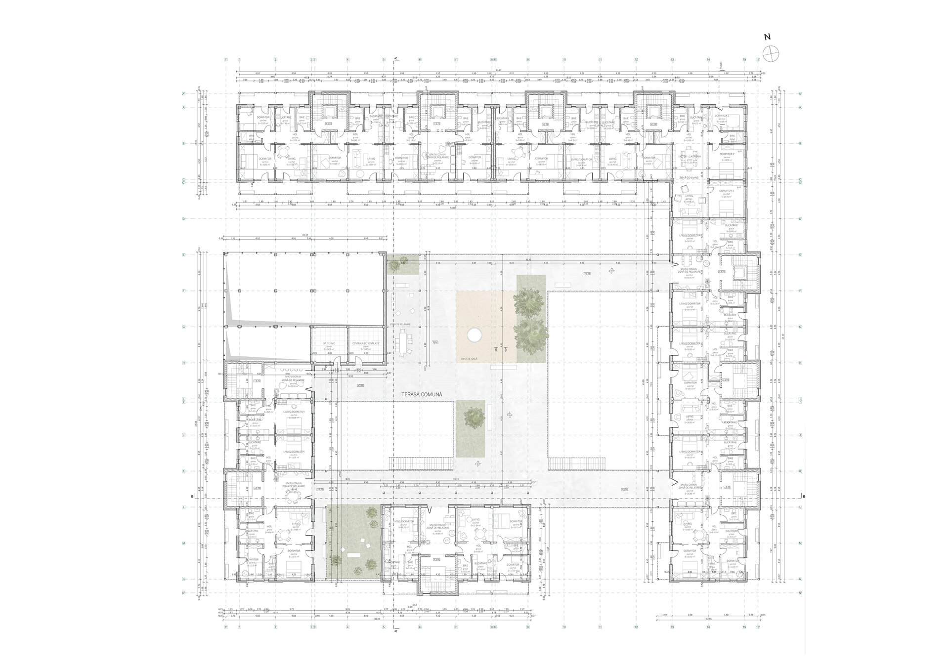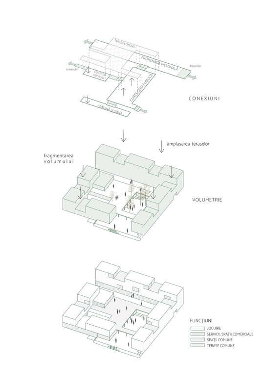 Cu scopul de a crea micro-comunități la fiecare etaj am propus o serie de spații comune sau terase. Acestea au rolul de a crea noi legături și de a oferi posibilitatea fiecărui individ de a se regăsi în unul dintre ele.