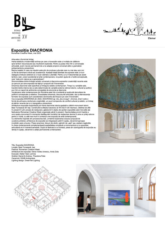 Arhitectura expoziției explorează prin tema diacroniei istoria spațială a clădirii-monument istoric Baia Turcească din Iași. Construită la sfârșitul secolului al XIX-lea în stil neomaur, clădirea se află în prezent în plin proces de restaurare, găzduind în stadiu de șantier expozițiile celor trei ediții ale festivalului Romanian Creative Week organizate până în prezent. Oportunitatea privirii înainte a unui spațiu-monument în momentul desfășurării lucrărilor de restaurare devine în sine un prilej valoros pentru o vizită, cu atât mai mult în contextul unei expoziții de artă contemporană.