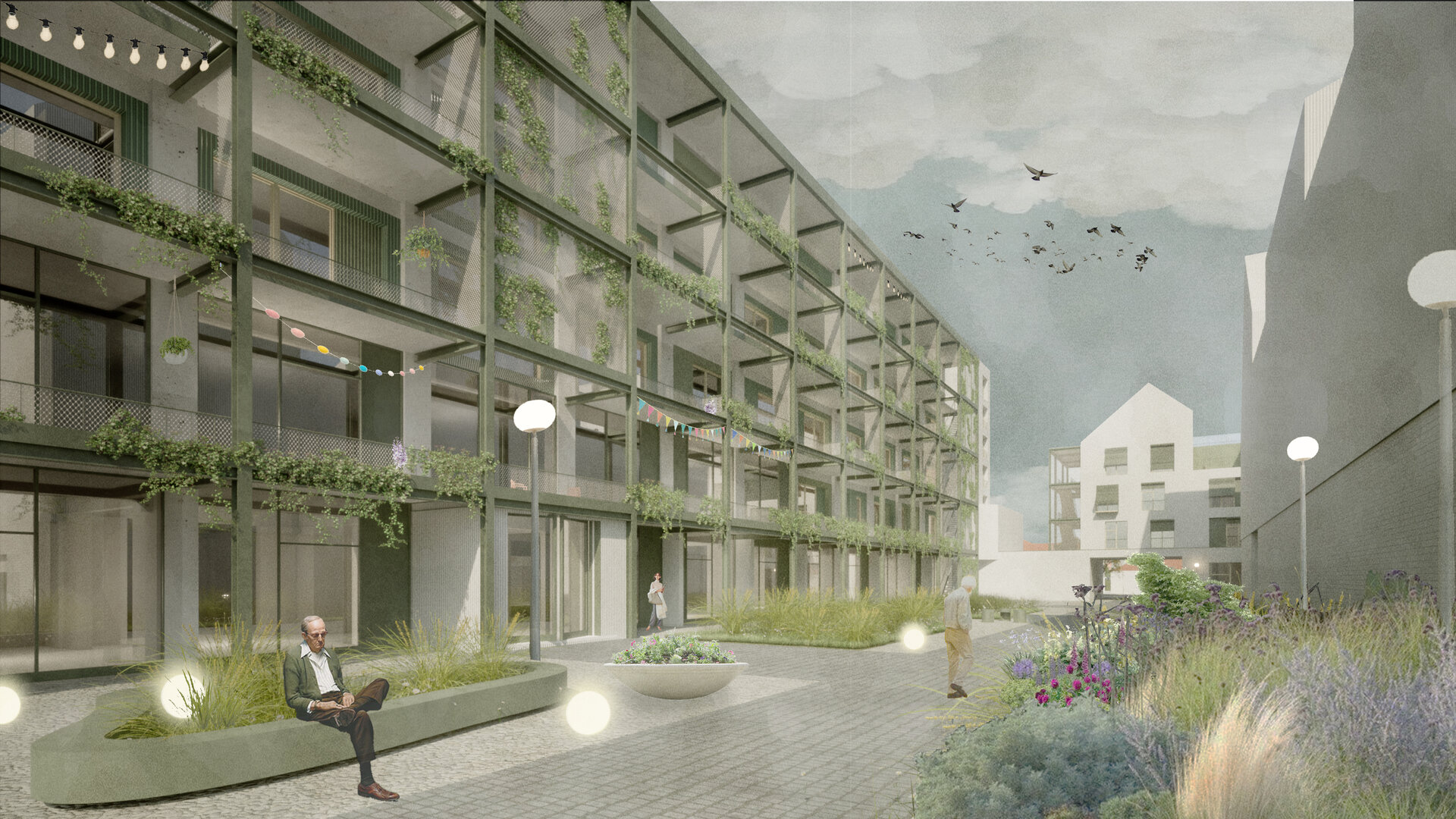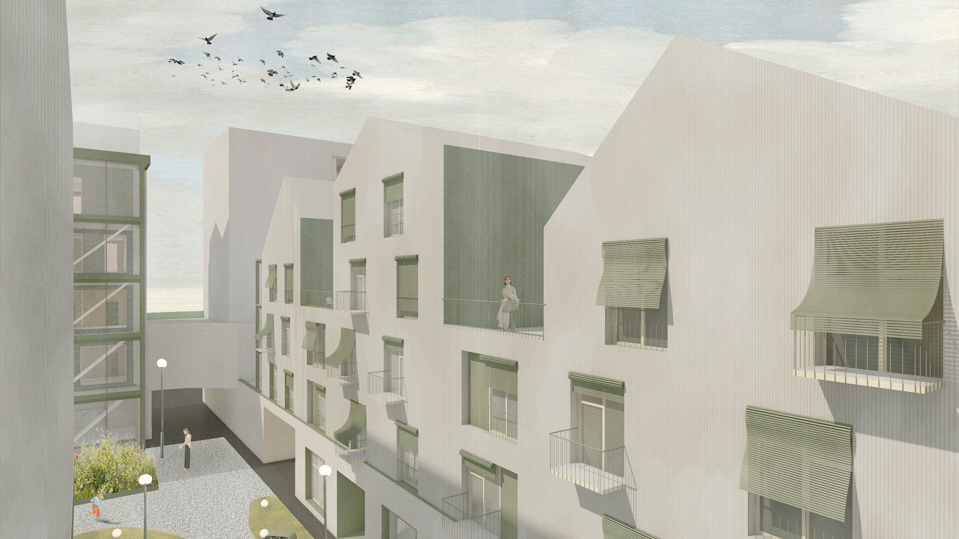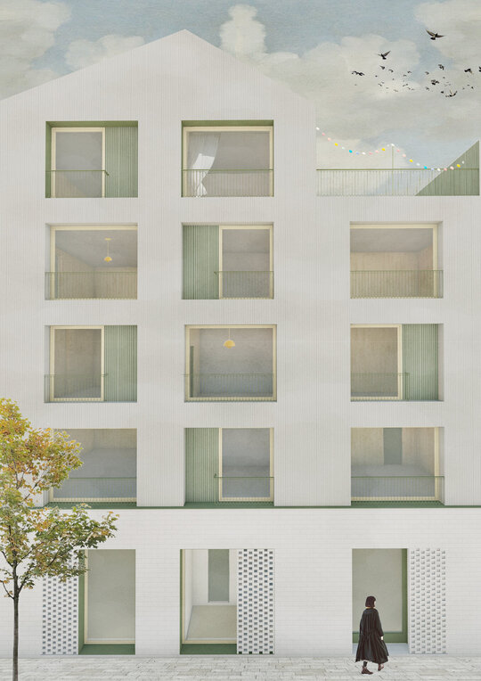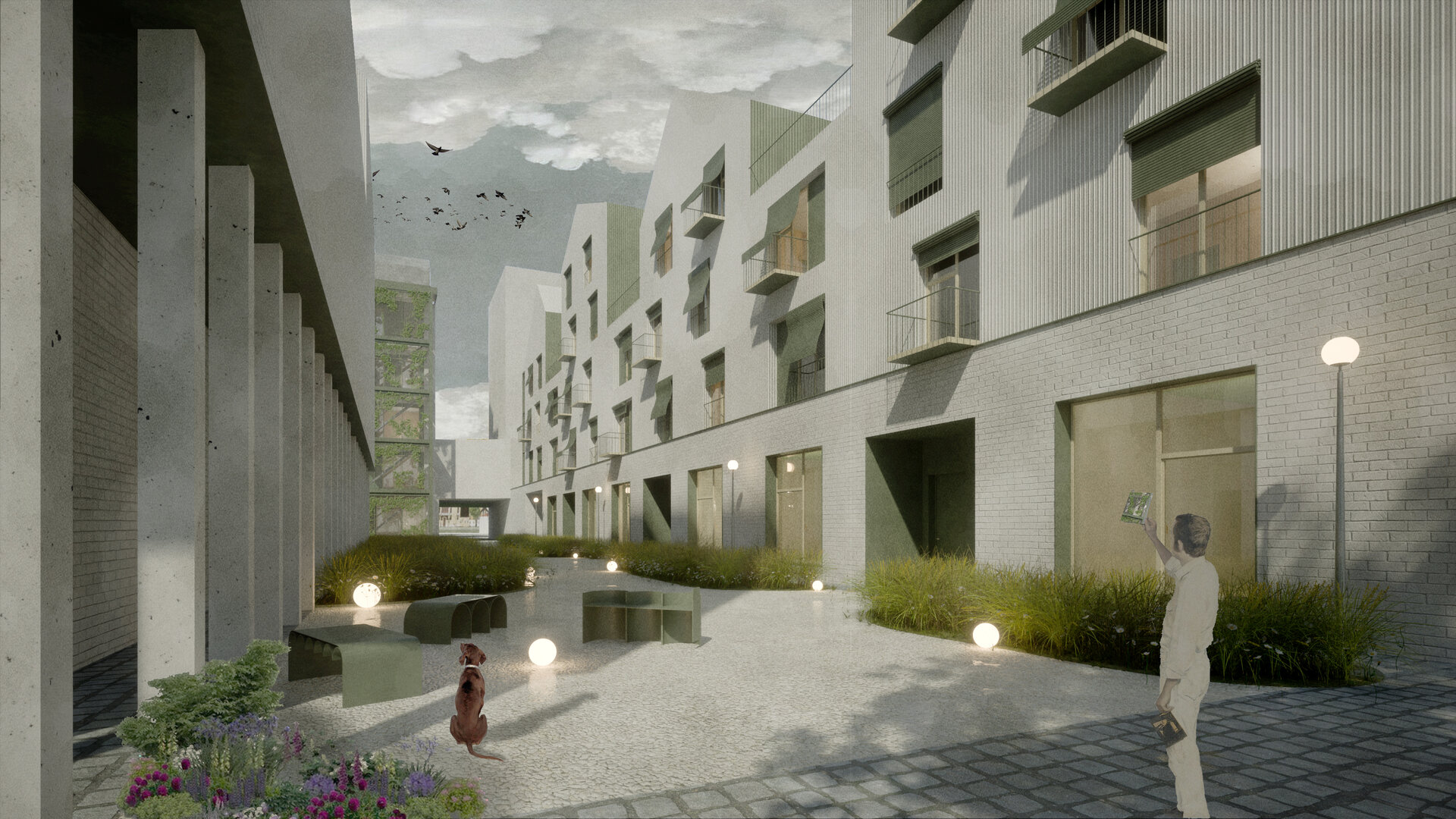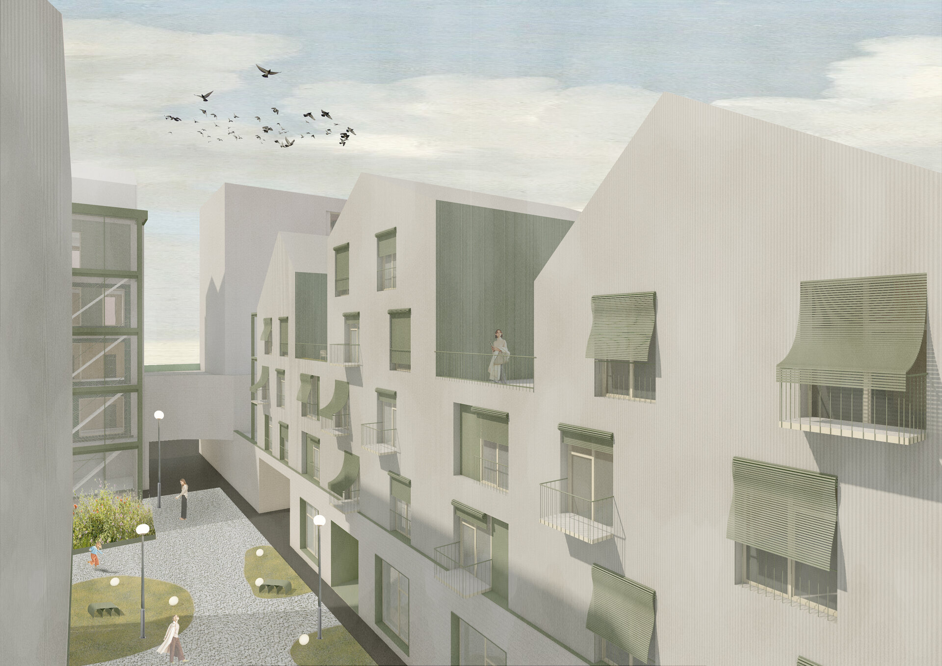 În jurul clădirii de locuințe colective, spațiul public apare ca nevoie a revitalizării zonei. După cum spune și Gehl, viața urbană e limitată atâta timp cât nu există posibilitatea fizică pentru desfașurarea ei. Astfel, intreg parterul este destinat unui public larg, adăpostind funcțiuni diverse pentru a anima zona, urmând ca nivelurile superioare a clădirilor să devină tot mai private, adăpostind locuinte. Diversitatea gamei de tipologii va atrage diferiti locuitori. Tipologiile sunt concepute pentru a oferi calități spațiale diferite de cele existente și se pot chiar permuta pentru a se potrivi diferitelor utilizări în timp. În cazul apartamentelor aflate în structurii existente, un nou strat de spațiu exterior este adăugat: fiecare apartament este prevăzut cu un balcon generos, o extensie a spațiului interior.