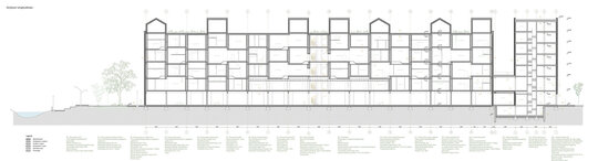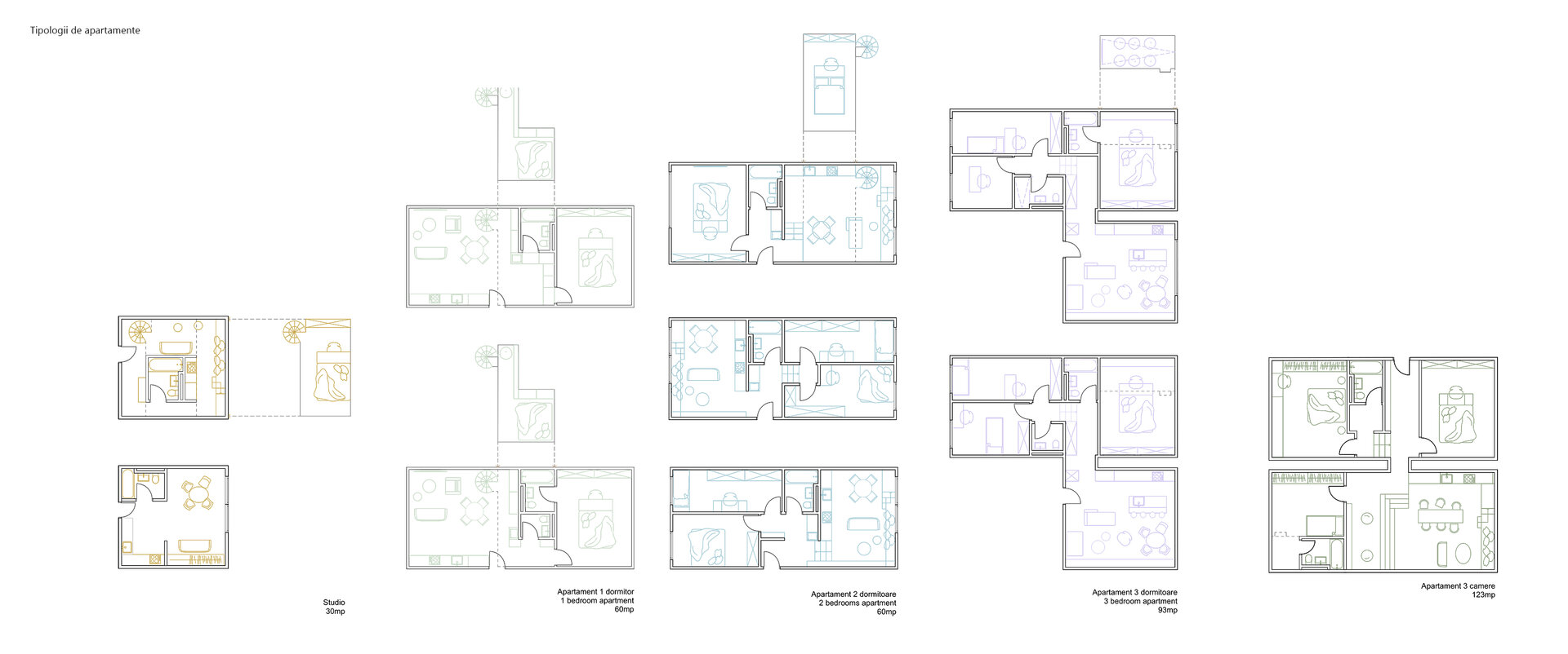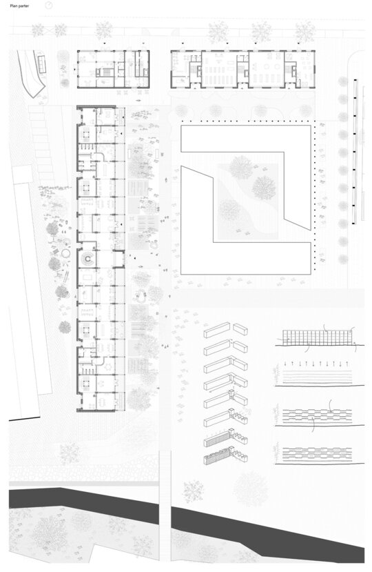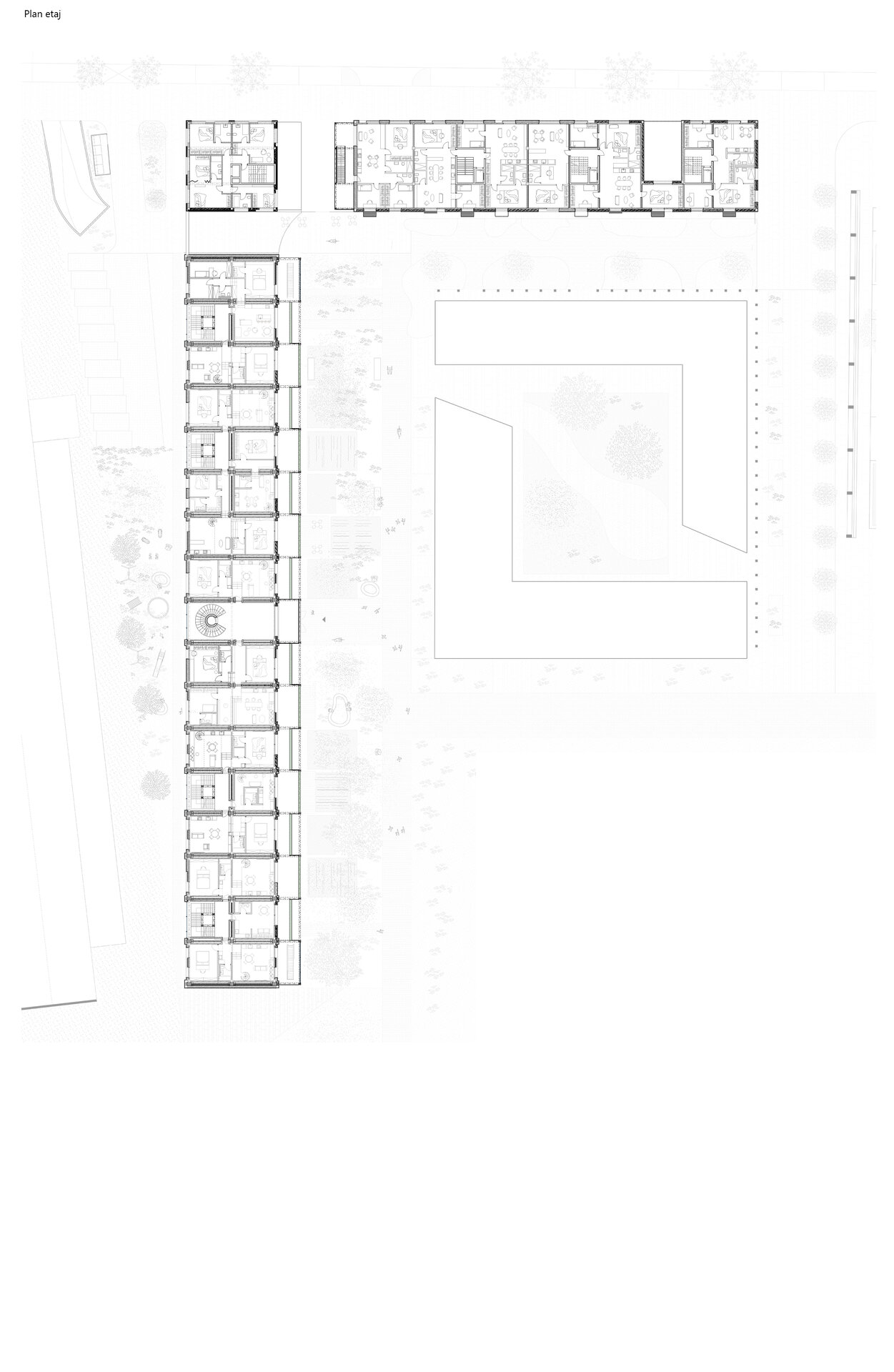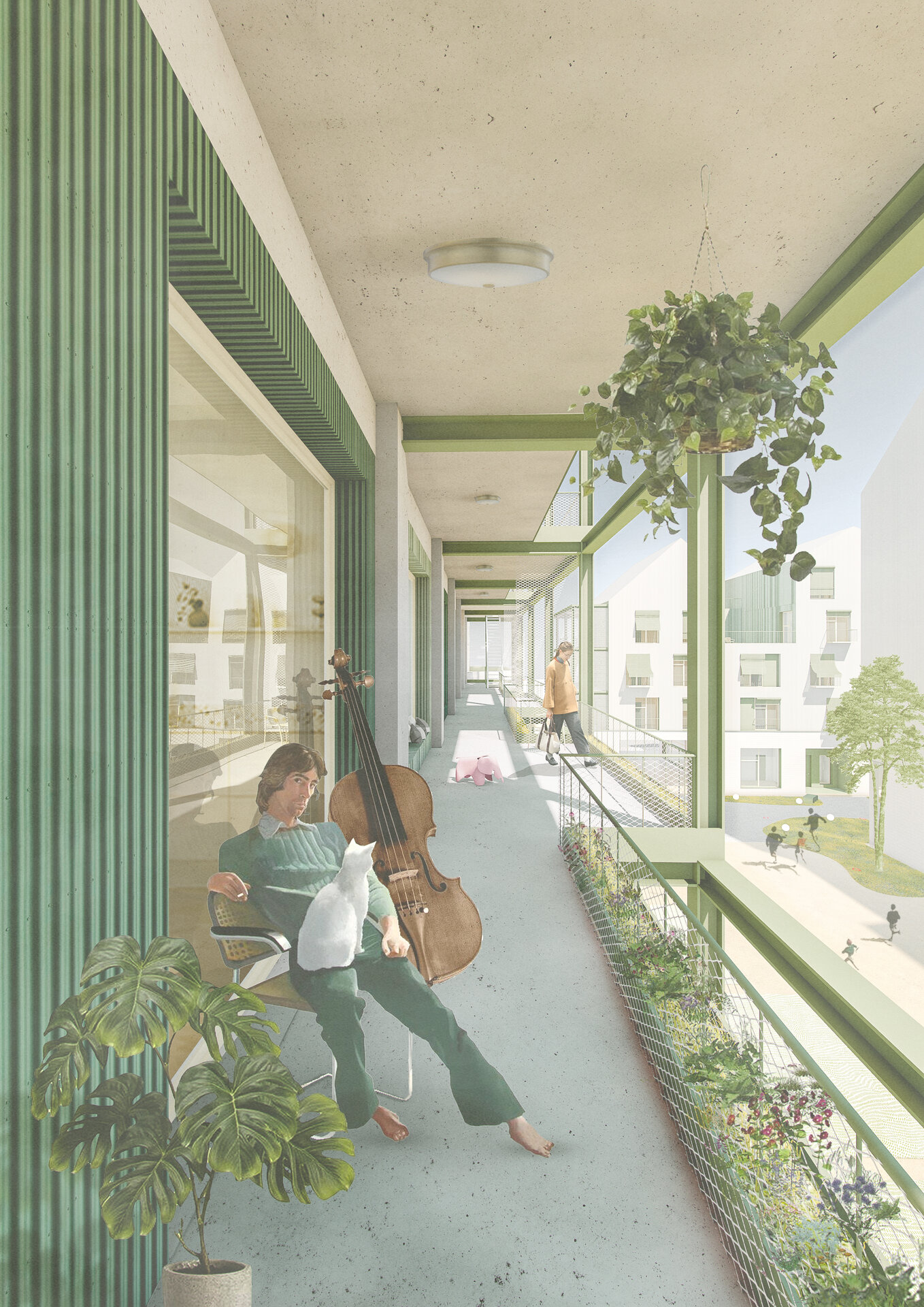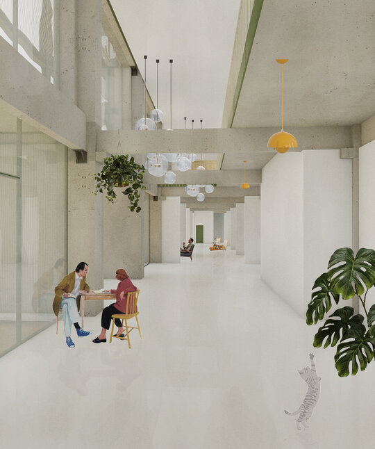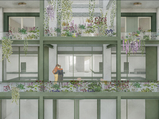 În jurul clădirii de locuințe colective, spațiul public apare ca nevoie a revitalizării zonei. După cum spune și Gehl, viața urbană e limitată atâta timp cât nu există posibilitatea fizică pentru desfașurarea ei. Astfel, intreg parterul este destinat unui public larg, adăpostind funcțiuni diverse pentru a anima zona, urmând ca nivelurile superioare a clădirilor să devină tot mai private, adăpostind locuinte. Diversitatea gamei de tipologii va atrage diferiti locuitori. Tipologiile sunt concepute pentru a oferi calități spațiale diferite de cele existente și se pot chiar permuta pentru a se potrivi diferitelor utilizări în timp. În cazul apartamentelor aflate în structurii existente, un nou strat de spațiu exterior este adăugat: fiecare apartament este prevăzut cu un balcon generos, o extensie a spațiului interior.