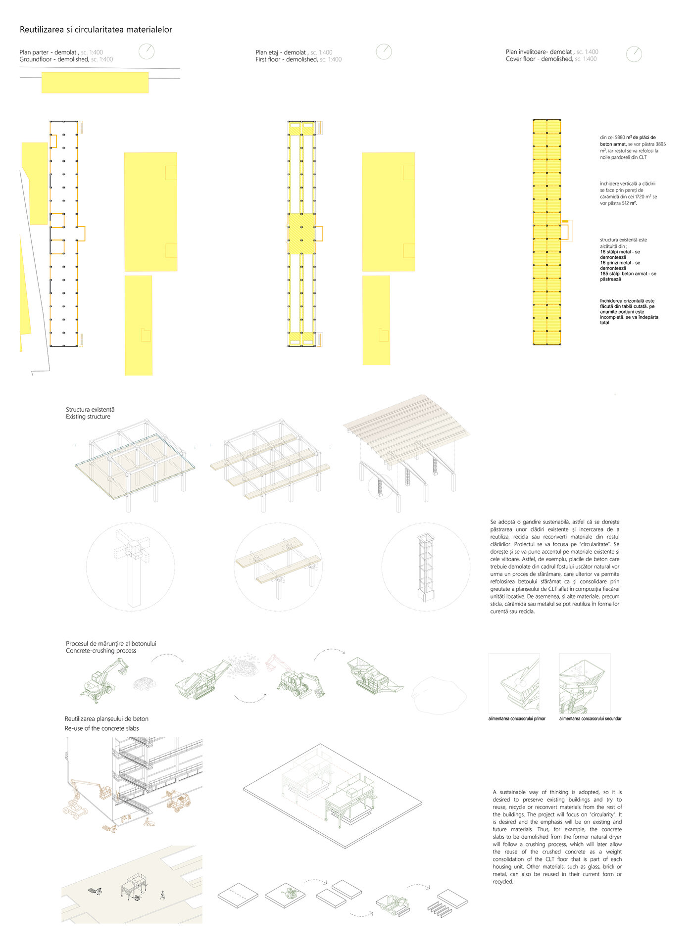 Se adoptă o gandire sustenabilă, astfel că păstrarea unor clădiri existente ajută atât la păstrarea vie a memoriei locului, însă sustine si procesul de reutilizare, reciclare sau reconvertire a materialelor rezultate din procesul de demolare al clădirilor. Proiectul se va focusa pe “circularitate”. Atenția este îndreptată înspre materiale existente și cele viitoare. Astfel, de exemplu, placile de beton care trebuie demolate din cadrul fostului uscător natural vor urma un proces de sfărâmare, care ulterior va permite refolosirea betoului sfărâmat ca și consolidare prin greutate a planșeului de CLT aflat în compoziția fiecărei unități locative. De asemenea, și alte materiale, precum sticla, cărămida sau metalul se pot reutiliza în forma lor curentă sau recicla.
