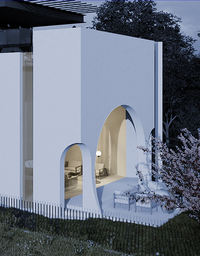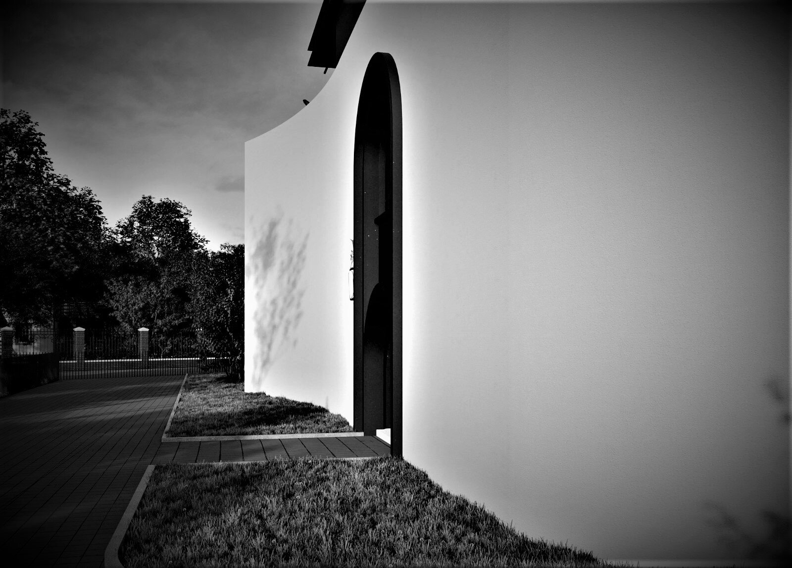 Fațada laterală stânga, una dintre laturile scurte ale locuinței, este definită de arcade supradimensionate ce se proiectează pe o suprafață vitrată amplă. Pe fațada principală se realizeaza accesul în clădire printr-un gang cu boltă semicilindrică într-o culoare contrastantă ce străpunge suprafața plină, albă a fațadei.
