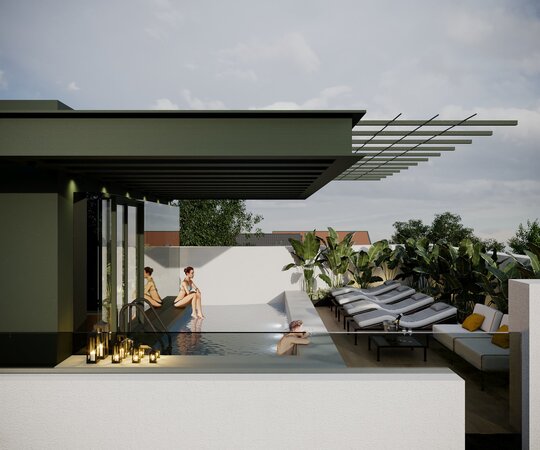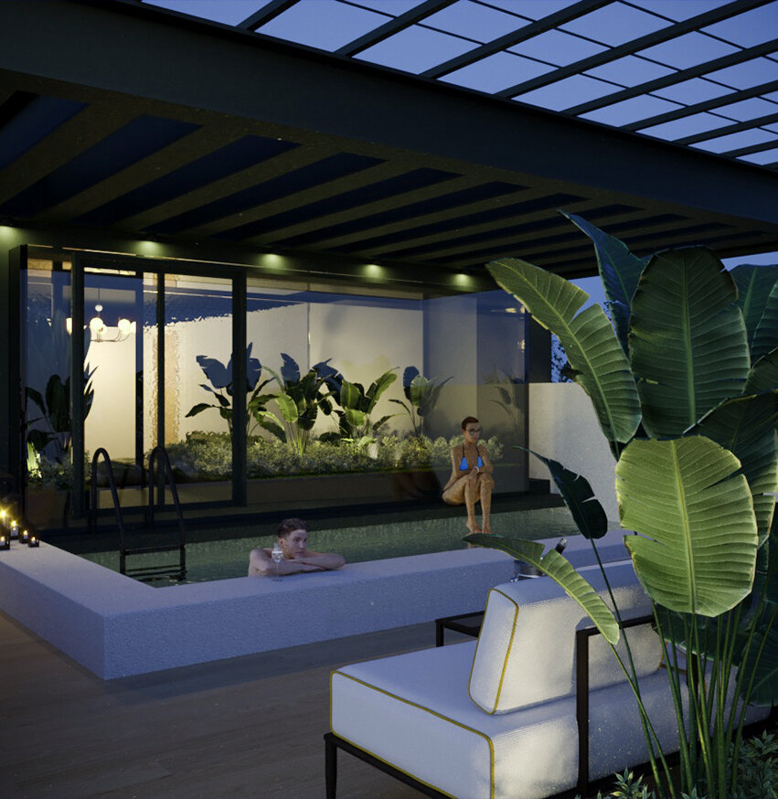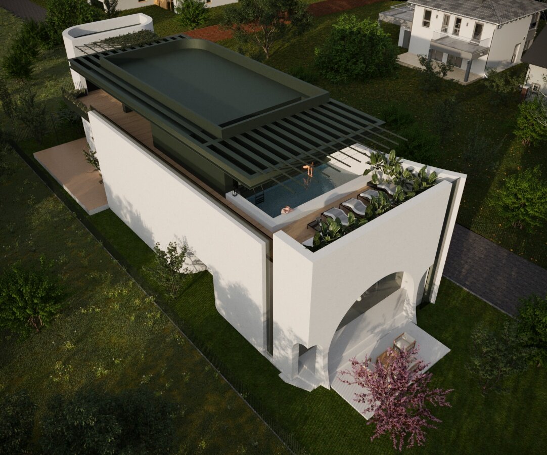 Descriere proiect. Volumul principal adăpostește funcțiunile esențiale ale unei locuințe individuale, respectiv living și bucătărie la parter, două dormitoare la primul etaj și dormitorul matrimonial cu seră și o mică piscină la ultimul etaj. În contextul unei rutine zilnice încărcate de stres, sedentarism, multe ore petrecute în fața calulatorului, omul modern are nevoie de o oază de verdeață care să ii fie la îndemână pentru a-și restabili echilibrul fizic și emoțional.