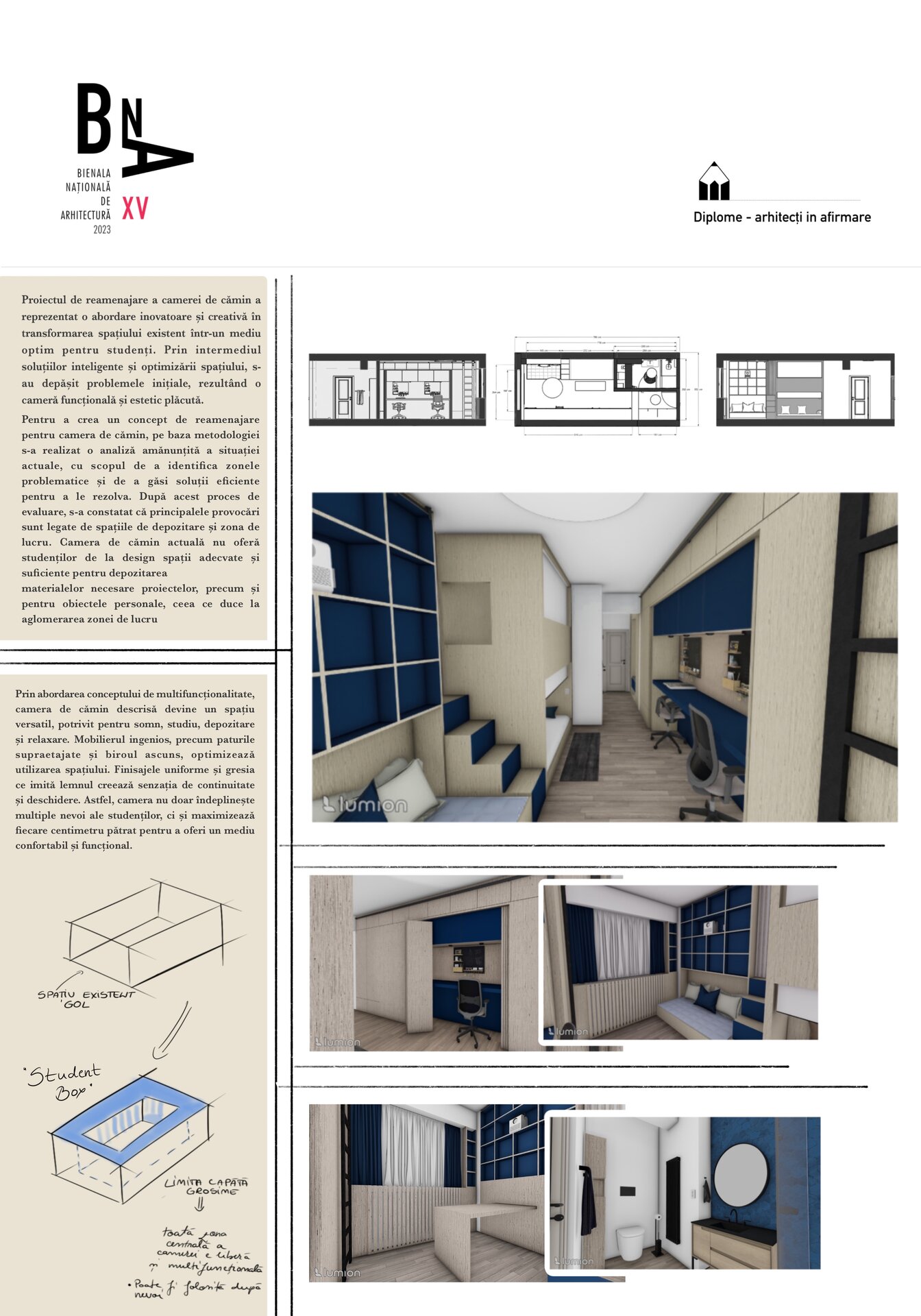 Proiectul de reamenajare a camerei de cămin a transformat un spațiu inițial neatractiv și dezorganizat într-un mediu modern și funcțional pentru studenți. Camera a fost reconfigurată pentru a maximiza utilizarea spațiului, oferind zone distincte pentru dormit, studiu și relaxare. Mobilierul inteligent a adăugat eficiență și funcționalitate. Rezultatul final este o cameră optimizată, adaptată nevoilor și ritmului de viață al studenților.