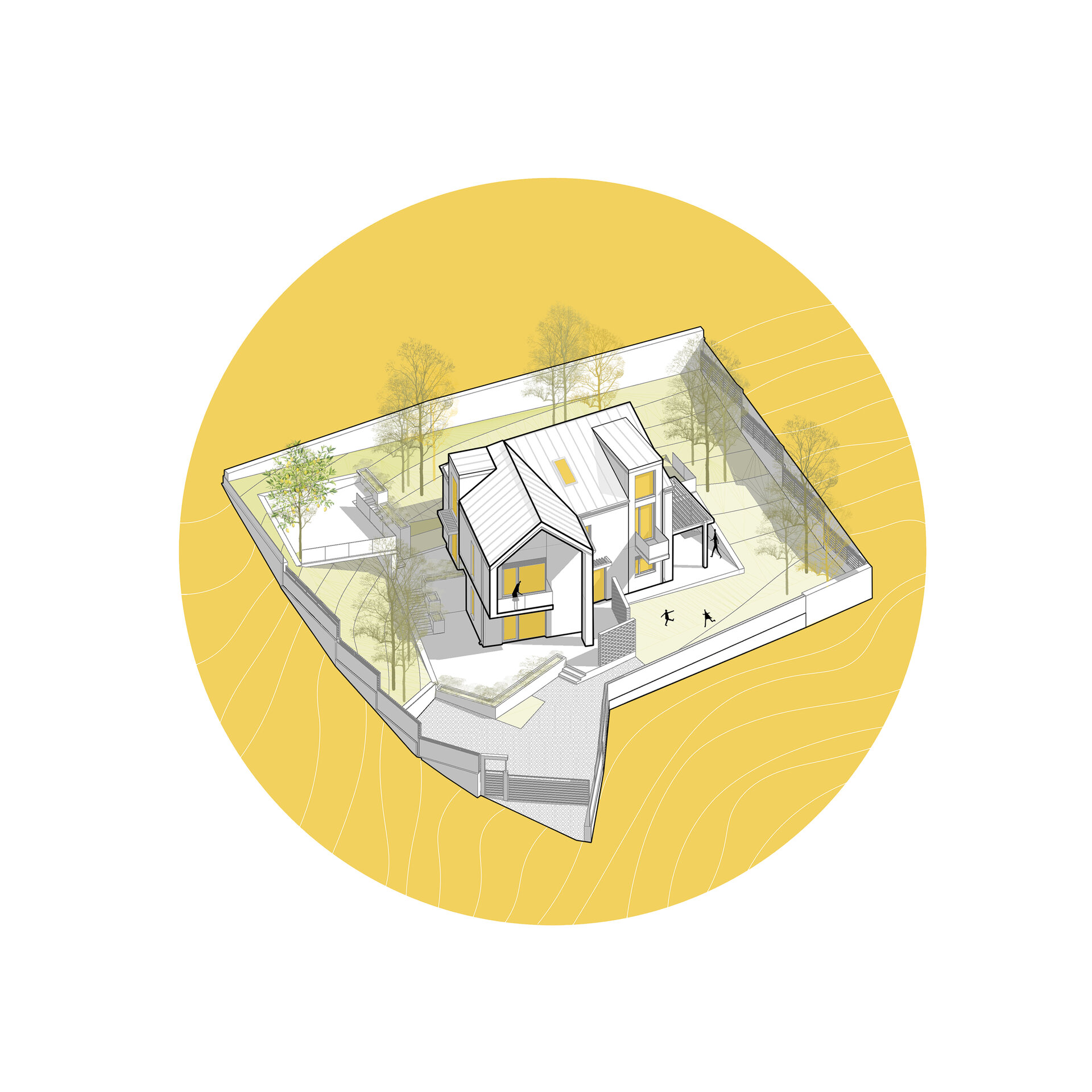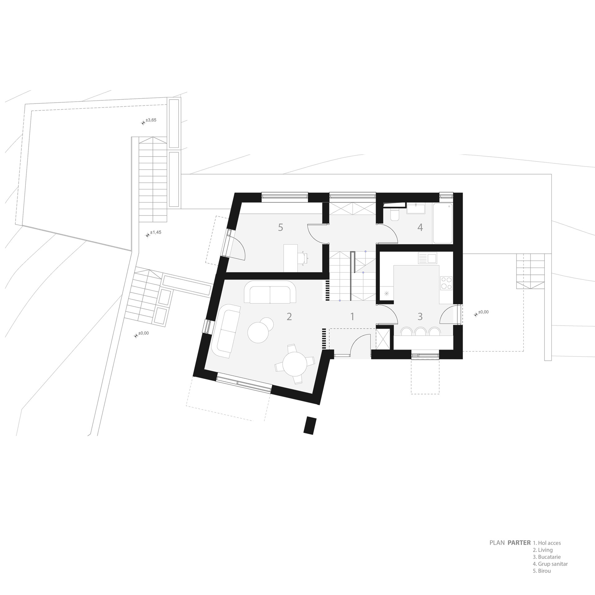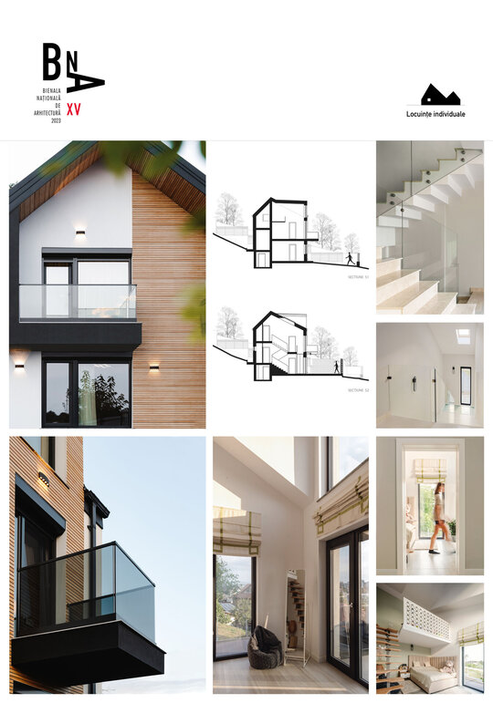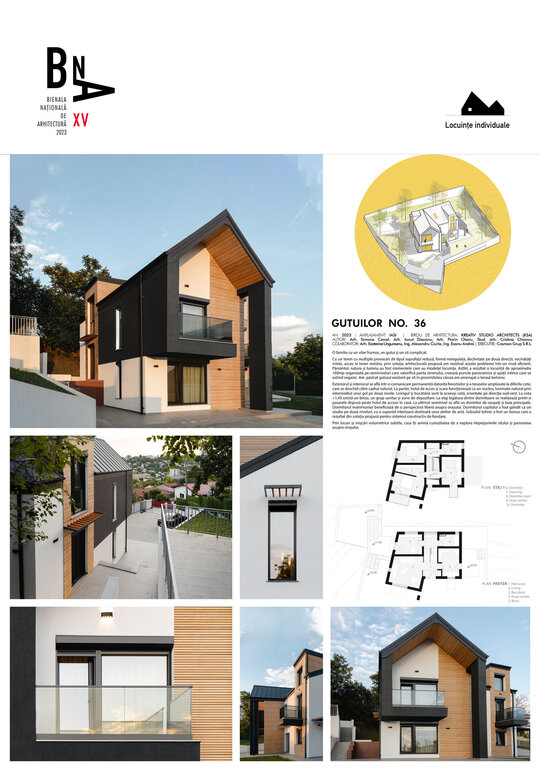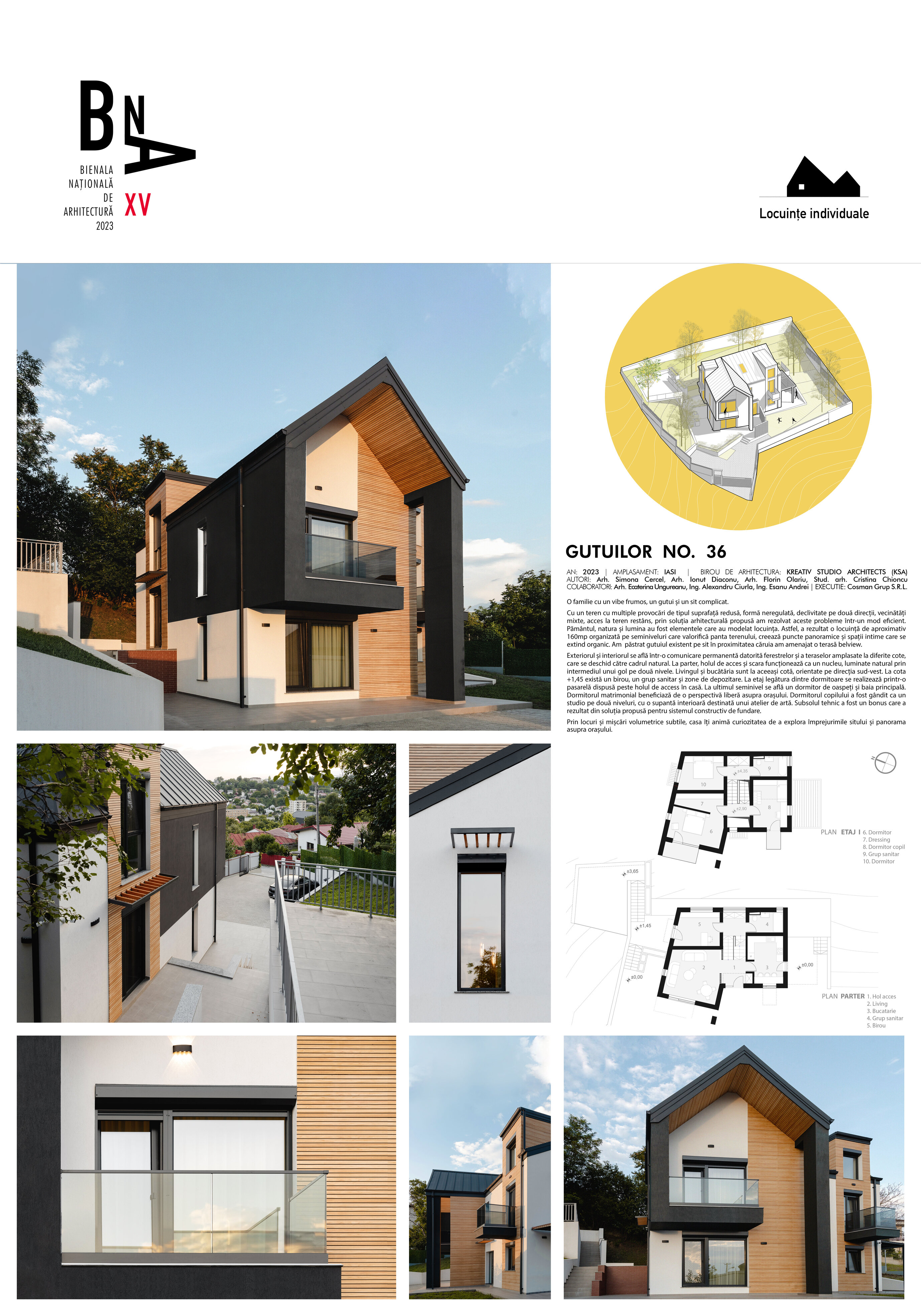 Cu un teren cu multiple provocări de tipul suprafață redusă, formă neregulată, declivitate pe două direcții, vecinătăți mixte, acces la teren restâns, prin soluția arhitecturală propusă am rezolvat aceste probleme într-un mod eficient. Pământul, natura și lumina au fost elementele care au modelat locuința. Astfel, a rezultat o locuință de aproximativ 160mp organizată pe seminiveluri care valorifică panta terenului, creează puncte panoramice și spații intime care se extind organic. Am păstrat gutuiul existent pe sit în proximitatea căruia am amenajat o terasă belview.