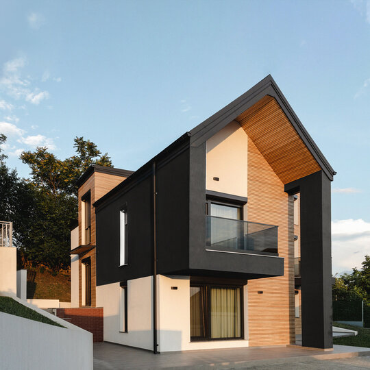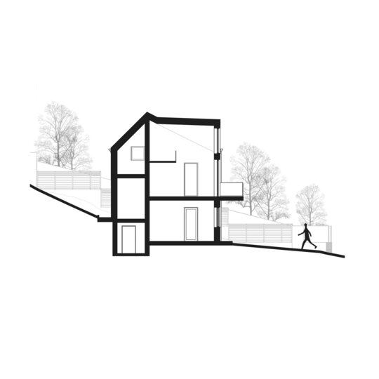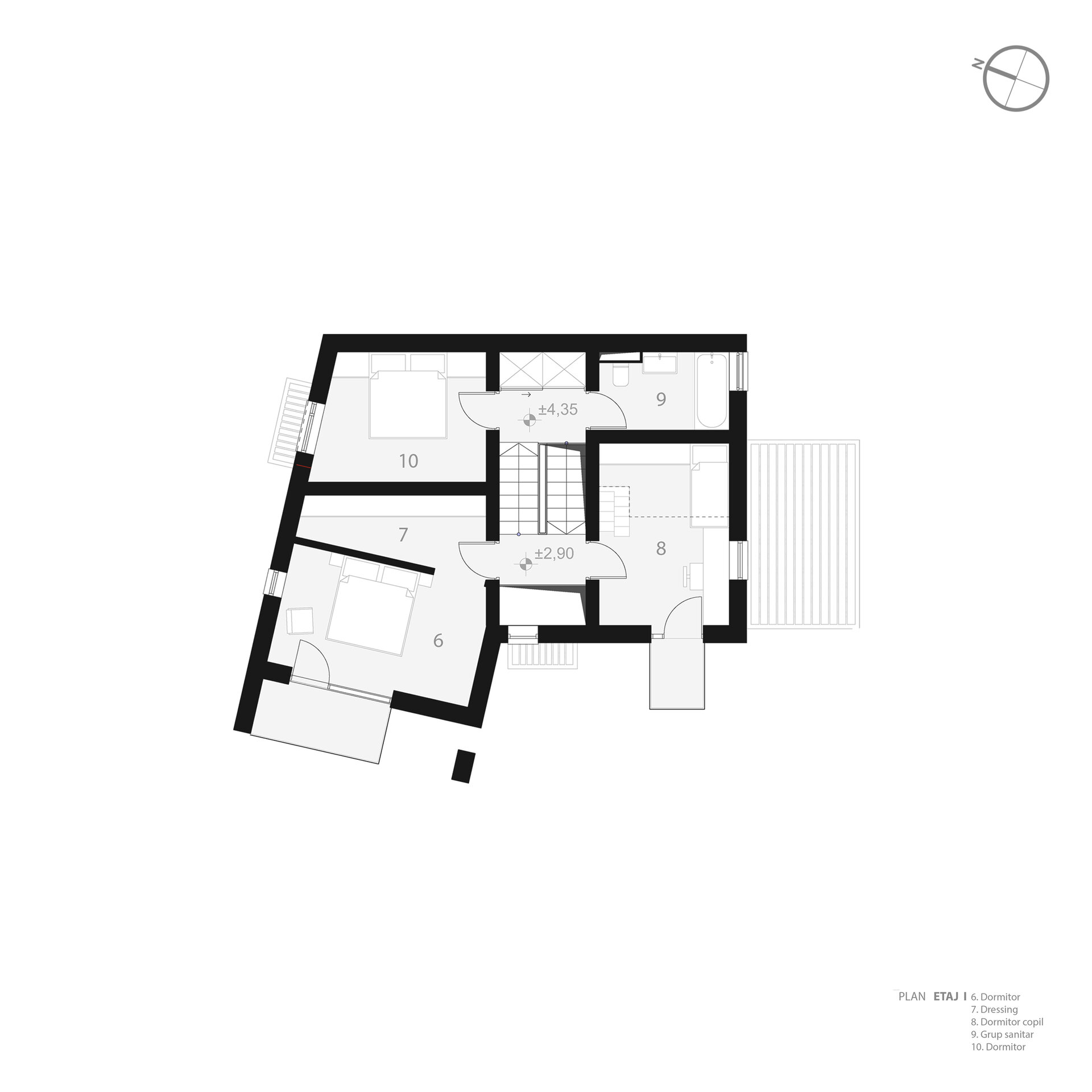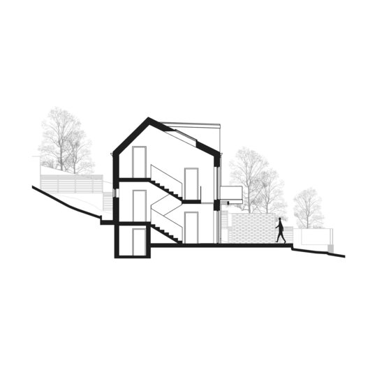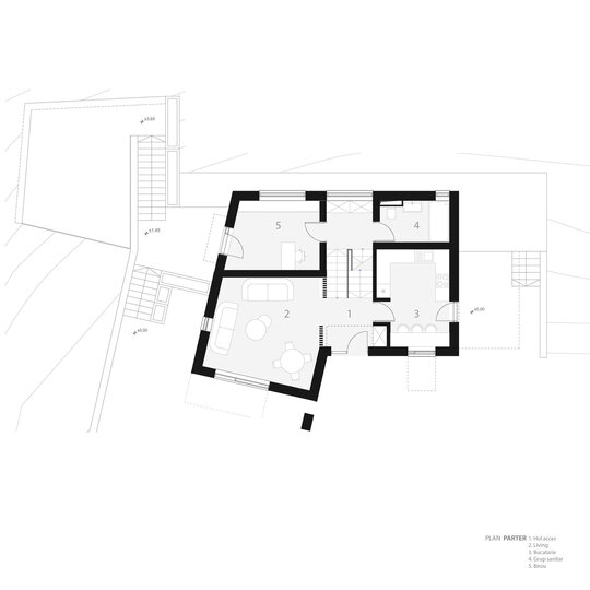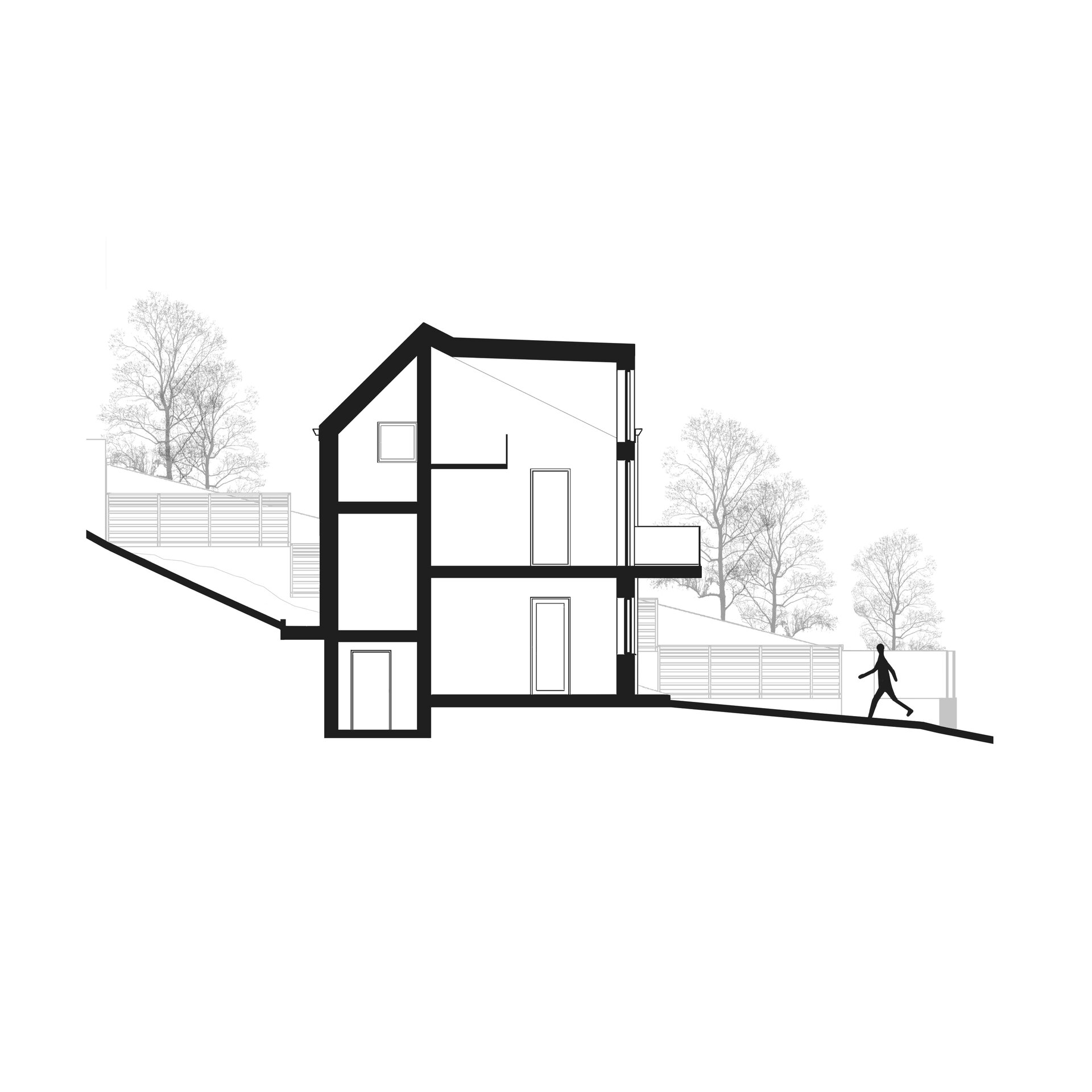 Cu un teren cu multiple provocări de tipul suprafață redusă, formă neregulată, declivitate pe două direcții, vecinătăți mixte, acces la teren restâns, prin soluția arhitecturală propusă am rezolvat aceste probleme într-un mod eficient. Pământul, natura și lumina au fost elementele care au modelat locuința. Astfel, a rezultat o locuință de aproximativ 160mp organizată pe seminiveluri care valorifică panta terenului, creează puncte panoramice și spații intime care se extind organic. Am păstrat gutuiul existent pe sit în proximitatea căruia am amenajat o terasă belview.