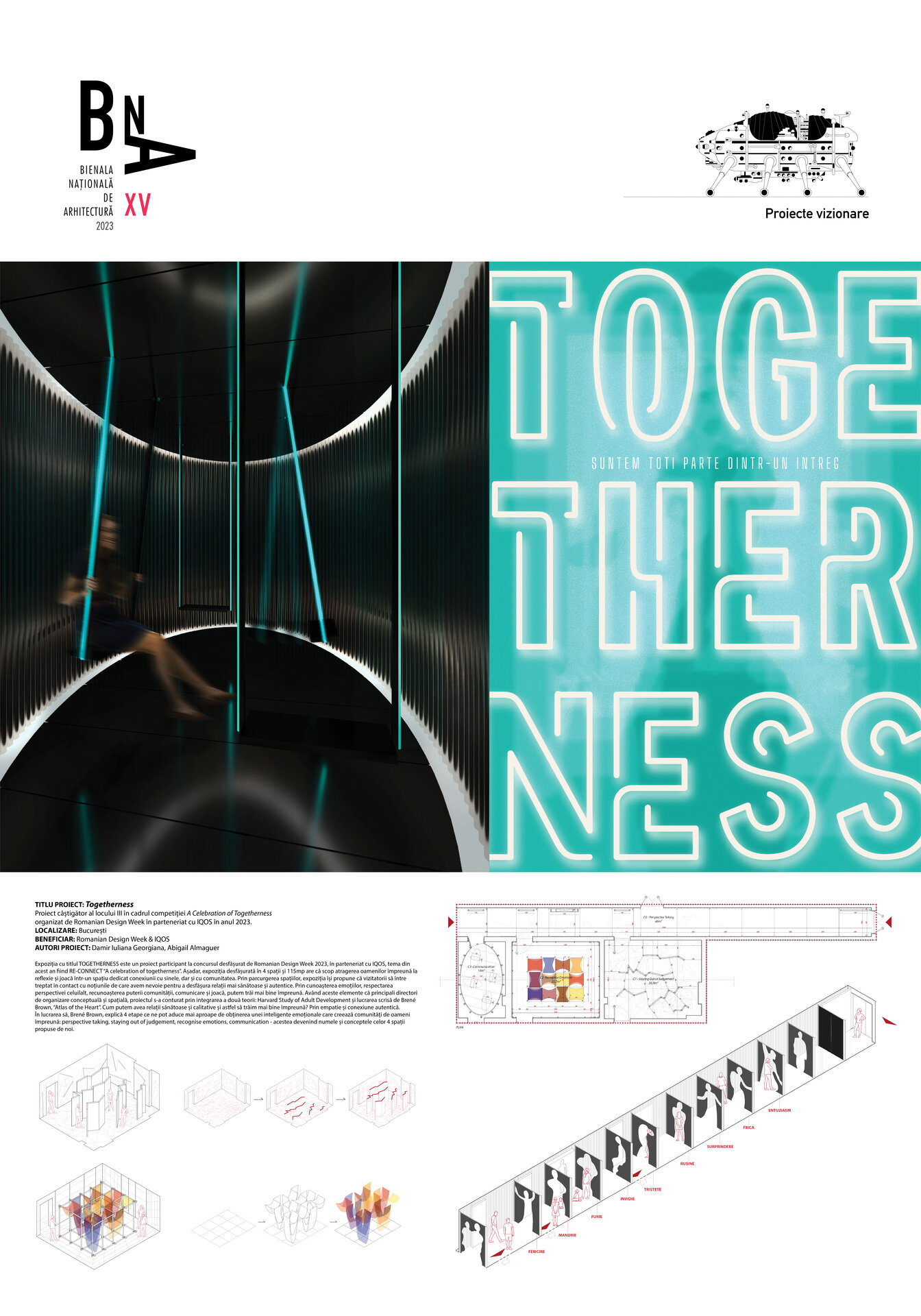 Expoziția cu titlul “TOGETHERNESS” este un proiectul câștigător al premiului III în competiția desfășurată de Romanian Design Week 2023, în parteneriat cu IQOS, tema din acest an fiind RE-CONNECT “A celebration of togetherness”. Așadar, expoziția desfășurată în 4 spații și 115mp are că scop atragerea oamenilor împreună la reflexie și joacă într-un spațiu dedicat conexiunii cu sinele, dar și cu comunitatea. Acest lucru este posibil doar prin înțelegerea felului în care funcționăm, a emoțiilor noastre, dar și cum interacționăm cu ceilalți într-un mod empatic și conștient. Având aceste elemente că principali directori de organizare conceptuală și spațială, proiectul s-a conturat prin integrarea a două teorii: Harvard Study of Adult Development și lucrarea scrisă de Brené Brown, “Atlas of the Heart”.