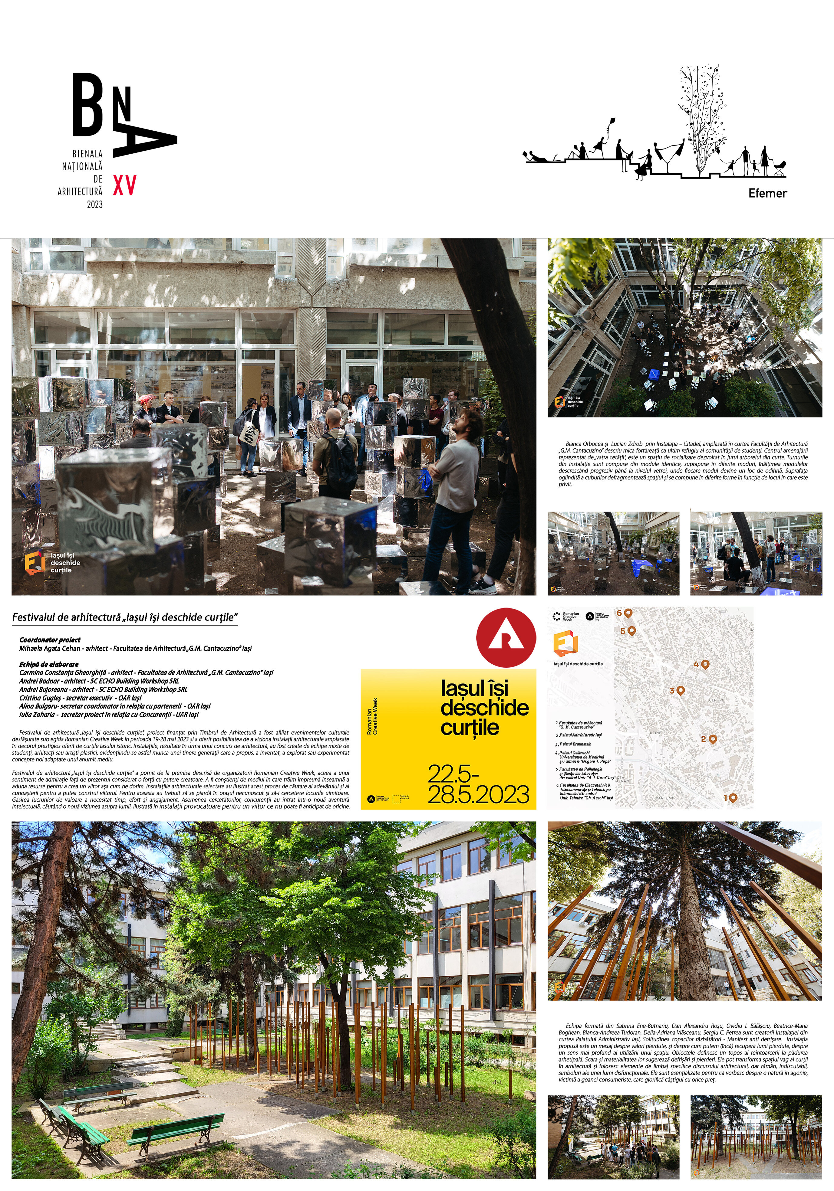 Festivalul de arhitectură „Iașul își deschide curțile”, proiect finanțat prin Timbrul de Arhitectură a fost afiliat evenimentelor culturale desfășurate sub egida Romanian Creative Week în perioada 18-29 mai 2023 și a oferit posibilitatea de a viziona instalații arhitecturale amplasate în decorul prestigios oferit de curțile Iașului istoric. Instalațiile, rezultate în urma unui concurs de arhitectură, au fost create de echipe mixte de studenți, arhitecți sau artiști plastici, evidențiindu-se astfel munca unei tinere generații care a propus, a inventat, a explorat sau experimentat concepte noi adaptate unui anumit mediu.