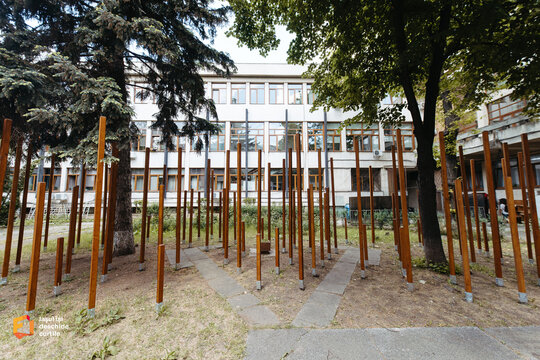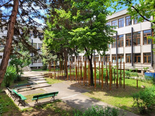Cadrul astfel creat concentrează simțurile spre instalația arhitecturală realizată, trecând dincolo de bariera vizuală și disipându-se în exteriorul curții prin muzică. Instalația se compune din trei elemente: o pianină ca loc de întâlnire, zone de loisir pentru ascultarea muzicii și o rețea de baloane suspendată, ca element indicator de orientare. Spațiul participativ din jurul pianinei ca punct de întâlnire vorbește în ritmul muzicii, dar și prin alte limbaje inscripționate pe suprafața platformei acesteia. Alfabetul Braille, texte descriptive sau diferite diagrame gravate explică conceptul instalației arhitecturale, ca punct de interes, de adunare și ținere împreună în această curte transformată într-un cadru ocrotitor.