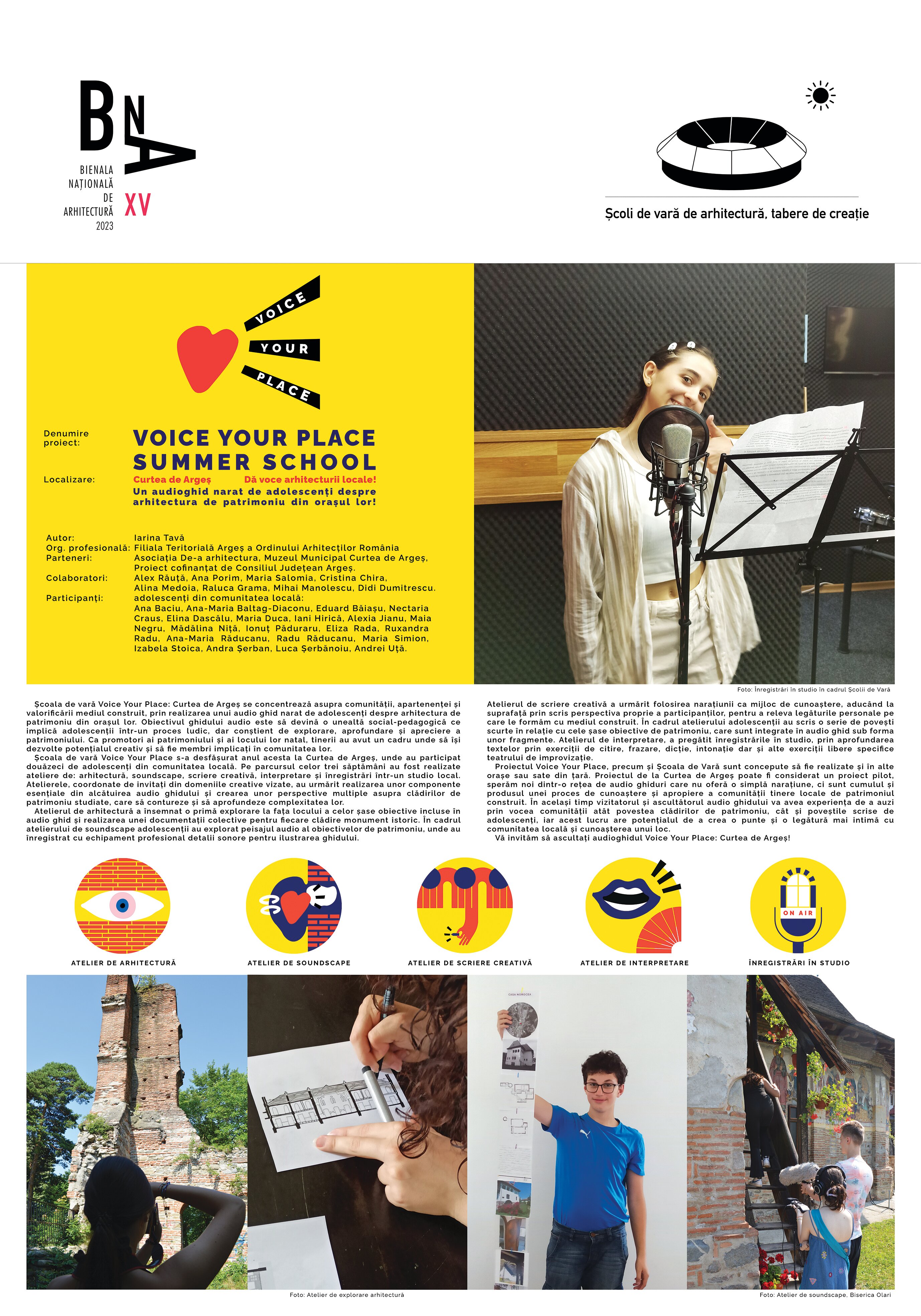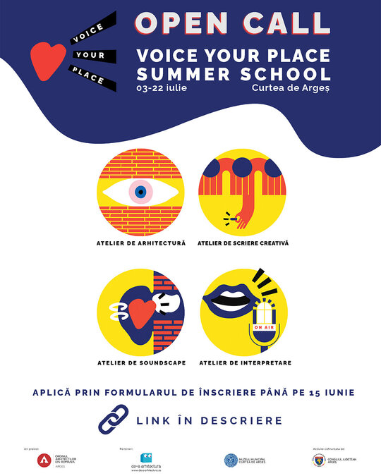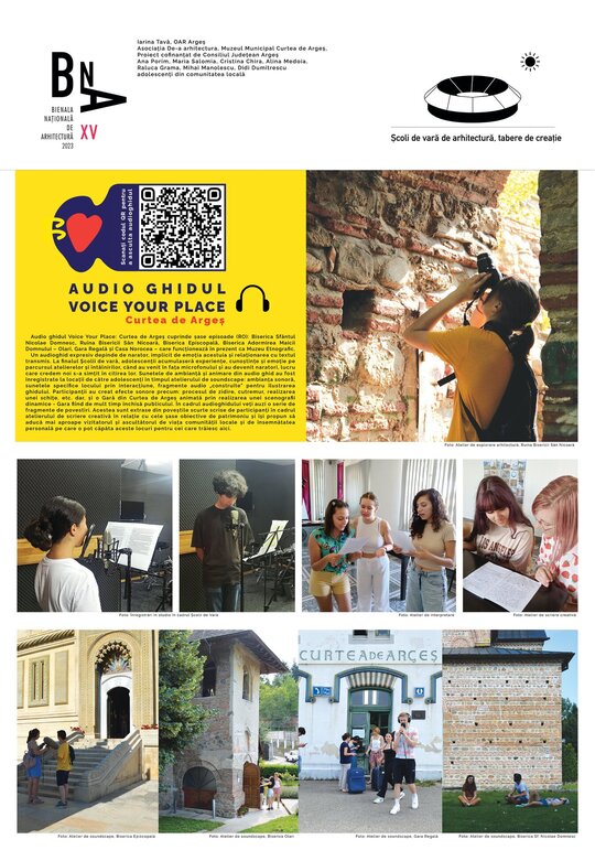 Școala de vară Voice Your Place s-a desfășurat anul acesta la Curtea de Argeș, în luna iulie, unde au participat douăzeci de adolescenți din comunitatea locală. Pe parcursul celor trei săptămâni au fost realizate ateliere de: arhitectură, soundscape, scriere creativă, interpretare și înregistrări într-un studio local. Atelierele, coordonate de invitați din domeniile creative vizate, au urmărit realizarea unor componente esențiale din alcătuirea audio ghidului, dar și crearea unor perspective multiple asupra clădirilor de patrimoniu studiate, care să contureze și să aprofundeze complexitatea lor. Școala de vară a creat contextul prin care adolescenții au învățat aplicat și creativ să-și cerceteze, aprecieze și promoveze orașul. În același timp, fiind în anii formatori, Școala de Vară a deschis posibilitatea unui efect pozitiv în orientarea tinerilor către anumite domenii creative și meserii, contribuind la valorizarea de sine și apropiere culturală.